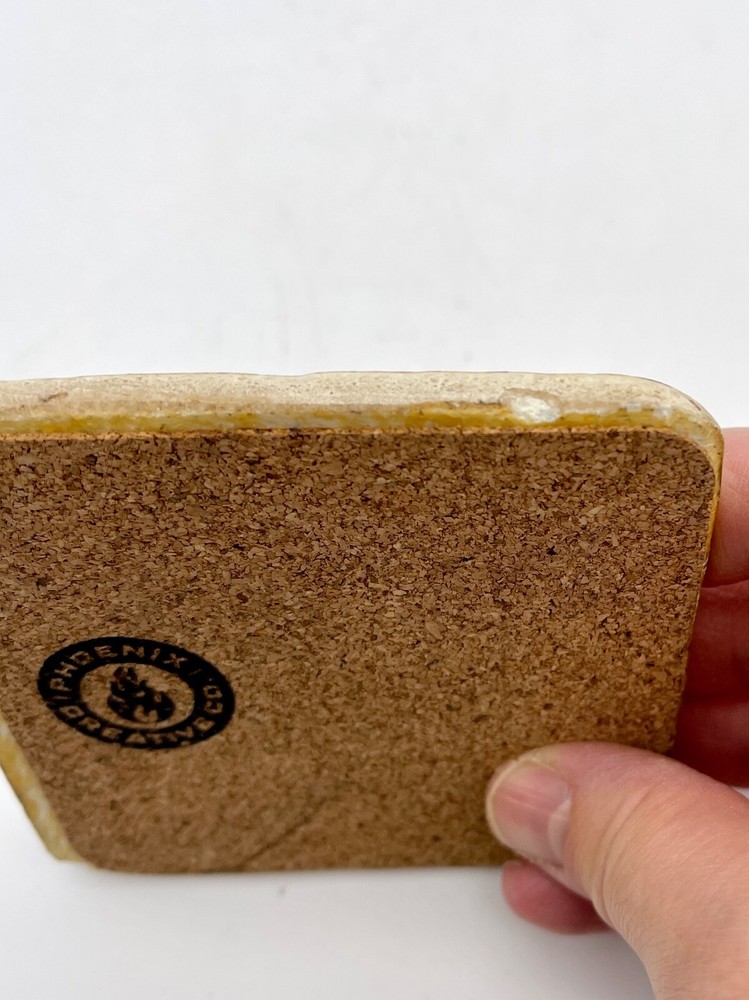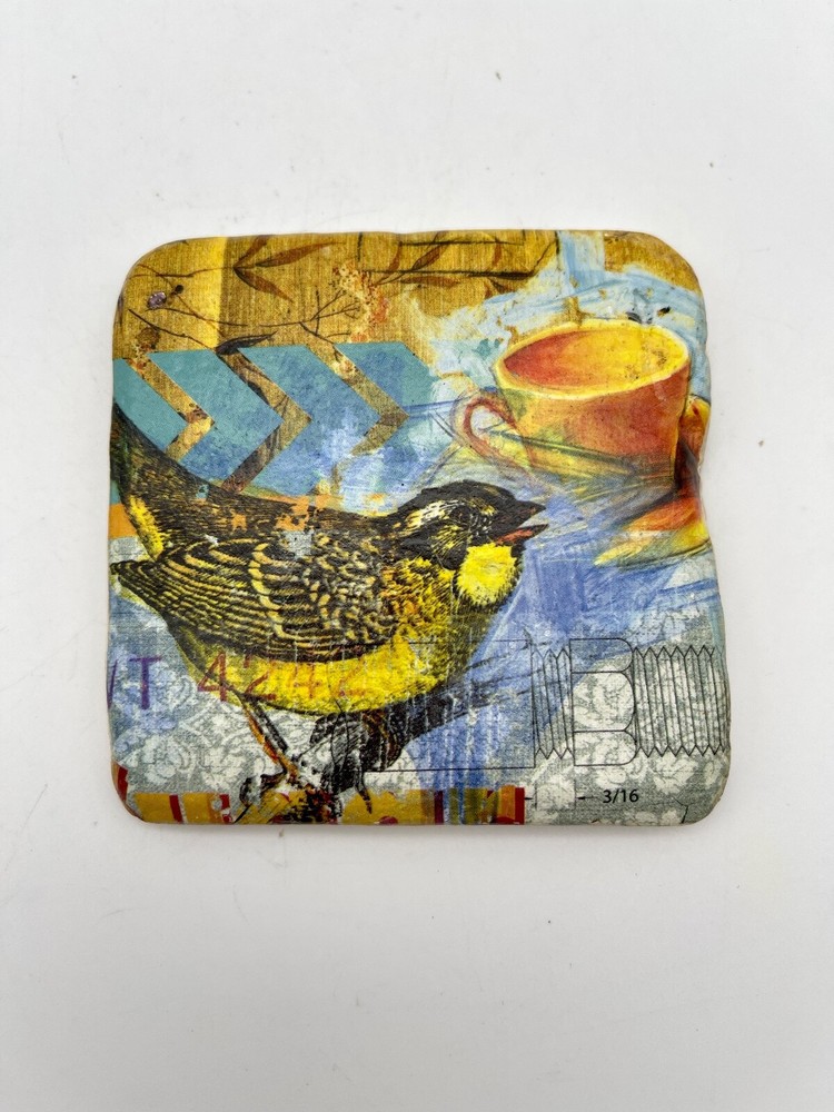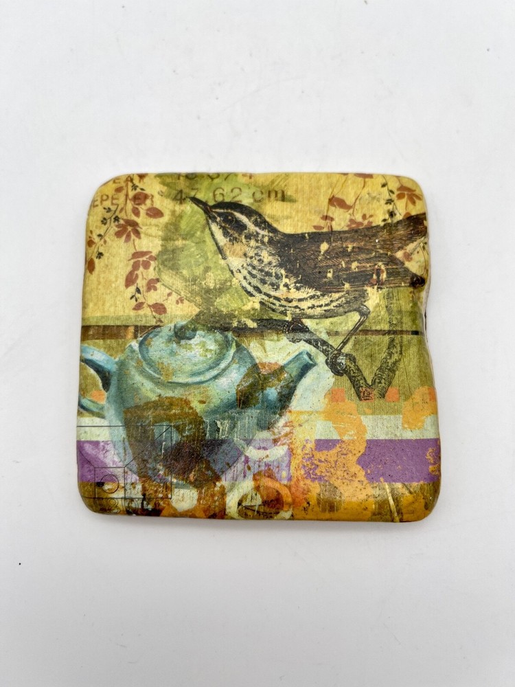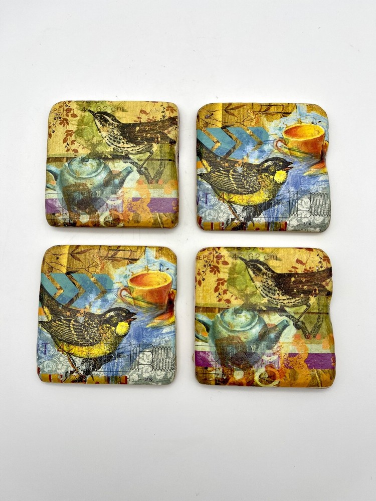 Set of 4 Phoenix Creative Co-op Tumbled Ceramic Tile Decoupage Coasters Birds These are a tumbled tile so the surface is uneven. One tile has a small chip on the edge - see last photo. Coasters measure approximately 3.75 inches x 3.75 inches.