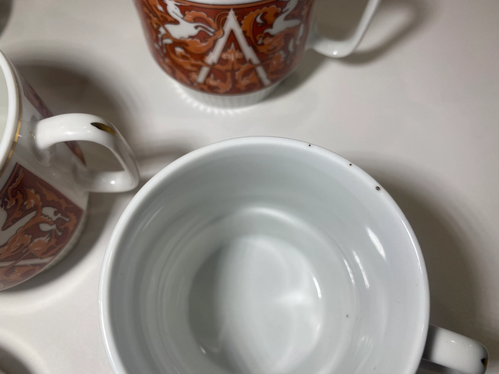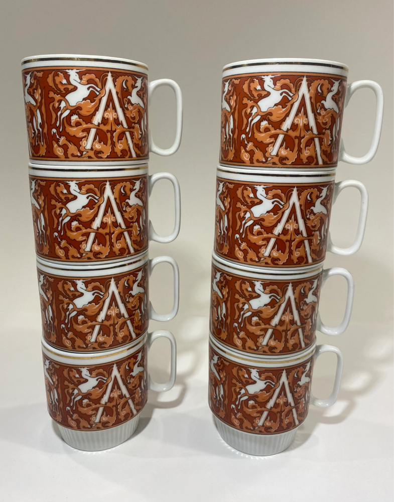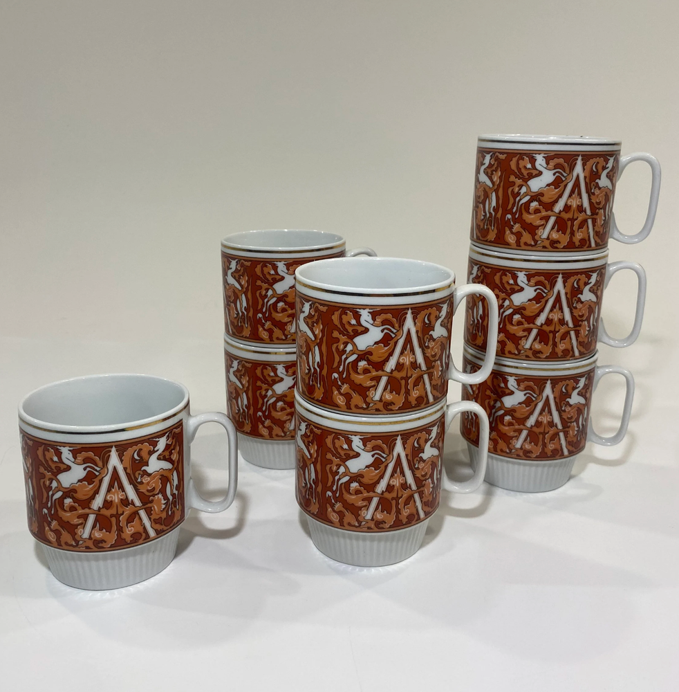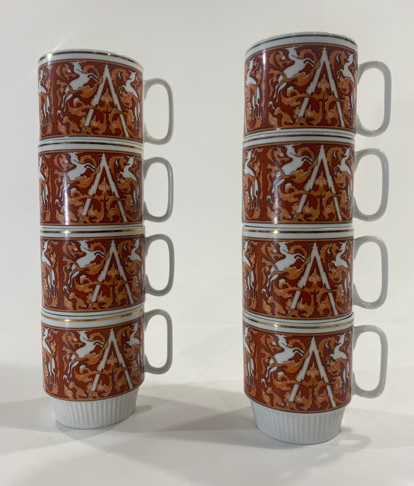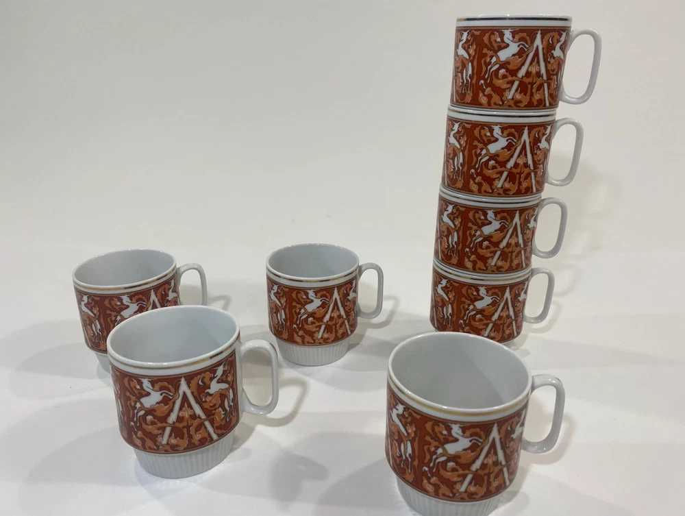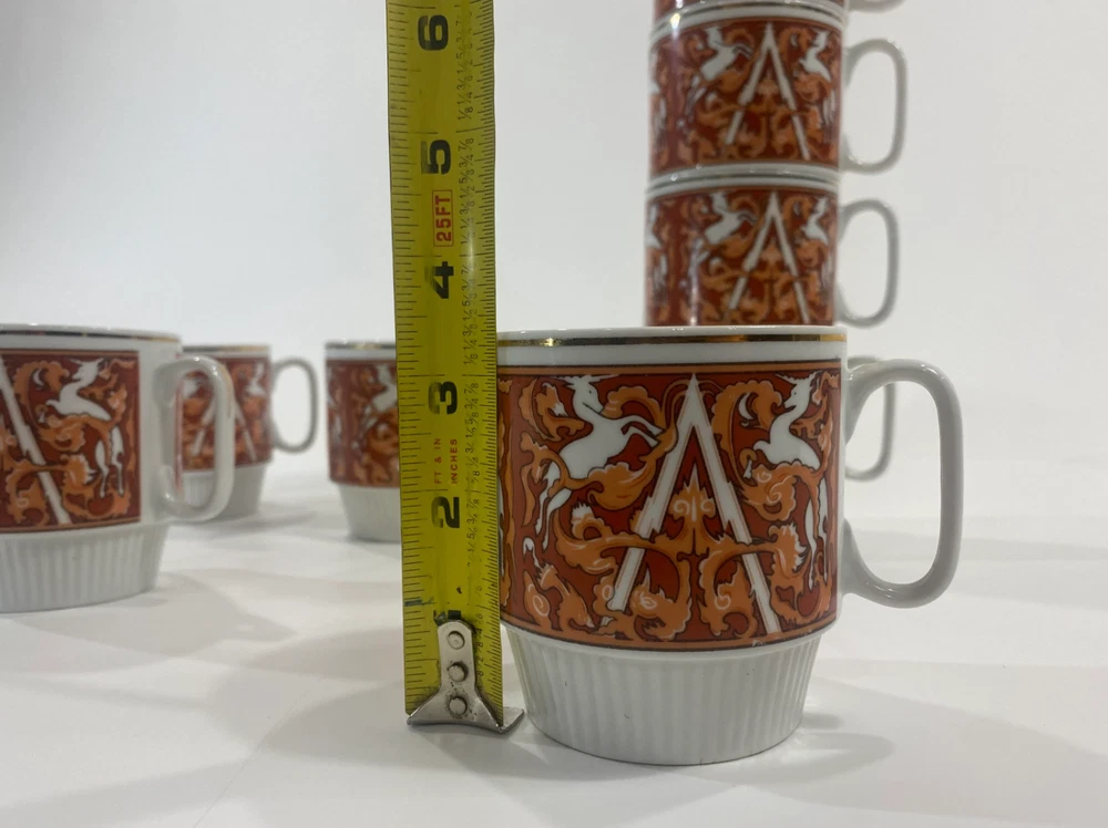 Set of 8 mid-century modern (MCM) Unicorn stacking coffee mugs in white with orange accents. Made in China Tapestry style, these mugs stand just under 3.5" tall. One cup has a few black specks on the rim (likely a factory flaw), while the others are in great condition. A stylish and functional addition to any coffee collection! Shipping& Handling We ship within 4 business days after receipt of the payment. Each item is packed carefully to make sure it gets to you in excellent condition. We always update you with a tracking number. We ship to most parts of the world, excluding countries with bad postal track records. Additional shipping charges may apply when shipping to remote locations, P.O. Boxes, Maritime Provinces and Territories. Payment Info. We will only ship to the address on the account. We do collect sales tax in applicable Canadian provinces. Terms Of Sale -Buyers are responsible for import fees and customs fees if they apply -All electronics in this store are designed for Canadian power outlets. Items are mostly used, buyer is responsible to monitor all electronics to ensure they are not a fire hazard. -Please be sure that what you are ordering is allowed to be imported into your country. Please make sure to read the item descriptions and view photos diligently before purchase. **PLEASE COMMUNICATE WITH US IF YOU HAVE ISSUES AND CONCERNS ABOUT YOUR PURCHASE SO WE CAN ASSIST YOU.**