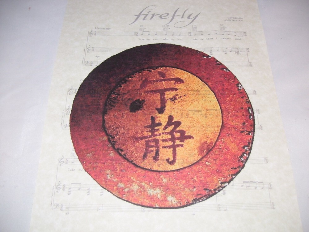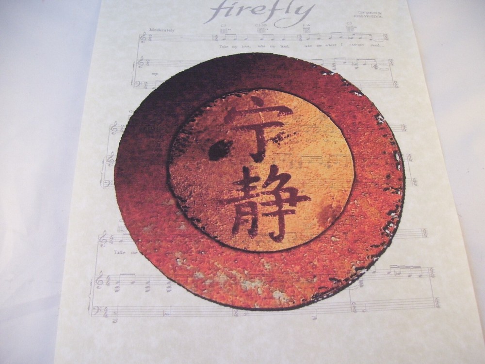 FIREFLY by JOSS WHEDON FRAMEABLE SHEET MUSIC This sheet is in excellent condition. Measures 8.5" by 11". Will frame nicely, a great addition to your collection! SHELF 11 Will email additional photos at your request. Insurance and delivery confirmation is included in your domestic shipping charge. We use biodegradable bubble wrap and packing peanuts with our fragile items to insure safe shipping. Will combine shipping on multiple purchases whenever possible to save you money! Please check my auctions and store frequently, as I am always listing fresh merchandise! Remember to visit my store, Our Vintage Treasures! Thanks and happy bidding! Check out my other items ! Be sure to add me to your favorites list ! International Buyers - Please Note: Import duties, fees, taxes and customs charges are not included in the item price or shipping cost. These charges are the buyer's responsibility. Please check with your country's customs office to determine what these additional costs, if any, will be prior to bidding or buying. Thanks!