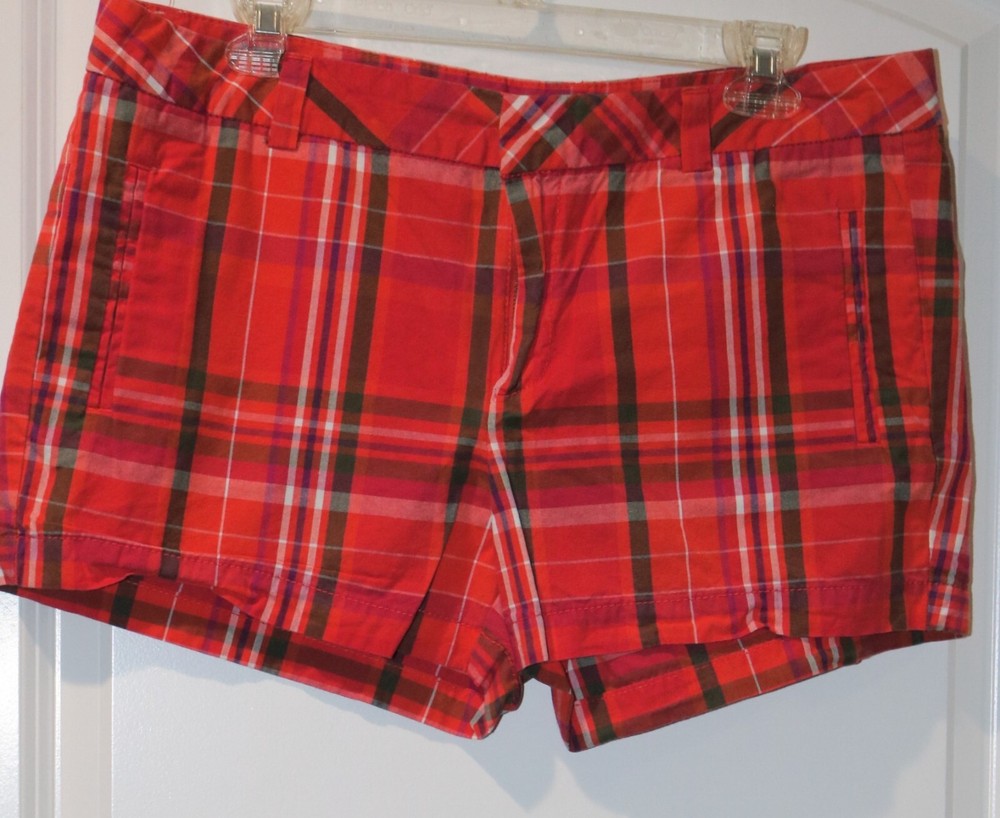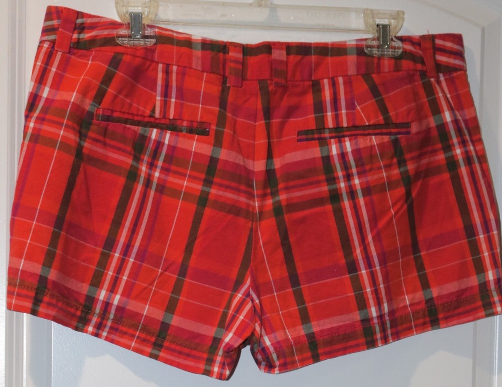 Women's Shorts Brand is JCP Size 12P Orange, Red, Green and White Plaid 100% Cotton, Hook and zip Up Front, Pockets, Mid Rise, Belt Loops, Waist is 36", Inseam is 3", Rise is 10" Excellent Condition Please email with any questions
