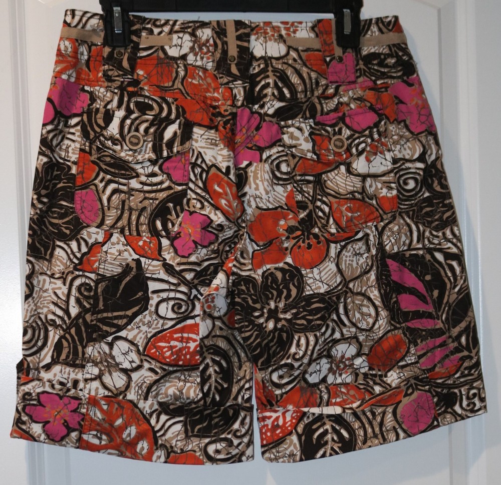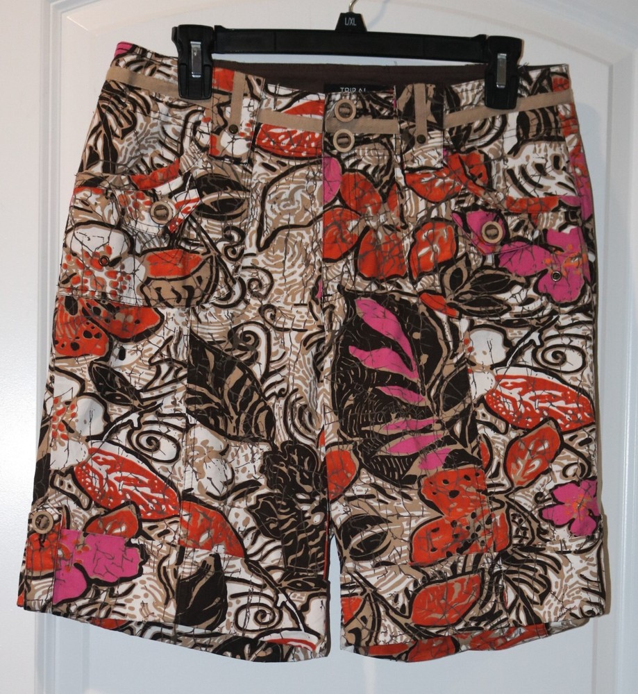 Women's Shorts Brand is Tribal Size 8 Brown, Orange, Pink and White Print 100% Cotton Button and Zip in front, Front and Back Pockets, Mid Rise, Cuffs, Belt Loops Waist is 32", Inseam is 10", Rise is 9 1/2" Excellent Condition Please email with any questions