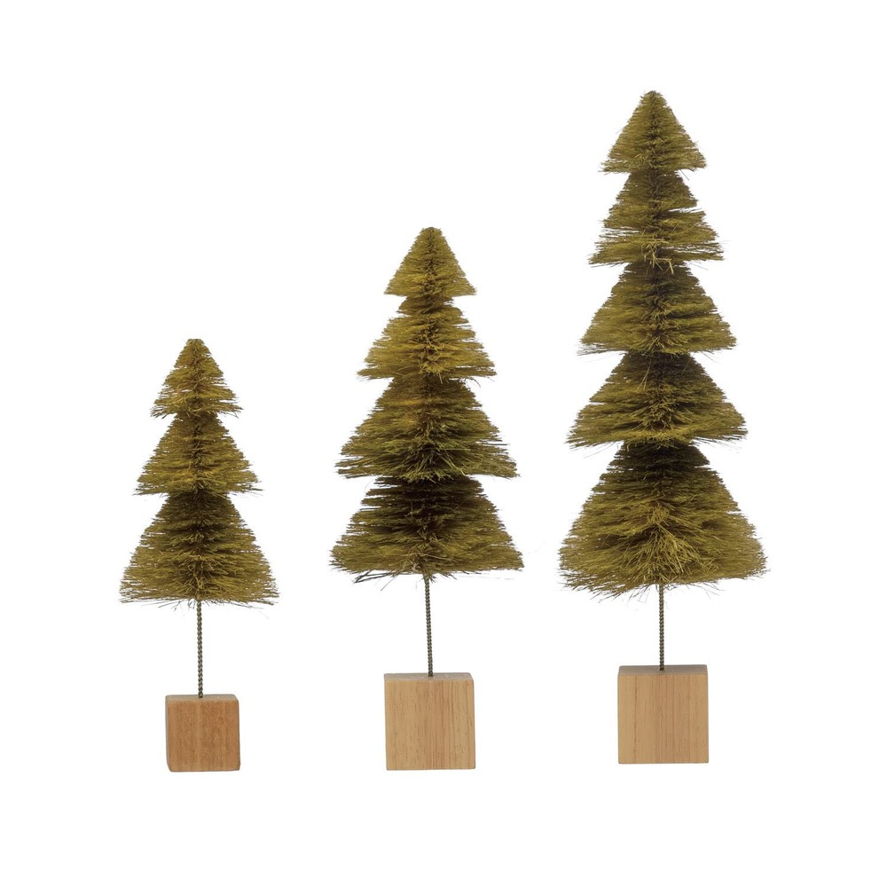 Our "Foraged Holiday" collection will transform your home into an enchanting holiday cottage; Curate a seasonal display that showcases whimsical images and found silhouettes. Add a touch of whimsical holiday cheer to any seasonal display with our masterfully crafted figurines featuring a wide array of beloved silhouettes. Sisal Bottle Brush Tree Green Ombre Color; Wood Base; ; Boxed Set Of 4 80% Sisal, 10% Wire, 10% Schima This Holiday Piece Shines In Eclectic, Boho, And Vintage Décor Styles 3.5 in L x 3.5 in W x 9.5 in H