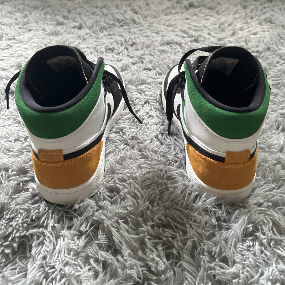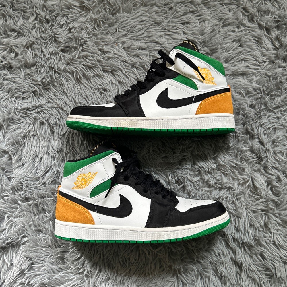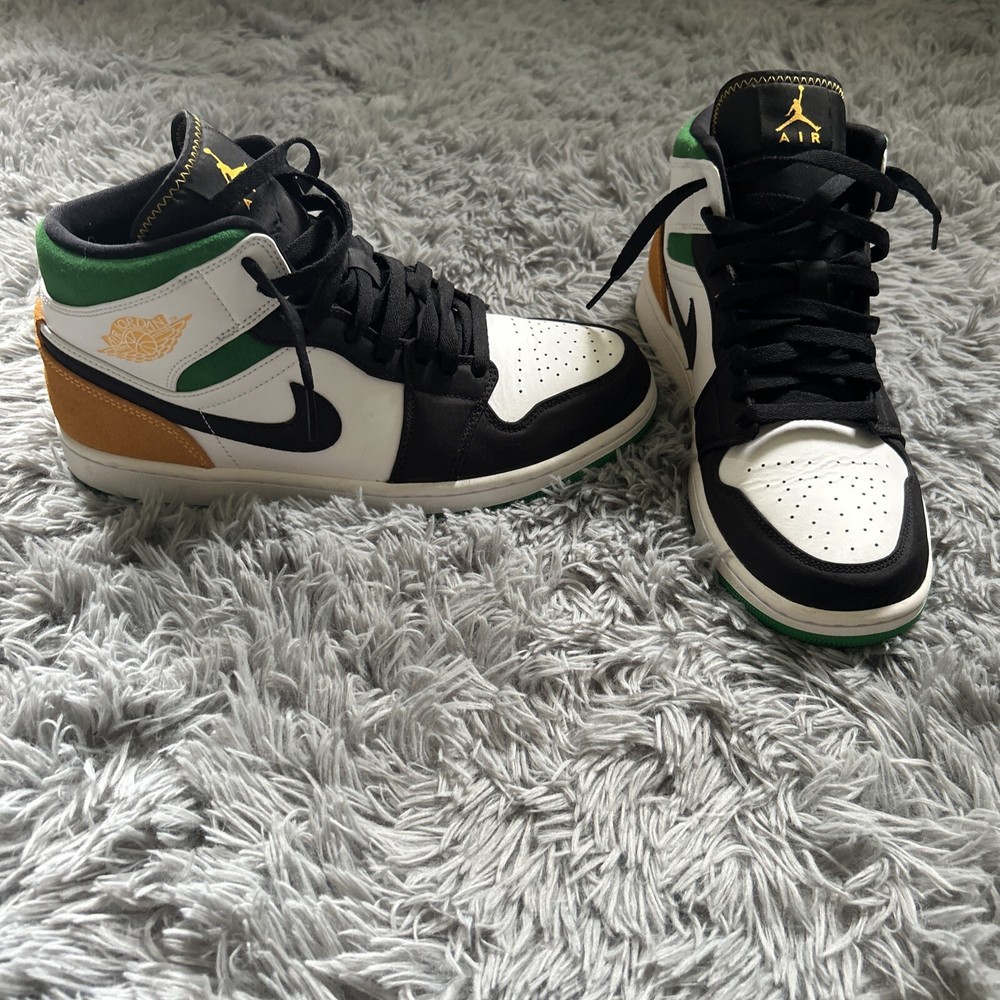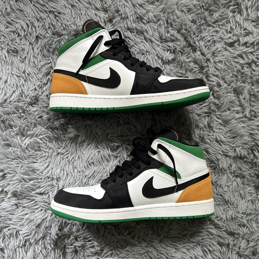 This is a pair of Air Jordan 1 SE Mid Oakland sneakers in size 10. The shoes feature a white, laser orange, black, and lucky green color scheme, with a mid-top shoe shaft style. The style code for these sneakers is 852542-101, and they were released on October 9th, 2020. These athletic shoes are perfect for men who want to add a stylish and comfortable sneaker to their collection. The Air Jordan 1 SE Mid Oakland sneakers are part of the Air Jordan product line, and they have a unique nickname.
