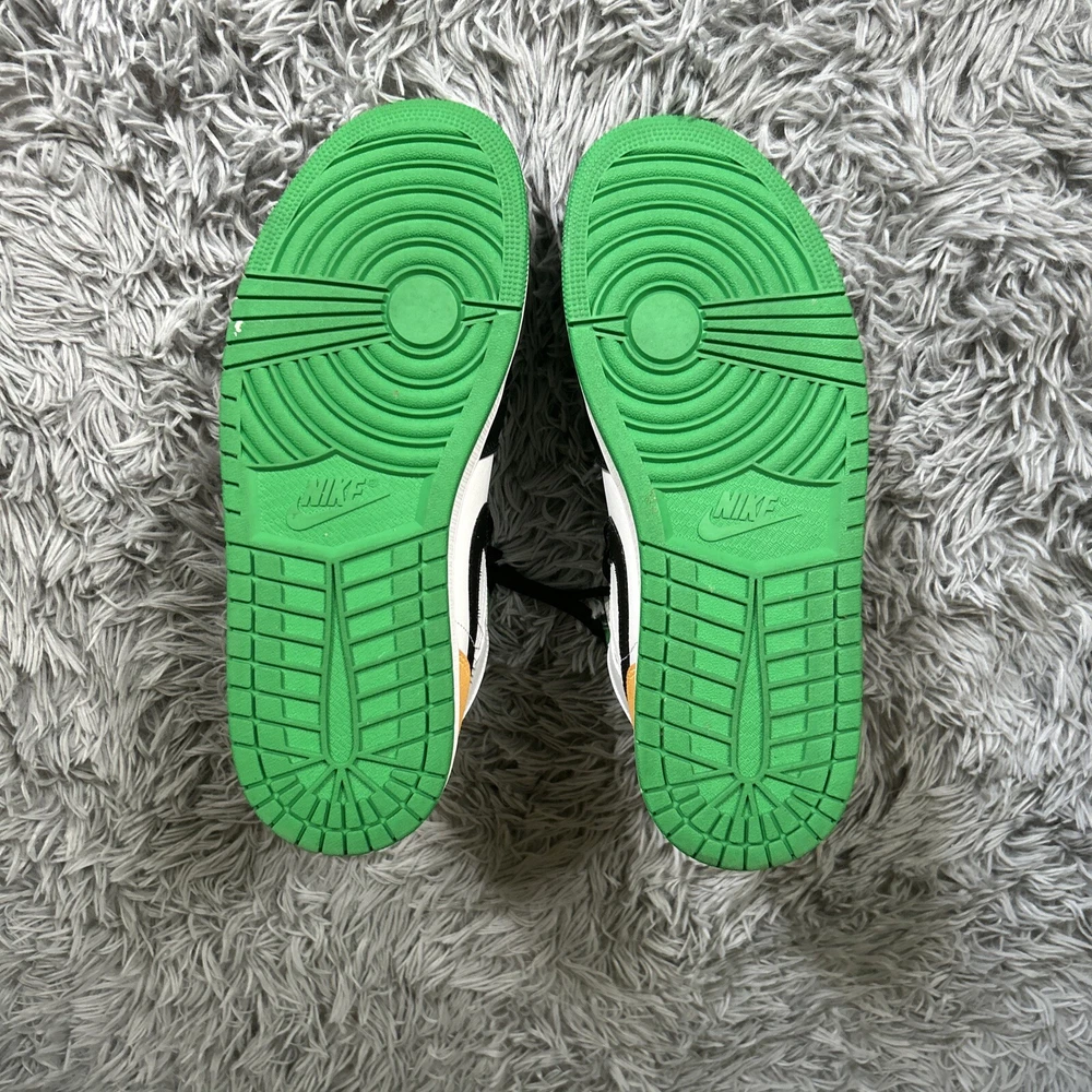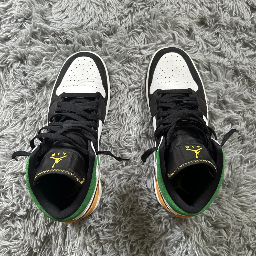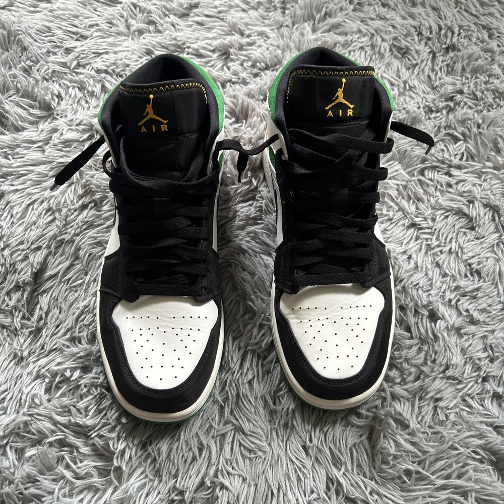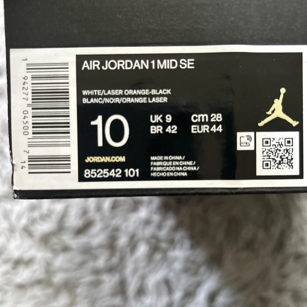 This is a pair of Air Jordan 1 SE Mid Oakland sneakers in size 10. The shoes feature a white, laser orange, black, and lucky green color scheme, with a mid-top shoe shaft style. The style code for these sneakers is 852542-101, and they were released on October 9th, 2020. These athletic shoes are perfect for men who want to add a stylish and comfortable sneaker to their collection. The Air Jordan 1 SE Mid Oakland sneakers are part of the Air Jordan product line, and they have a unique nickname.