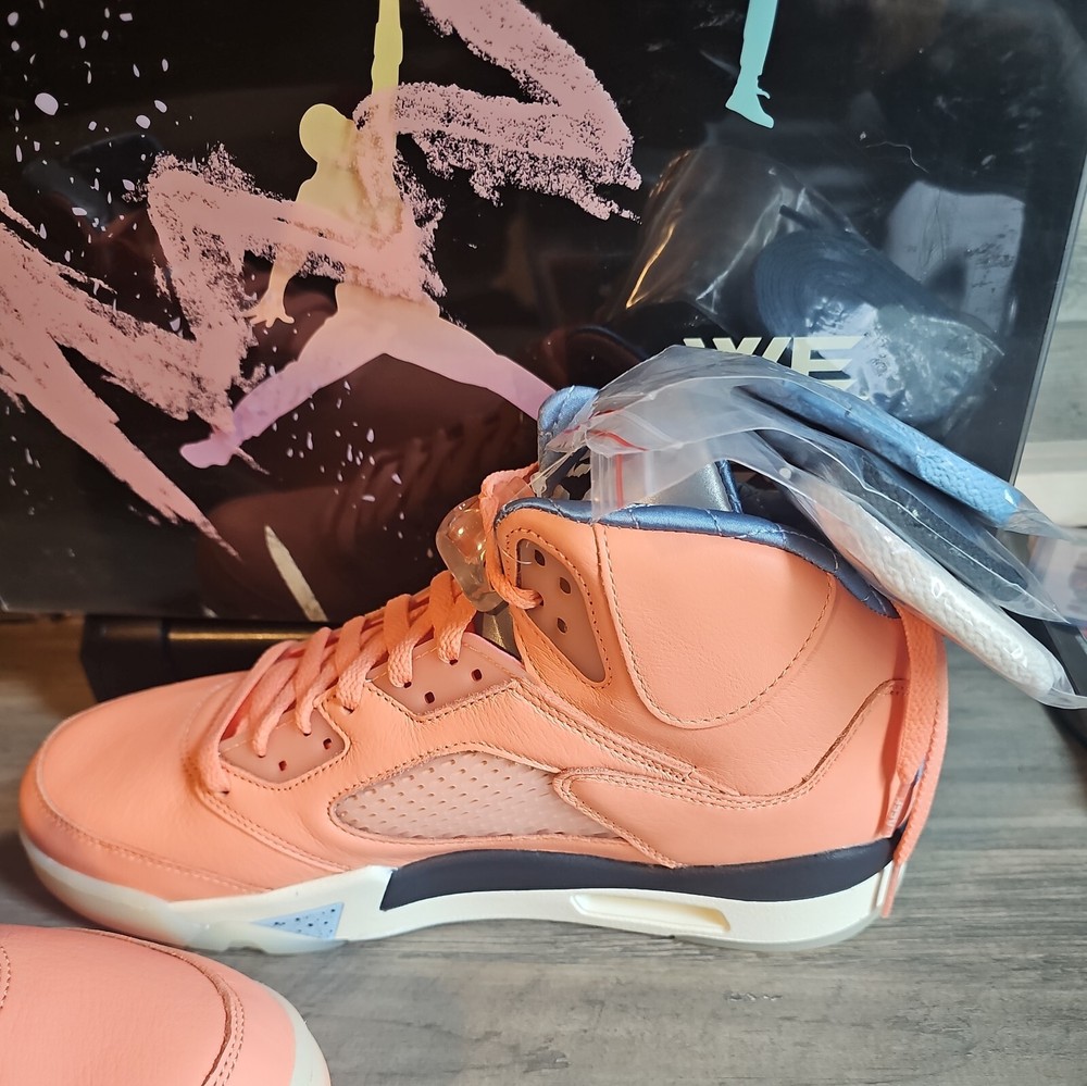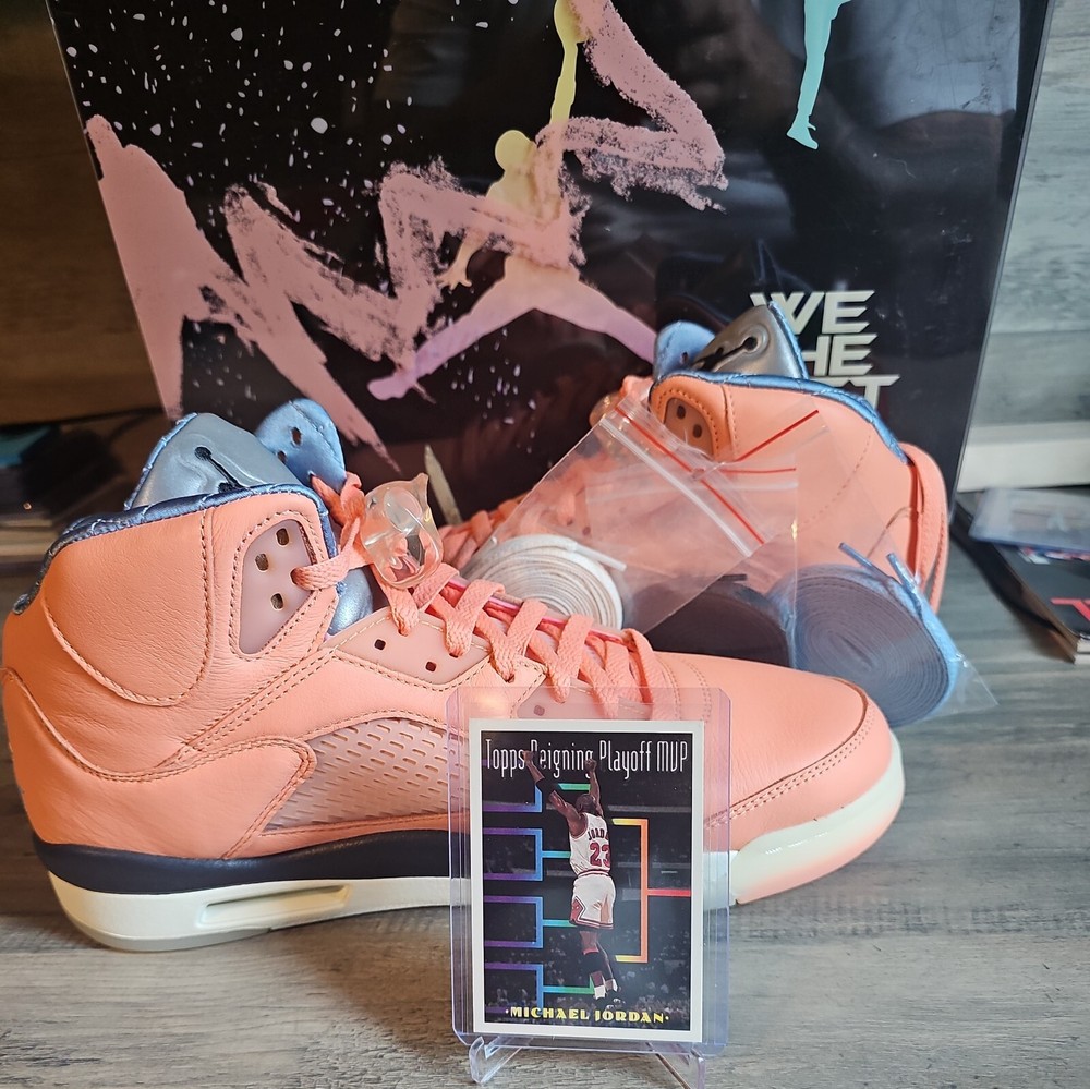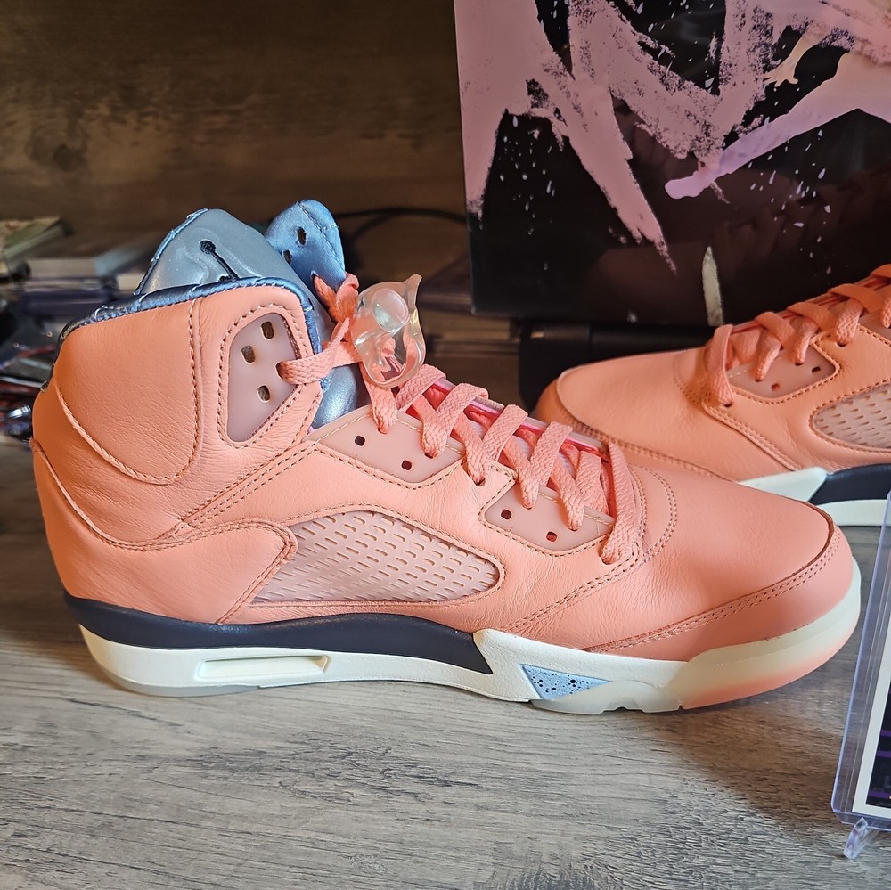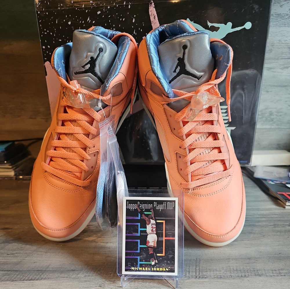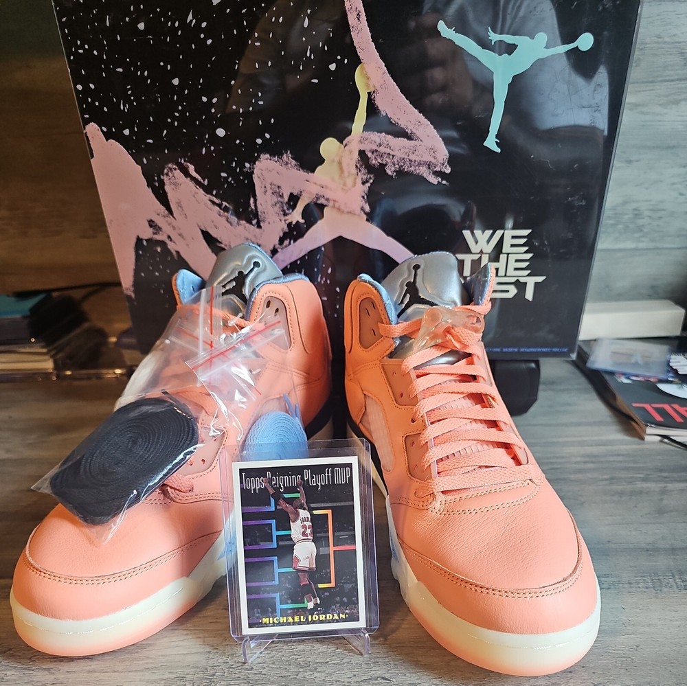Elevate your sneaker game with the Jordan 5 Retro x DJ Khaled Mid We The Best - Crimson Bliss/MJ Card. This stylish and highly sought-after sneaker boasts a mid-top shoe shaft style and features a striking crimson bliss/leche blue/sail color combination. The orange accents on the shoe add a pop of color that will make you stand out from the crowd. Crafted with quality materials, this athletic sneaker is designed to provide comfort and support for your feet. With its collaboration with DJ Khaled, this sneaker is perfect for anyone who wants to make a statement with their footwear. Don't miss out on the chance to own a pair of these exclusive Air Jordan 5 Retro sneakers.