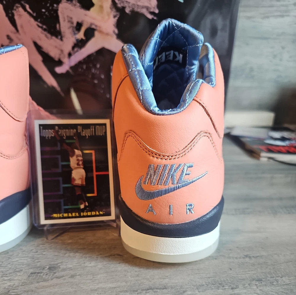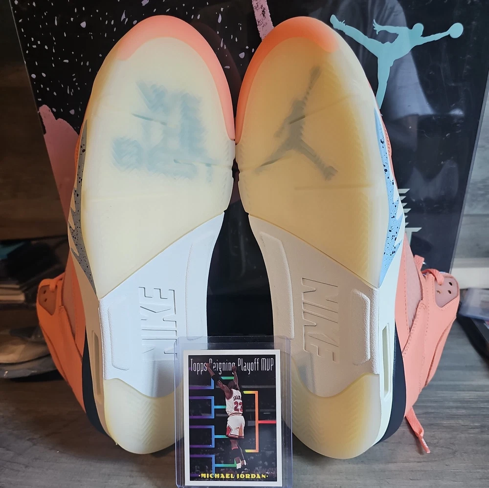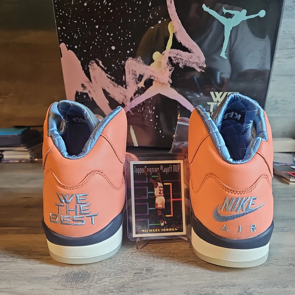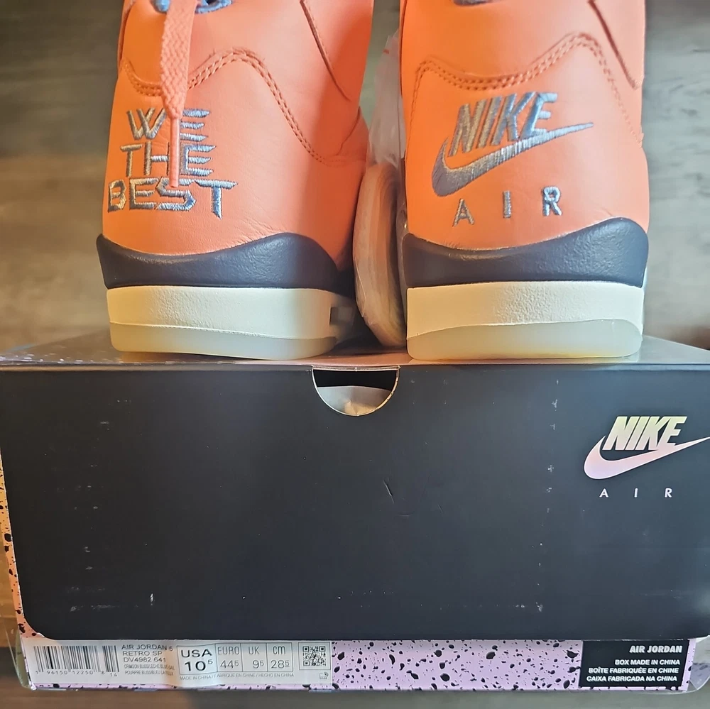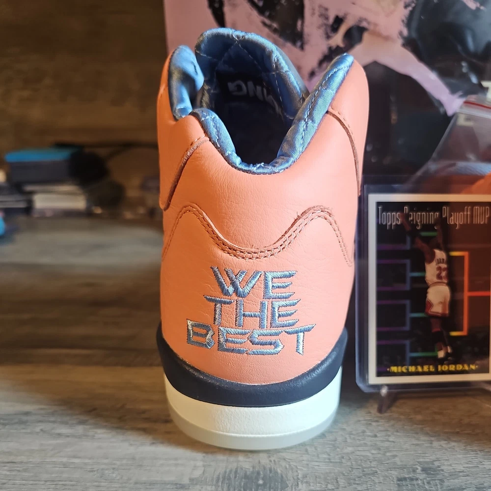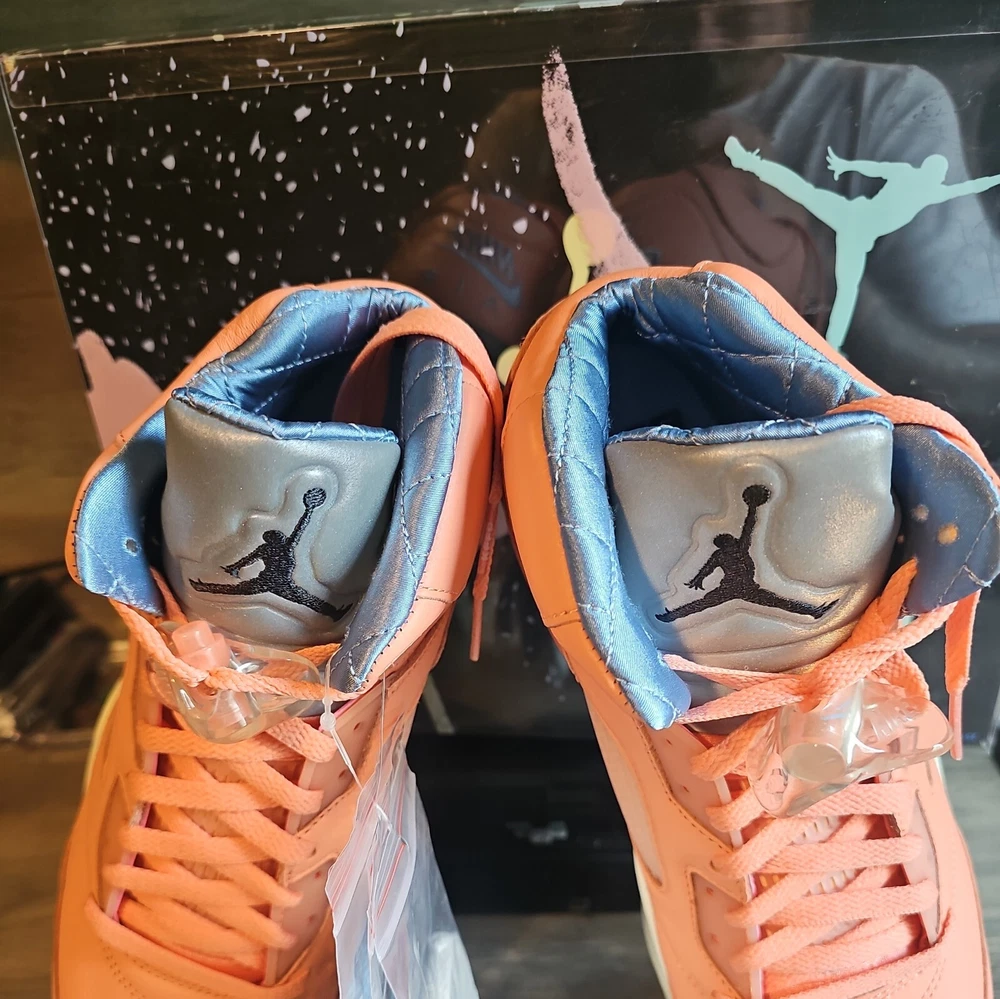 Elevate your sneaker game with the Jordan 5 Retro x DJ Khaled Mid We The Best - Crimson Bliss/MJ Card. This stylish and highly sought-after sneaker boasts a mid-top shoe shaft style and features a striking crimson bliss/leche blue/sail color combination. The orange accents on the shoe add a pop of color that will make you stand out from the crowd. Crafted with quality materials, this athletic sneaker is designed to provide comfort and support for your feet. With its collaboration with DJ Khaled, this sneaker is perfect for anyone who wants to make a statement with their footwear. Don't miss out on the chance to own a pair of these exclusive Air Jordan 5 Retro sneakers.