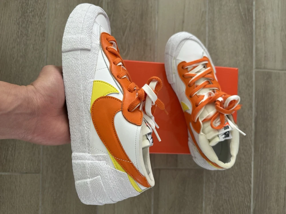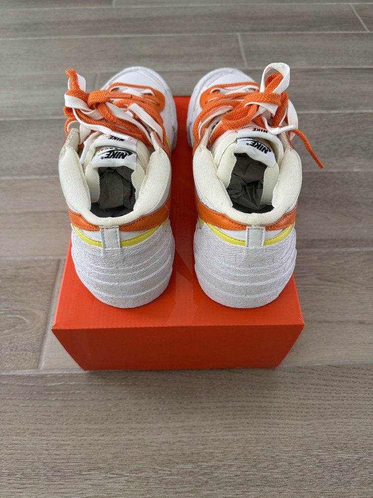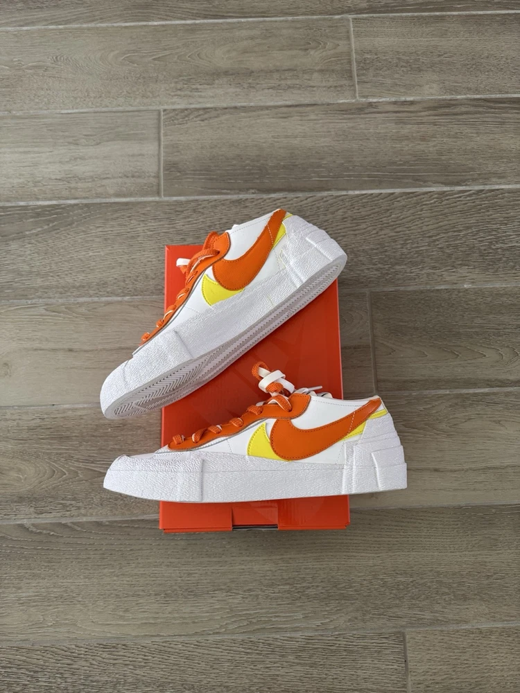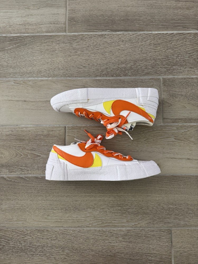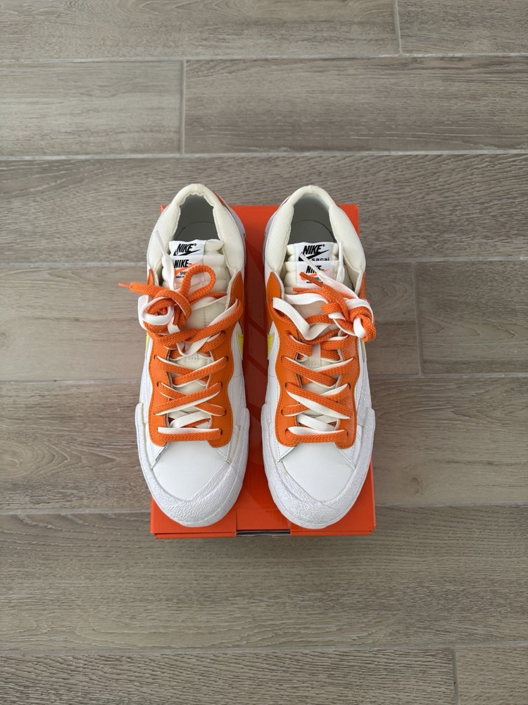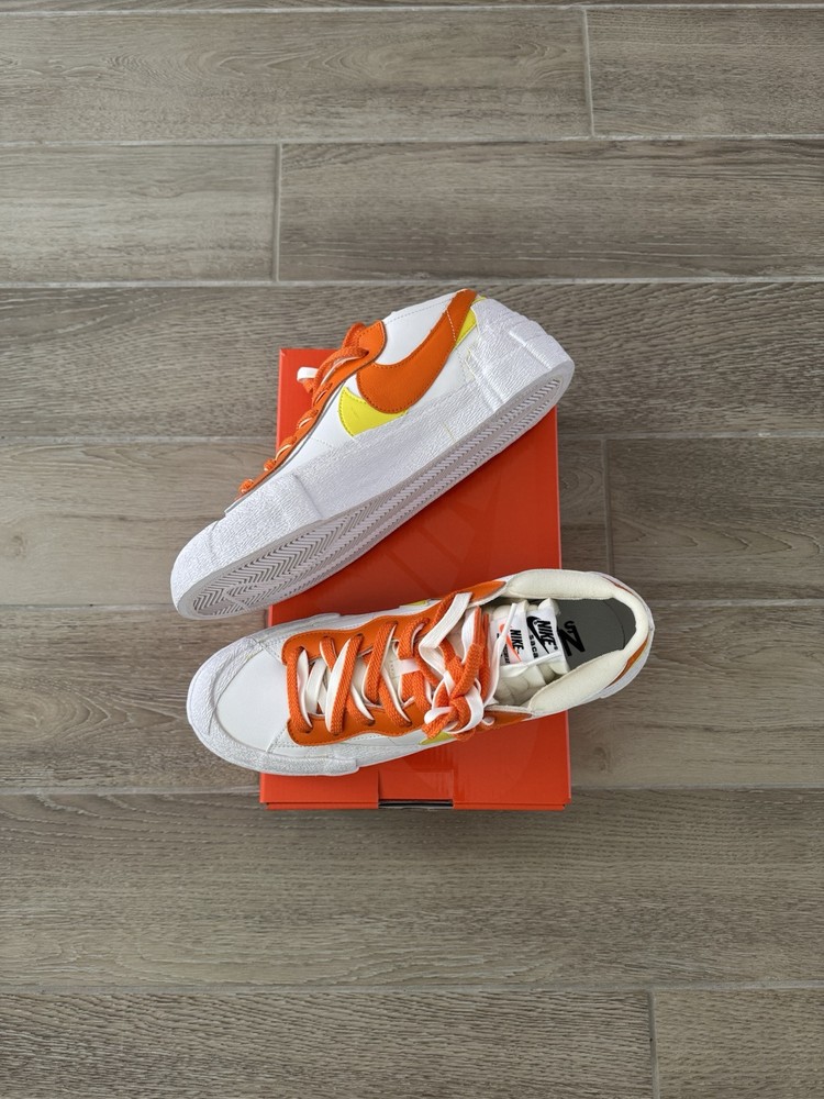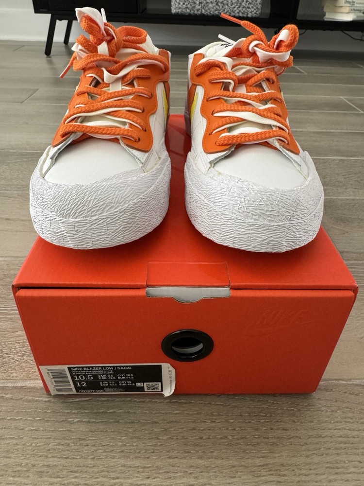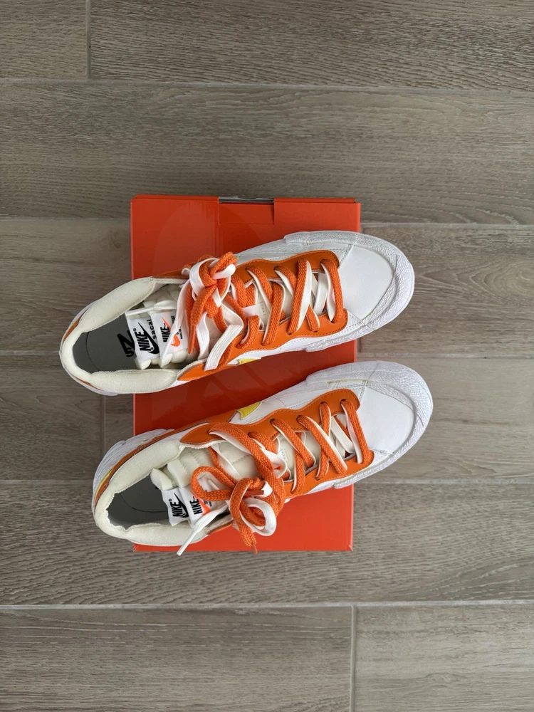 This Nike sacai x Blazer Low in size 10.5 features a stylish design in a colorway of White, Magma Orange, and White. The sneaker is part of the Nike Blazer product line and was released in 2021 with the style code DD1877-100. The shoe is crafted with a leather upper material and boasts a low top silhouette, ideal for an athletic and casual wear. The unique Magma Orange colorway adds a pop of vibrant color to the classic Nike Blazer design, making it a standout choice for sneaker enthusiasts.