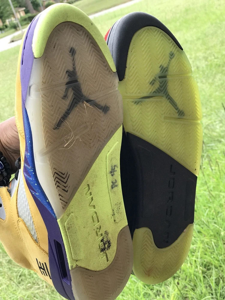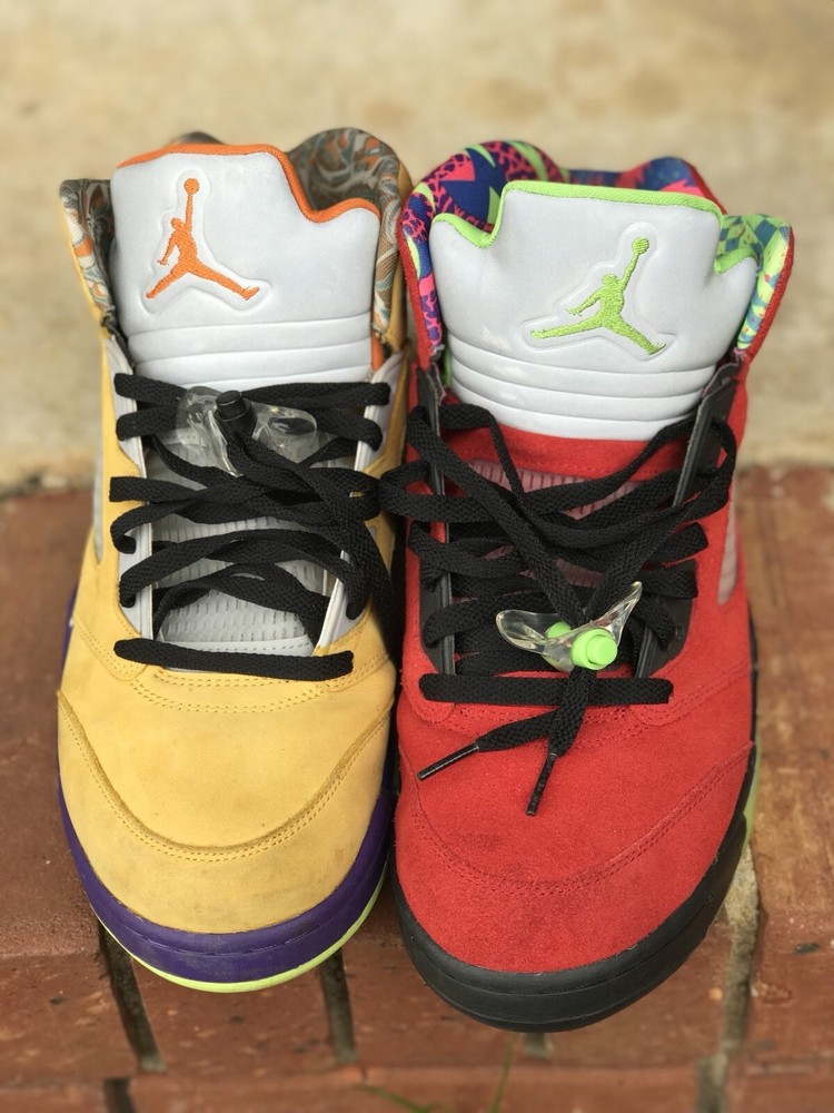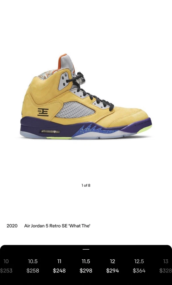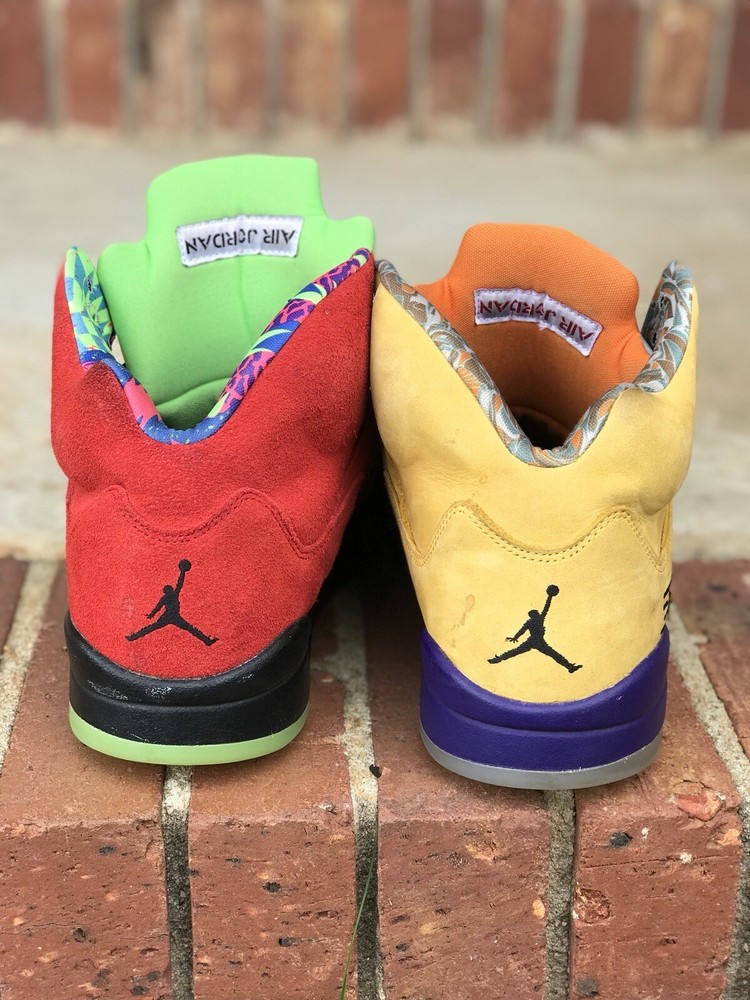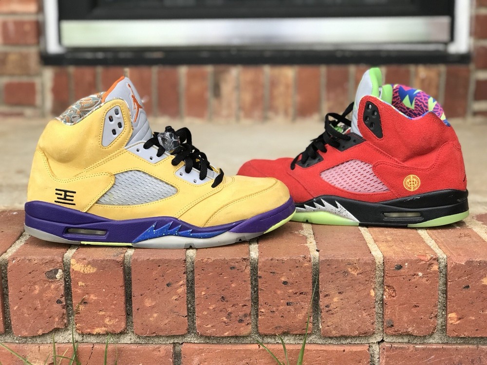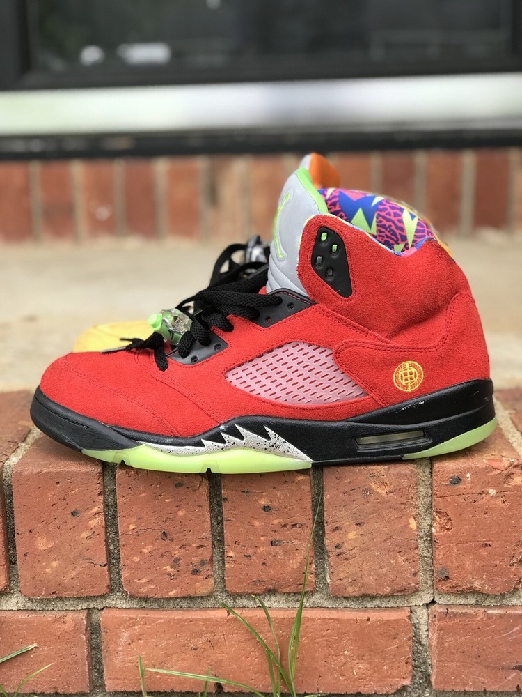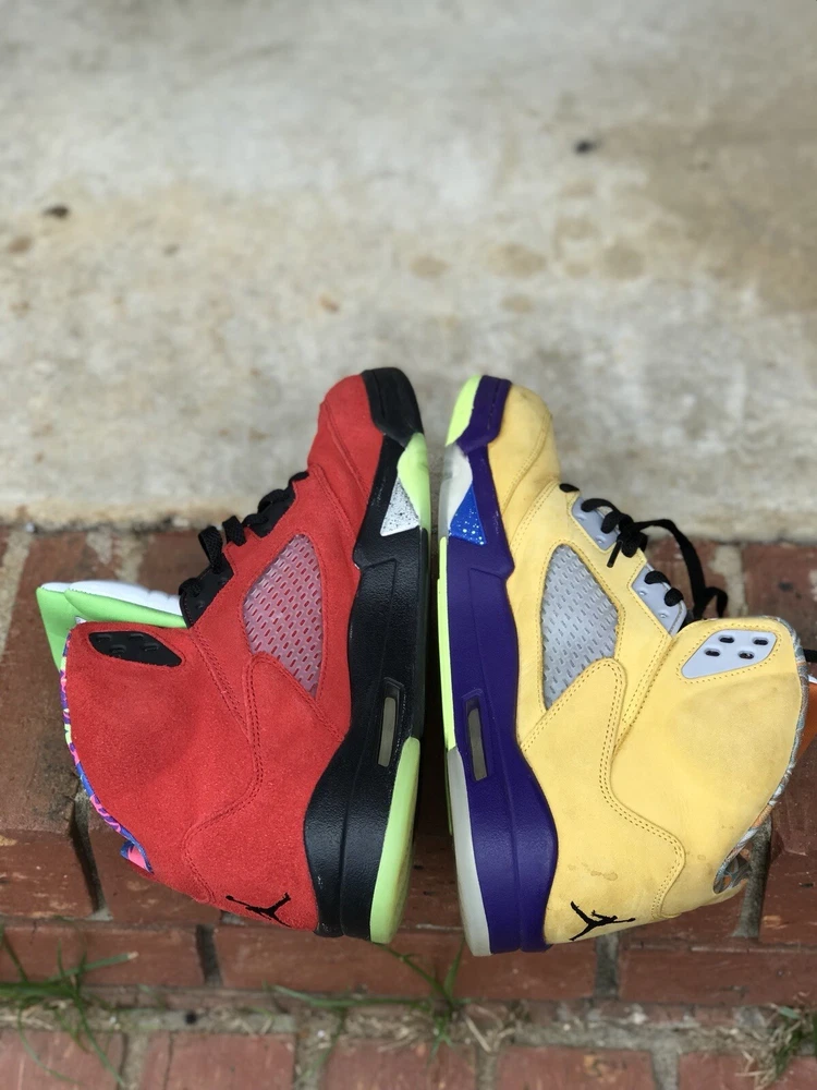 Elevate your sneaker game with these stylish Air Jordan 5 Retro SE Solar Orange sneakers. Designed with a mid-top shoe shaft style, these sneakers boast a striking yellow colorway that is sure to turn heads. The upper material is made of premium suede, and the shoes come in a US shoe size 11.5. These sneakers are perfect for any athletic occasion, whether you're hitting the gym or simply running errands. The style code is CZ5725-700, and the sneakers were released in 2020. With its sleek design and high-quality materials, this Air Jordan sneaker is a must-have for any sneaker enthusiast. Air Jordan Retro 5 “What The” Size 11.5 Good 8-10 Condition Follow me & turn on notifications for more Jordan’s, Nike’s, & Polo by Ralph Lauren Follow Us On IG @ThePoloCrews @FlairJordans23 @LolosPolos @iPoloEyePolo @RealFlyKicks @FlairJordansKicks4Chicks @ThePoloNiche @ThePoloBearMarket