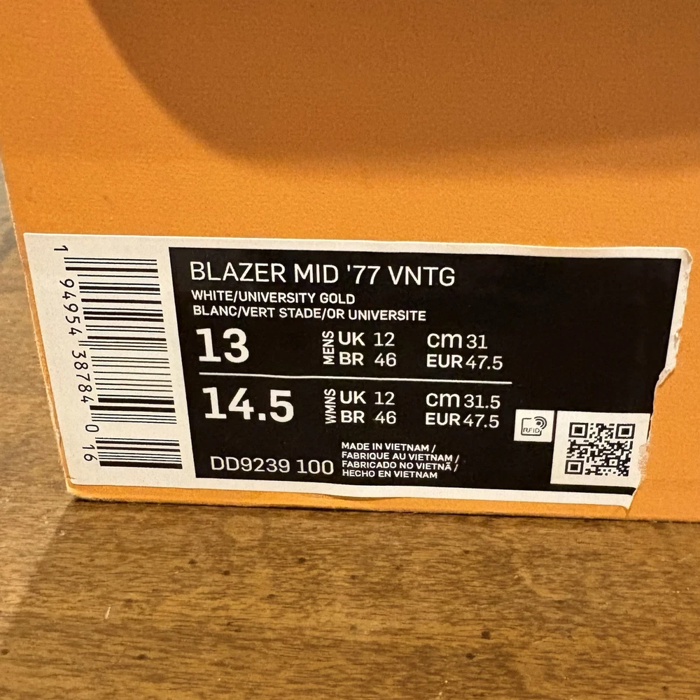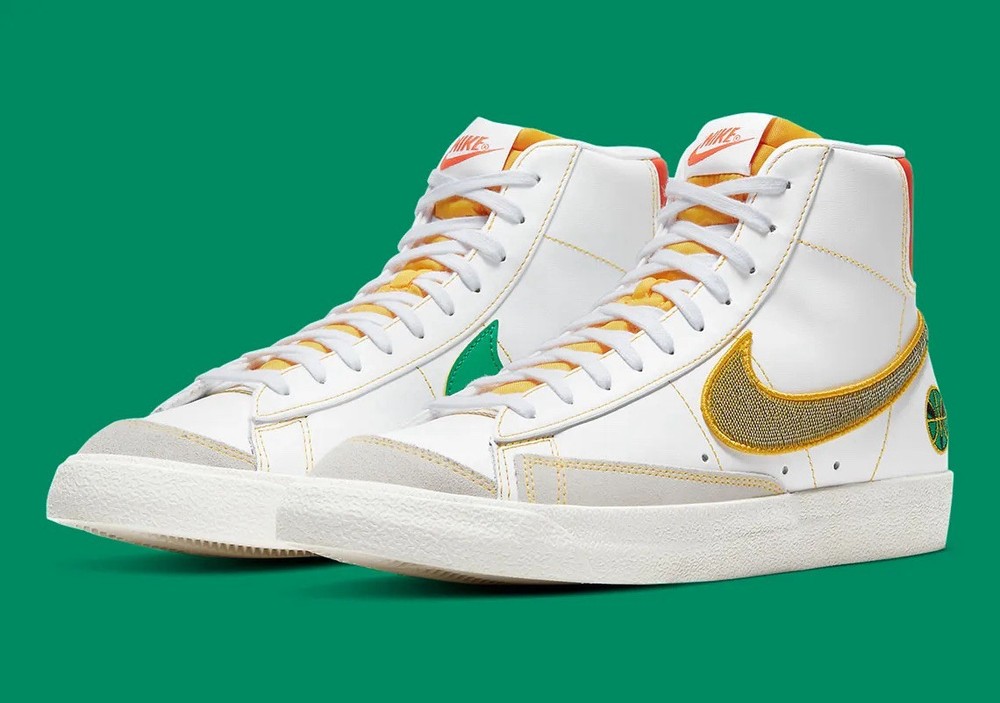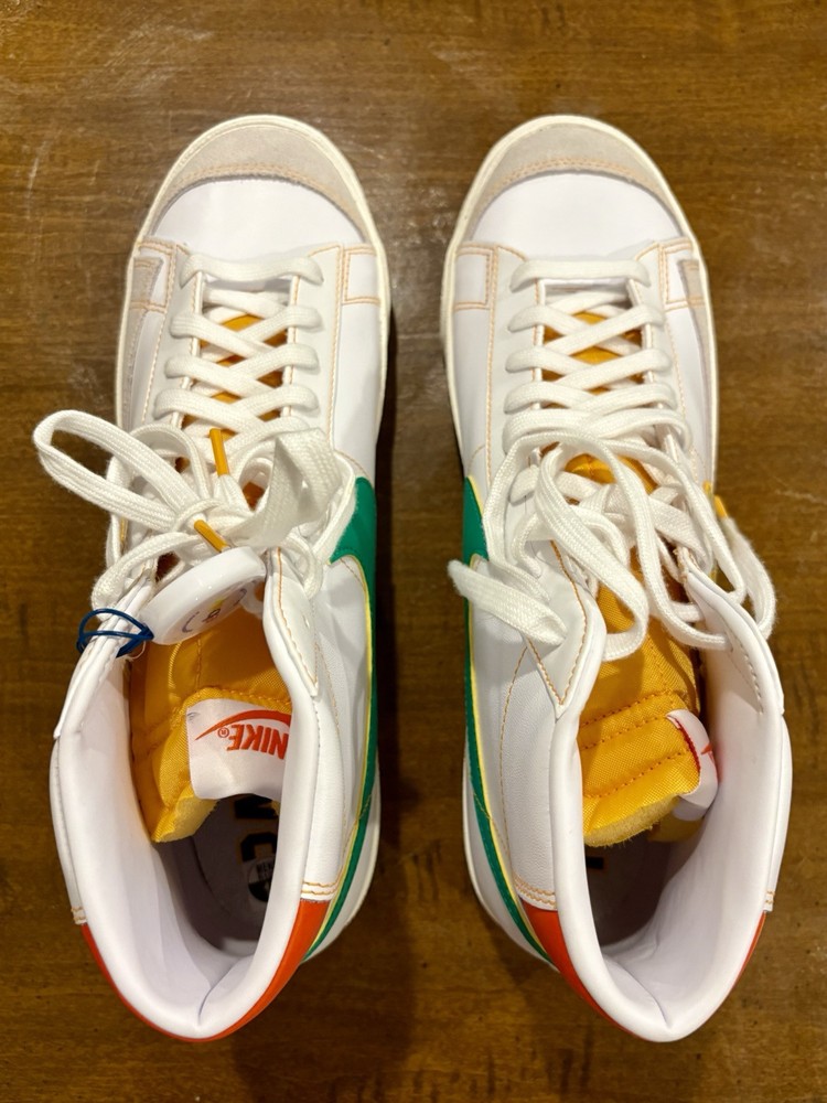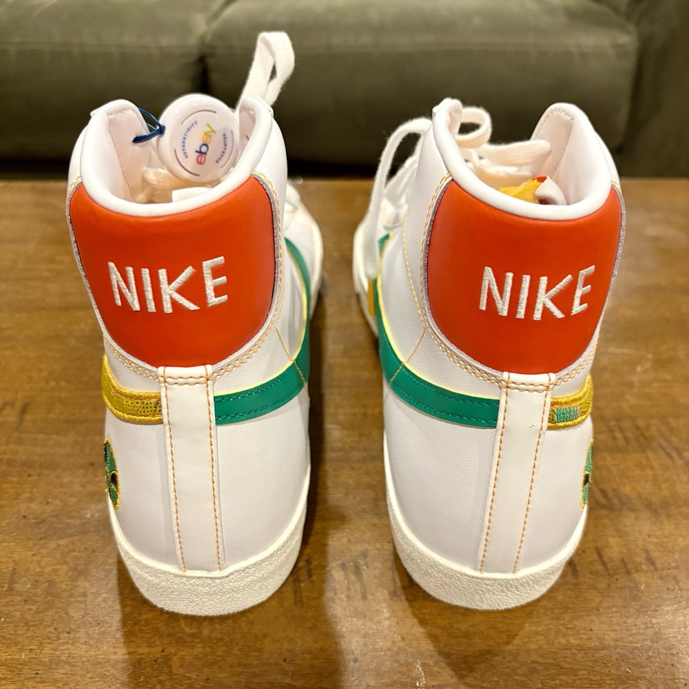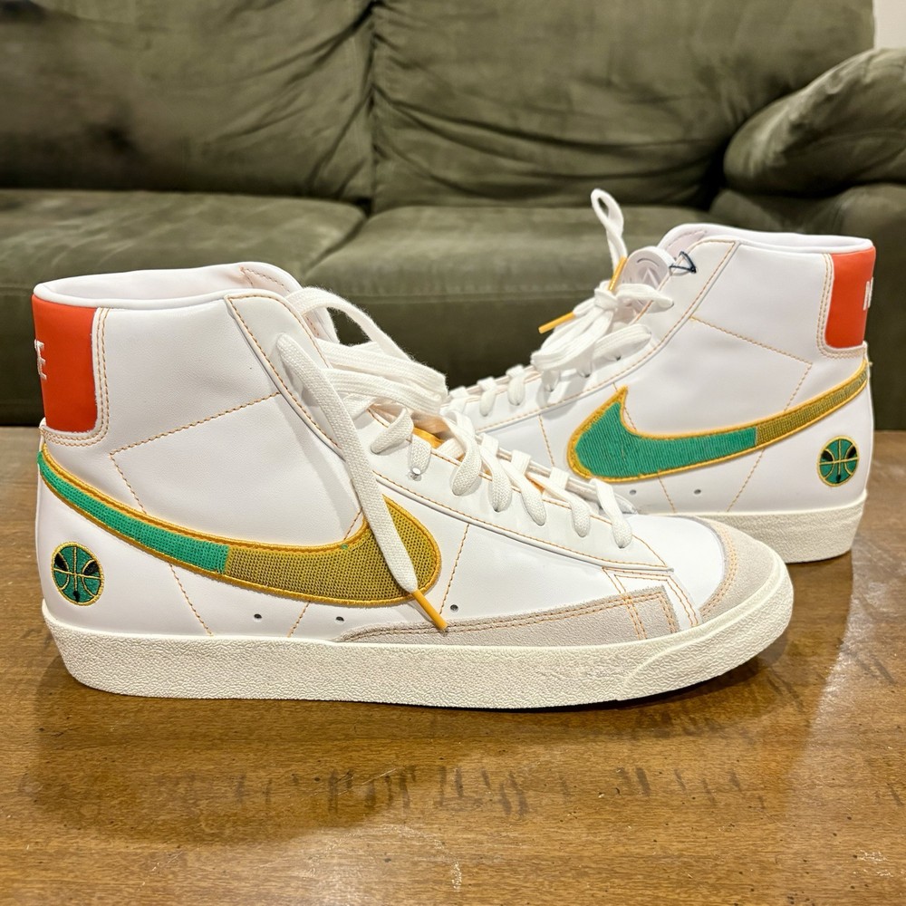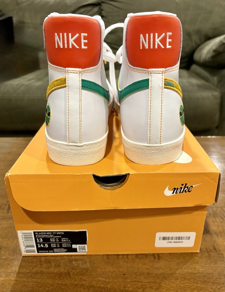 This is a Nike Blazer '77 Vintage Mid sneaker in size 13 for men. The shoe features a white leather upper with a mid-top shaft style. It is part of the Nike Blazer product line and has a unique Roswell Rayguns design. The style code is DD9239-100, and it was released in 2021.