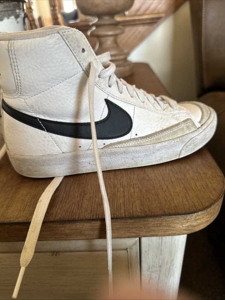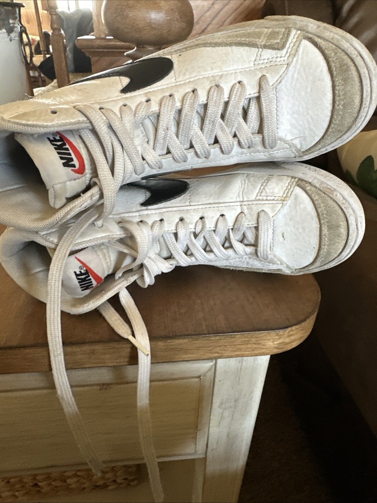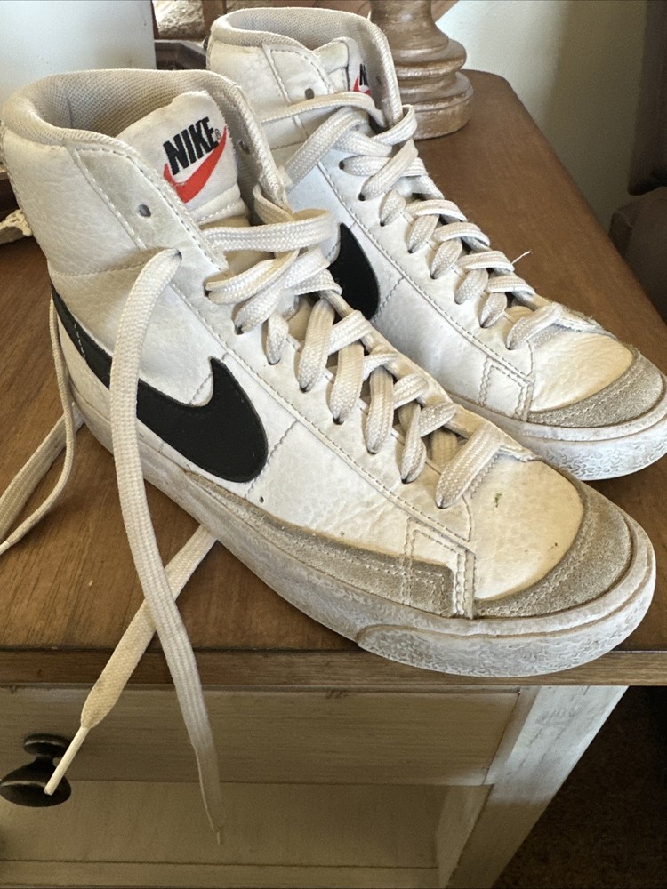This Nike Blazer Mid 77 sneaker in white and black is a must-have for any stylish kid. With a mid-top shoe shaft style, it provides a comfortable fit while still looking sleek and trendy. The athletic type of shoe is perfect for any active child, and the US shoe size 3.5 ensures a perfect fit for kids in the Girls and Unisex Kids departments. Shoes are used- as pictured- worn in but not worn out. The Nike Blazer Mid 77 model is part of the popular Nike Blazer product line and is sure to make any child stand out. The white color of the shoe provides a classic and versatile look that can be dressed up or down. Add this stylish sneaker to any kid's wardrobe for a fashionable and comfortable look.