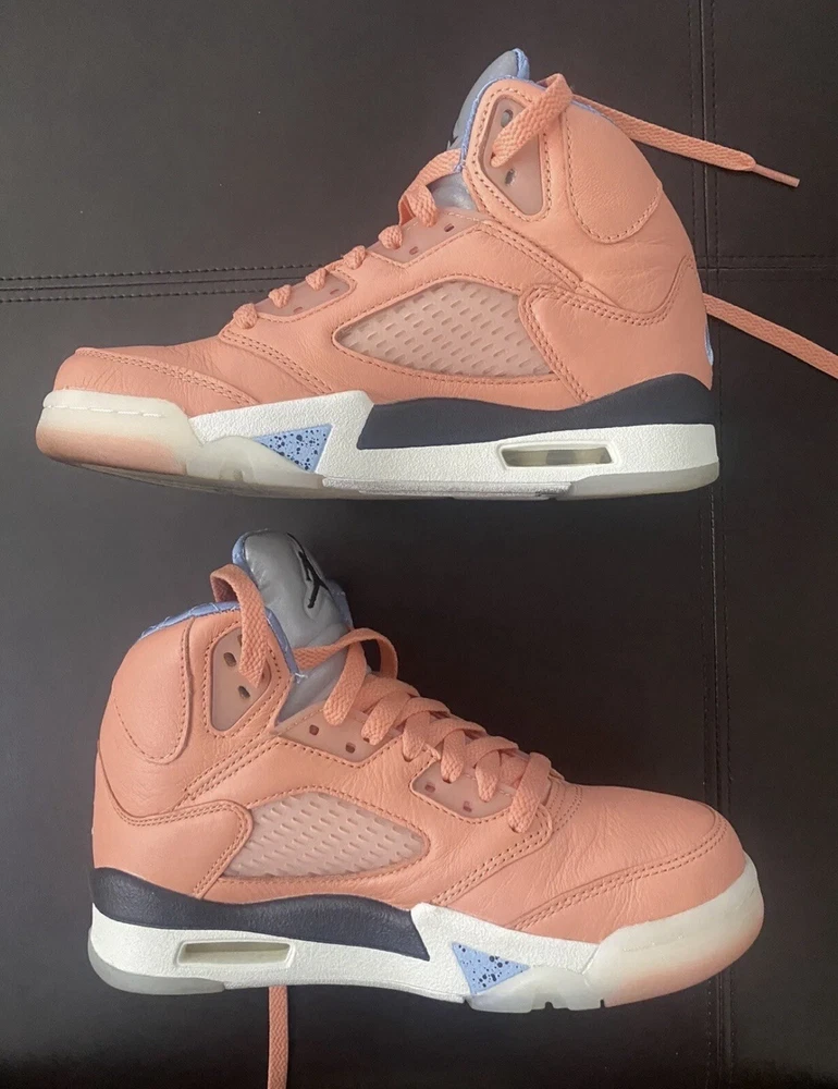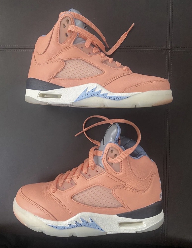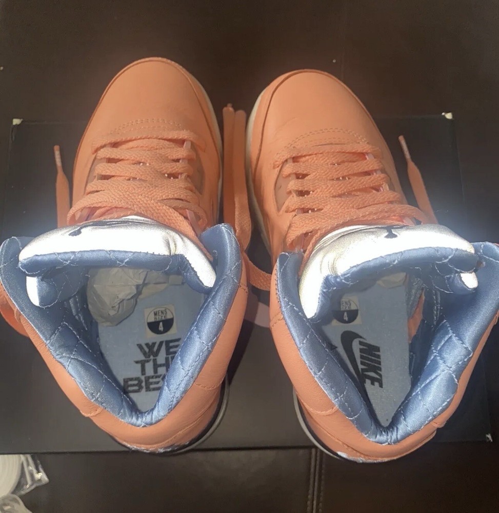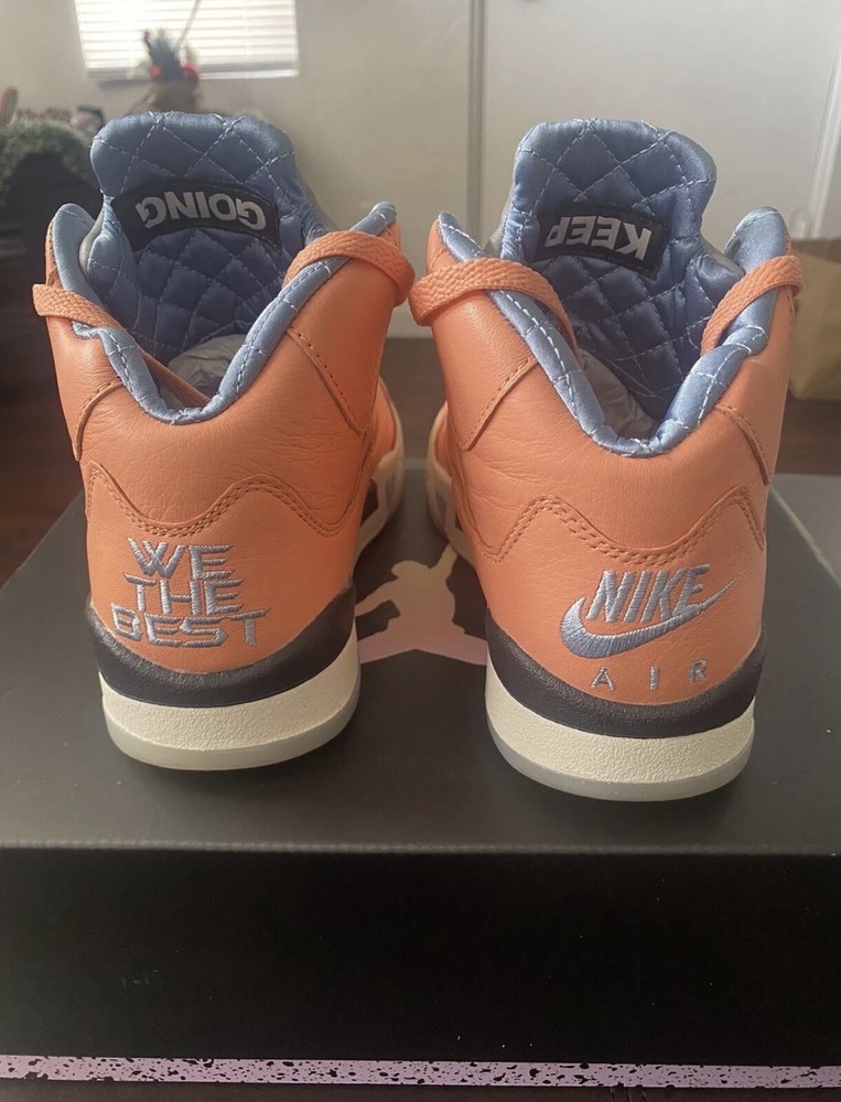 MESSAGE ME. MAKE AN OFFER!! Get ready to elevate your sneaker game with these stylish Air Jordan 5 Retro x DJ Khaled We The Best - Crimson Bliss sneakers. This pair offers a shaft style and a trendy orange colorway with accents of Crimson Bliss, Leche Blue, and Sail. The shoes are made of high-quality materials and are designed to provide comfort and durability for everyday wear. These sneakers are perfect for those who want to make a statement with their footwear. The shoes come in a US size 4 and are part of the Air Jordan 5 product line. The release date is November 29, 2022, and the style code is DV4982-641. Order now and add these stylish sneakers to your collection!