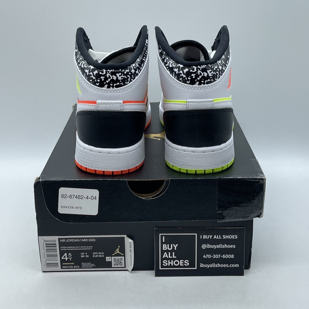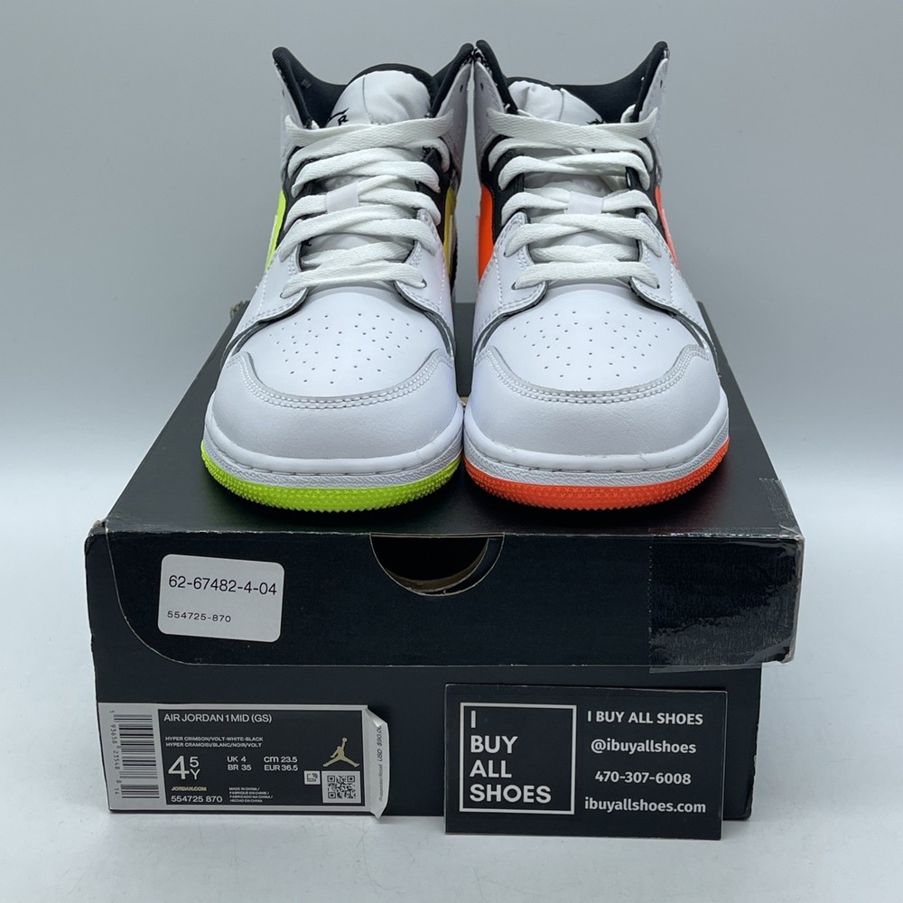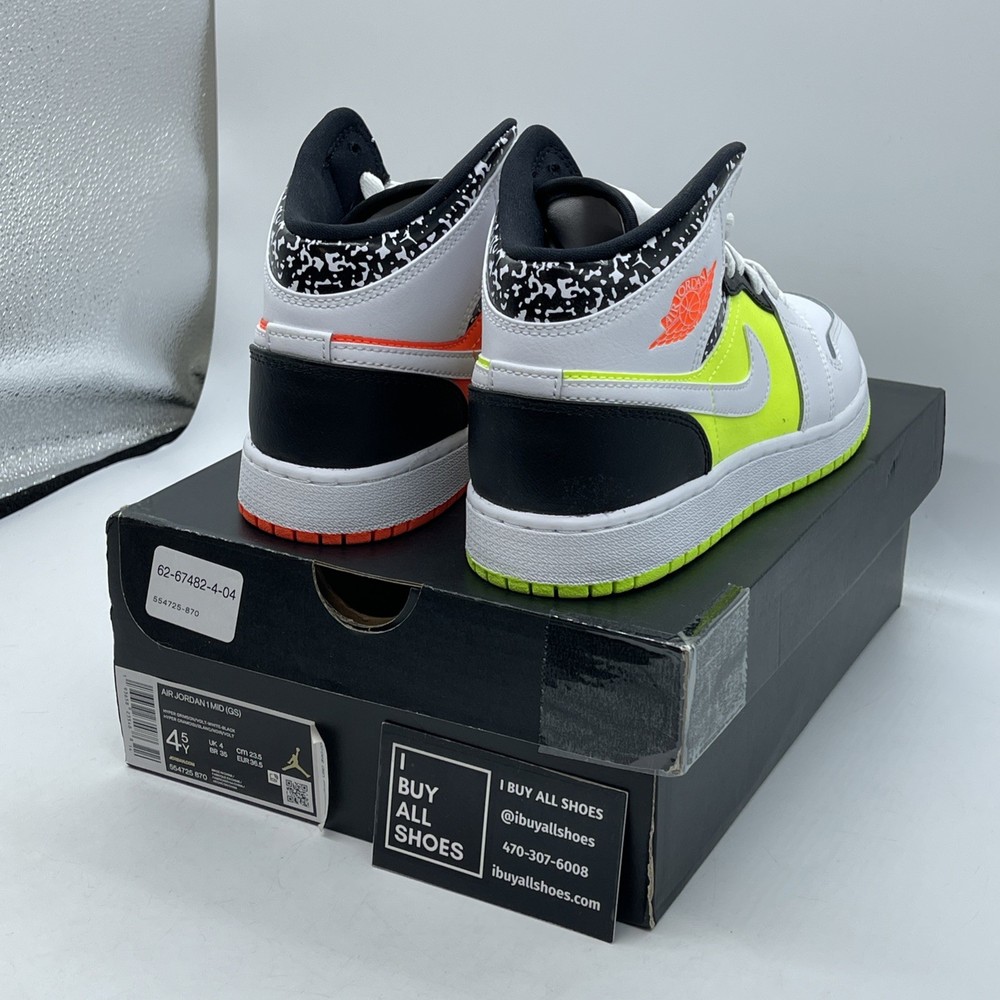 The product is a pair of Jordan 1 Mid sneakers in a size 4.5Y (GS). These sneakers are part of the Air Jordan line and feature a white, orange, and black color scheme with a leather upper material. The mid-top design and athletic style make them suitable for both boys and girls, and the iconic Air Jordan 1 model adds a touch of style and nostalgia to the unisex kids' footwear collection. 6037.