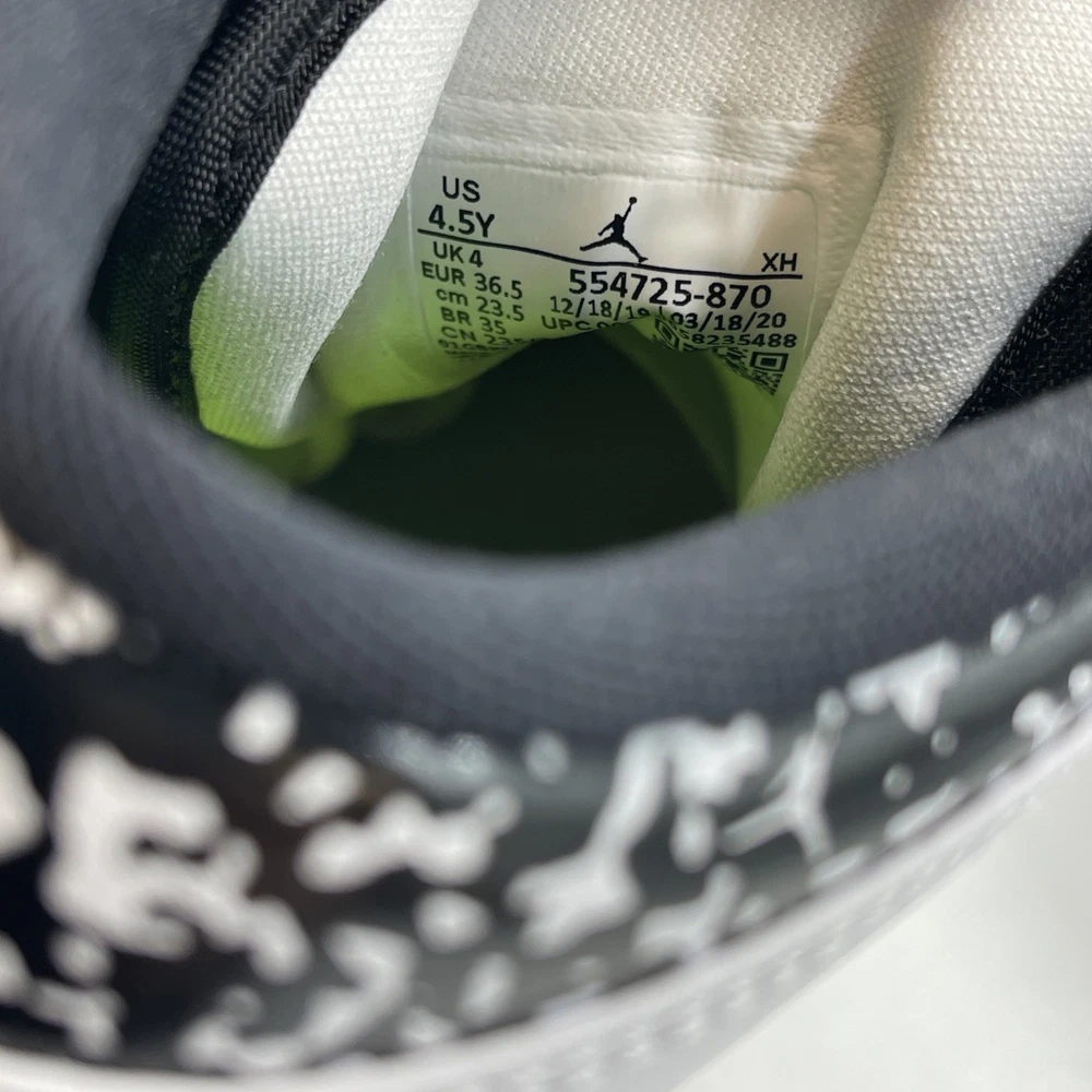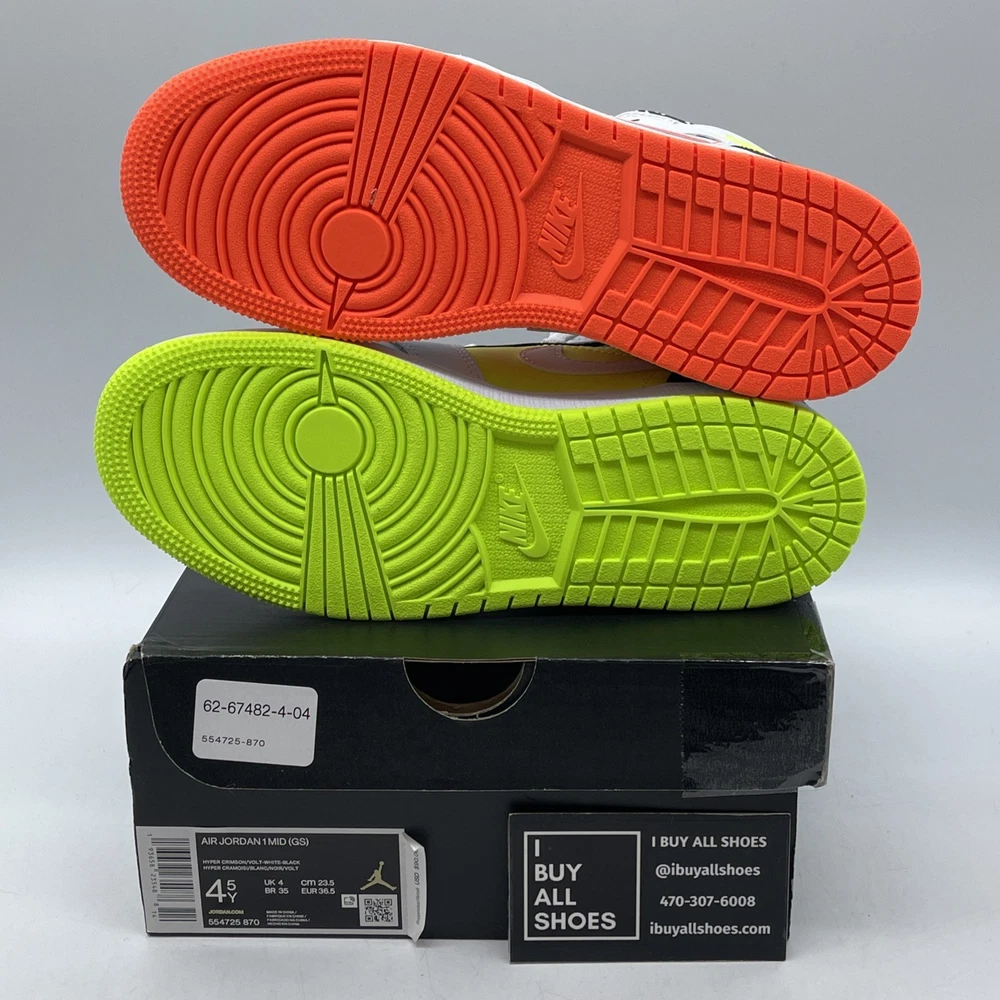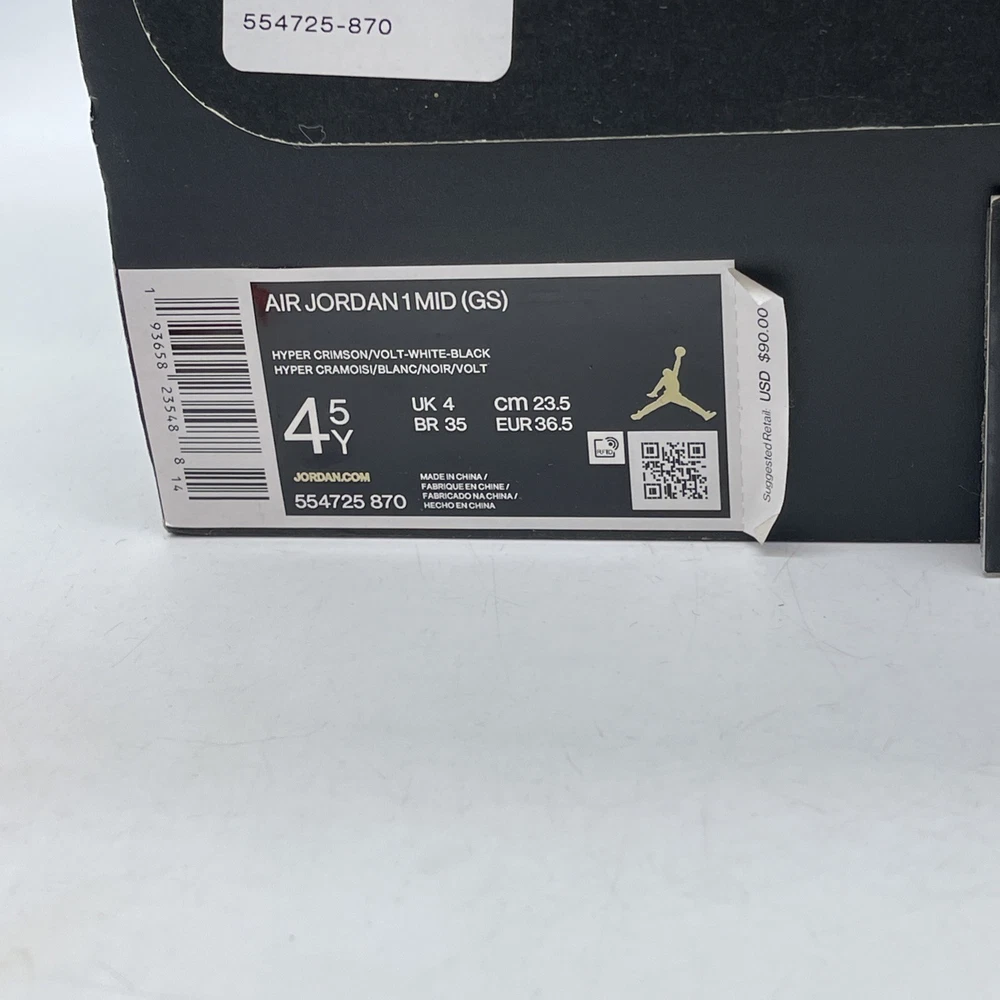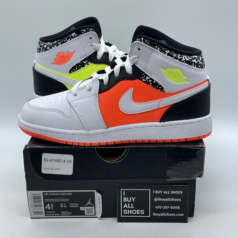The product is a pair of Jordan 1 Mid sneakers in a size 4.5Y (GS). These sneakers are part of the Air Jordan line and feature a white, orange, and black color scheme with a leather upper material. The mid-top design and athletic style make them suitable for both boys and girls, and the iconic Air Jordan 1 model adds a touch of style and nostalgia to the unisex kids' footwear collection. 6037.