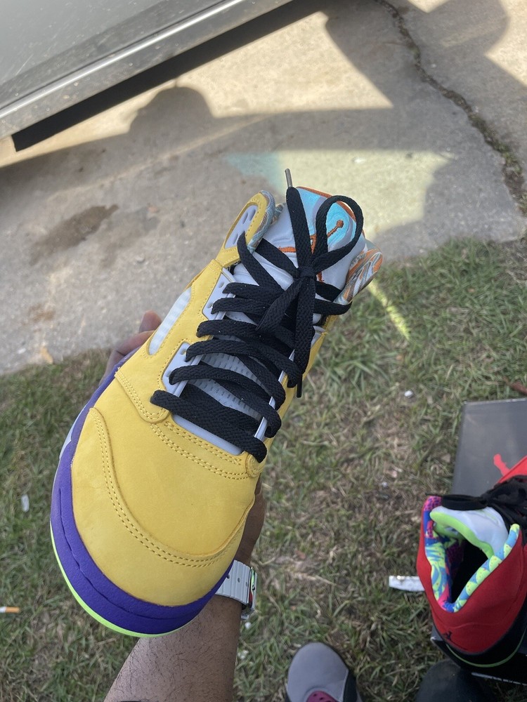 This pair of sneakers is perfect for anyone who loves basketball shoes. With its yellow color and Solar Orange accents, it will definitely catch the attention of anyone who sees you wear it. The Air Jordan 5 Retro SE is a must-have for collectors and fans alike. Made with high-quality materials, these sneakers are comfortable and durable. They feature the iconic Air Jordan logo and have a sleek, athletic style that is perfect for any occasion. Whether you're playing ball or just running errands, these sneakers will keep you looking and feeling great.