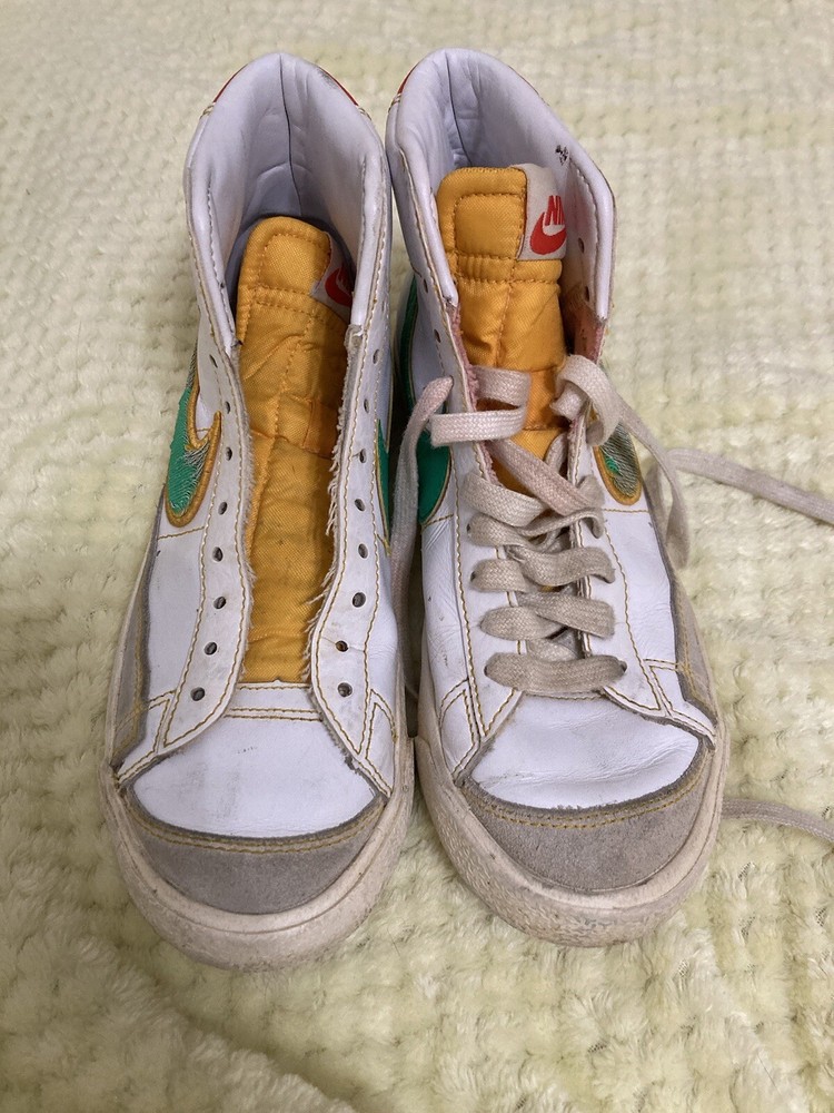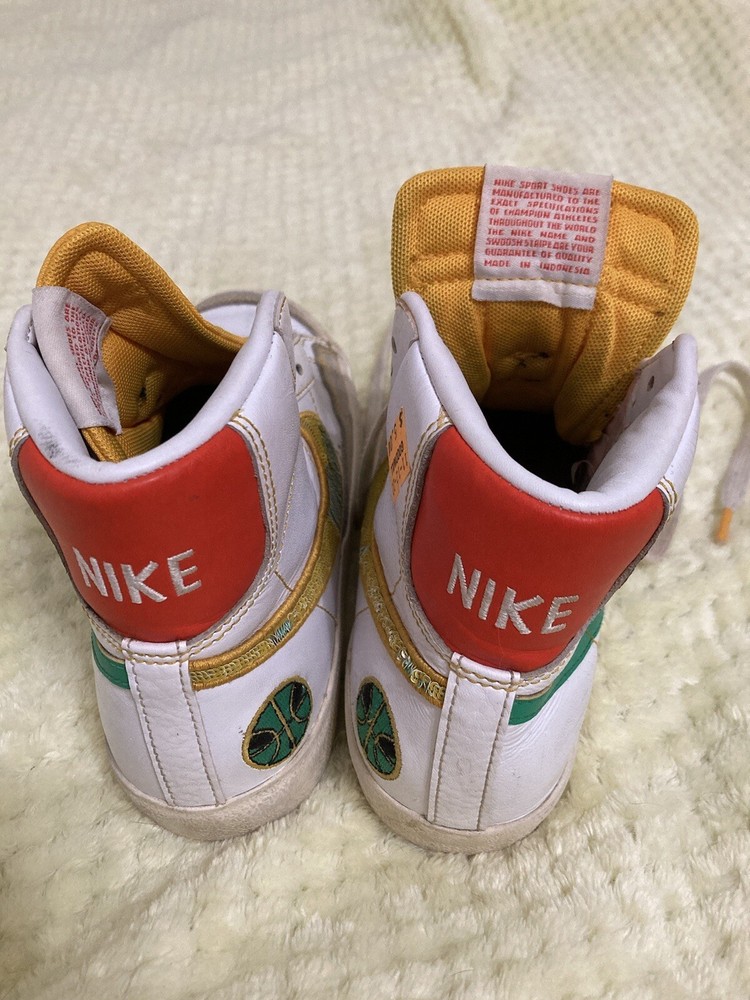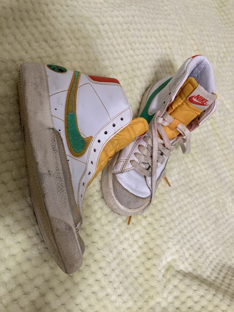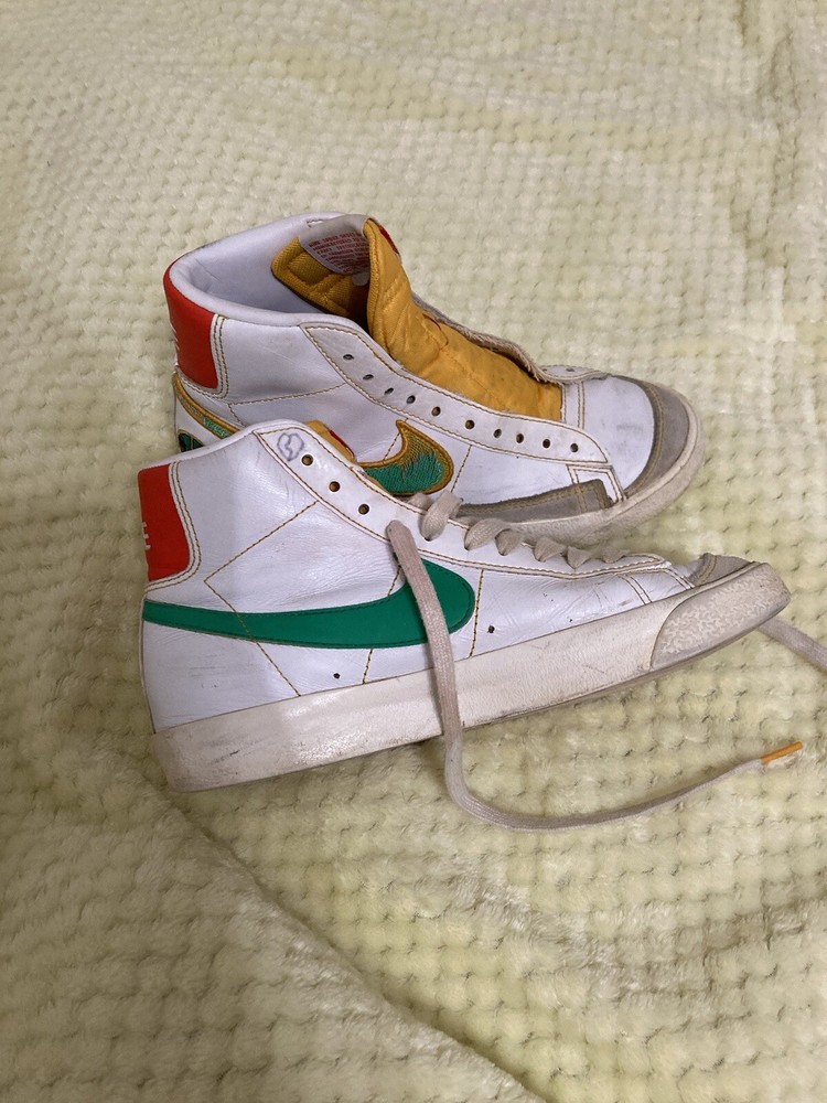 This pair of Nike Blazer '77 Vintage Mid Roswell Rayguns is perfect for any sneaker enthusiast. With a unique design inspired by the Roswell Rayguns basketball team, these shoes are sure to turn heads. The size 5.5 fits comfortably for both men and women, making it a versatile addition to anyone's shoe collection. Made with high-quality materials and expert craftsmanship, these shoes are built to last. Whether you're a collector or simply looking for a stylish pair of shoes, the Nike Blazer '77 Vintage Mid Roswell Rayguns are a great choice. Get yours today and step out in style. These shoes are worn and laces are missing from one shoe
