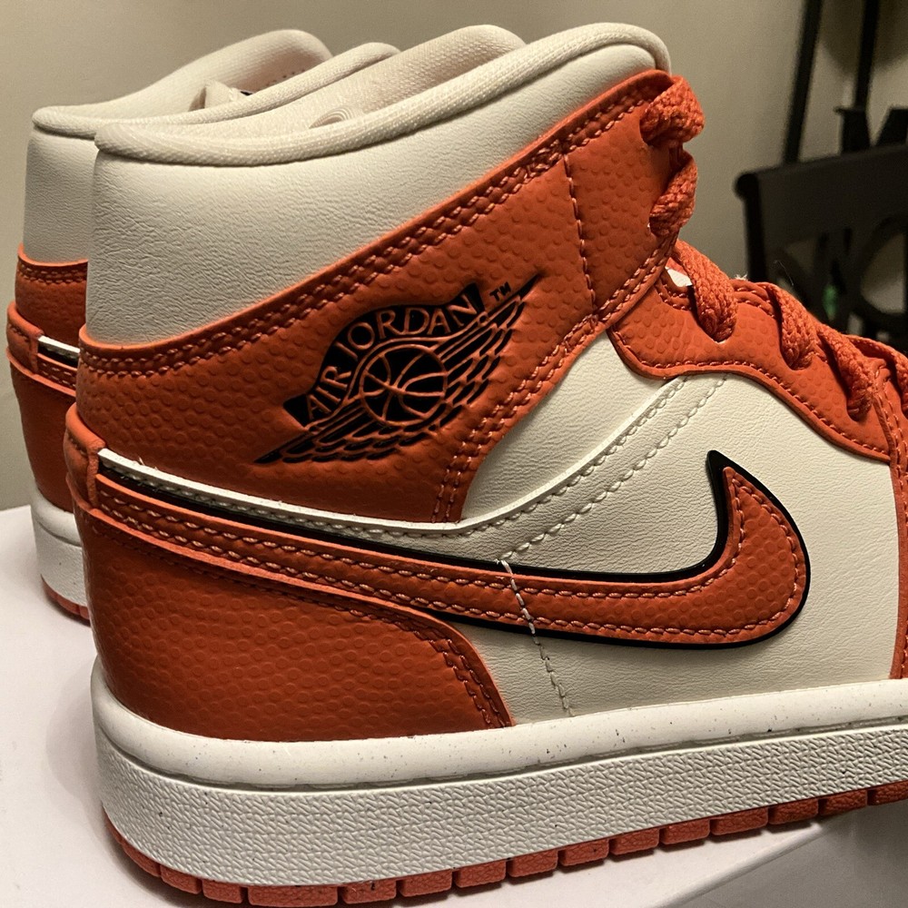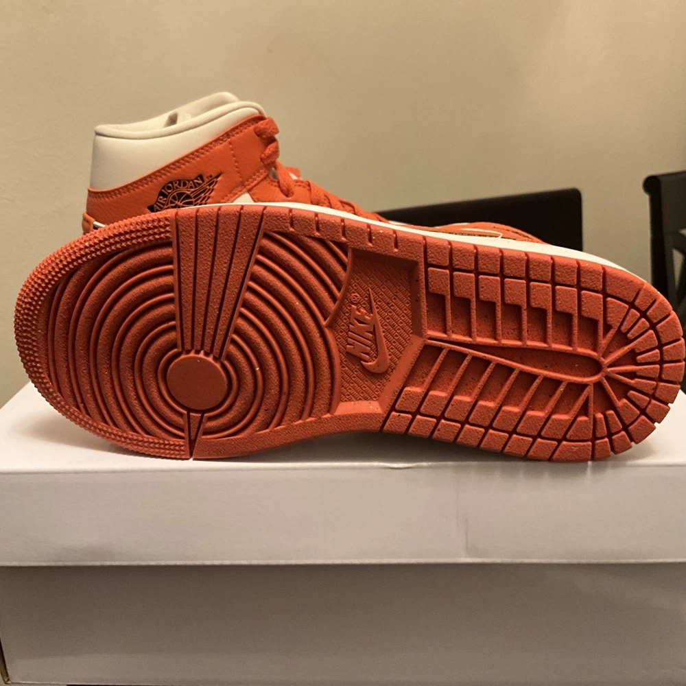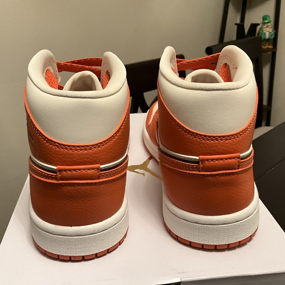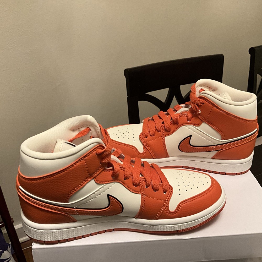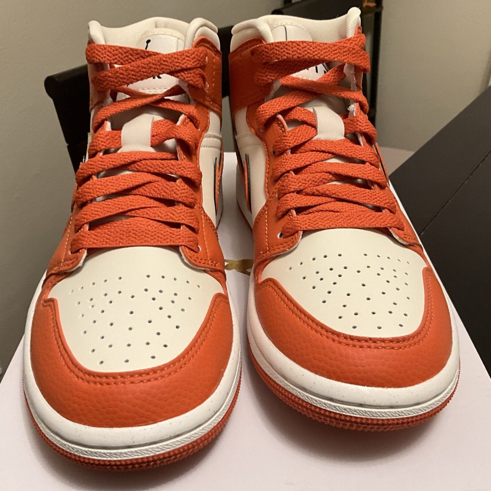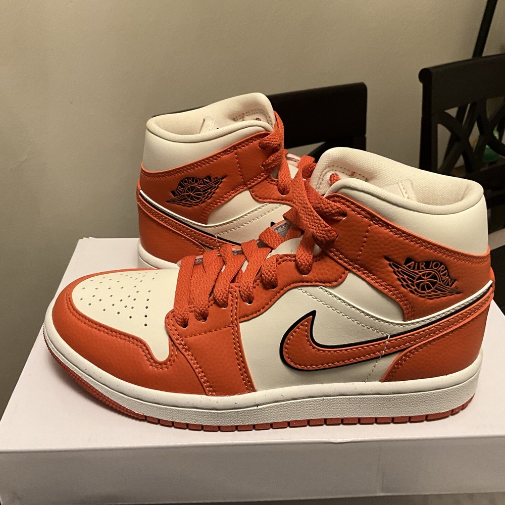 Elevate your sneaker game with these Air Jordan 1 SE Mid Sport Spice shoes. The striking blend of orange, red, and black hues on the leather upper creates a unique and stylish look. Perfect for women who love to stand out from the crowd, these shoes are available in size 6 and come with the original box. Take your outfit to the next level with these bold and eye-catching shoes. These are from Nike Guaranteed Authentic Location Z-8