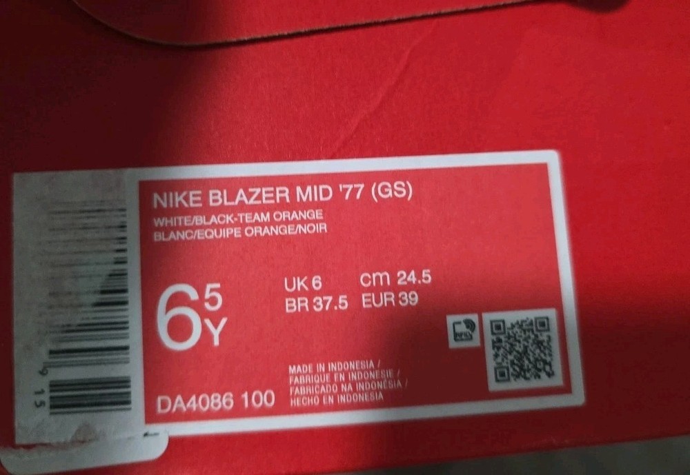 Size 6.5 (GS) - Nike Blazer Mid 77 White and red. Shoe has been worn and were used majority for the gym. The red is more of a dark red / maroon but fits the red category! There is some noticeable dirt on the front. Retail price is $80, feel free to ask any questions! I would rate the shoes 7/10