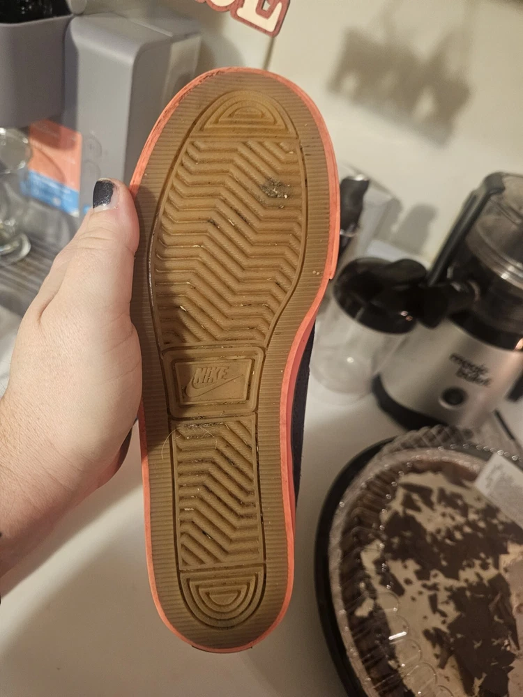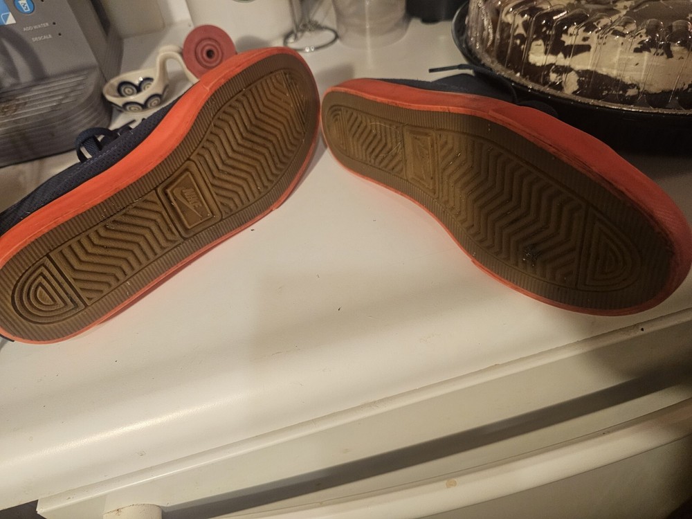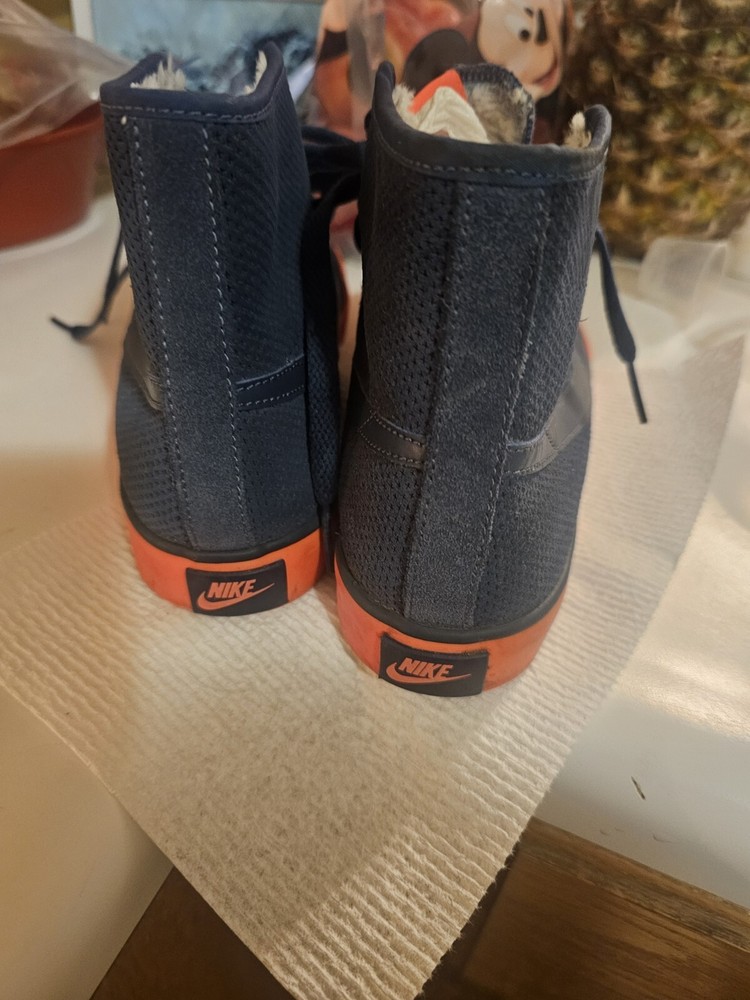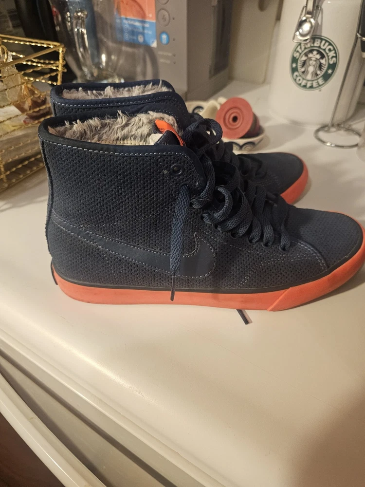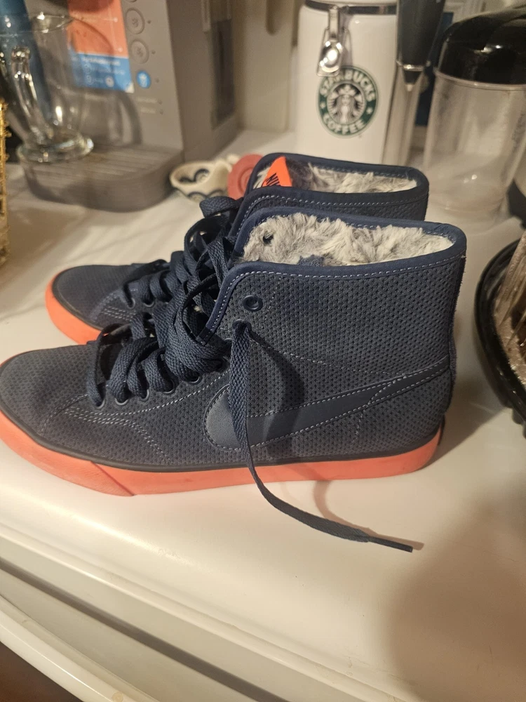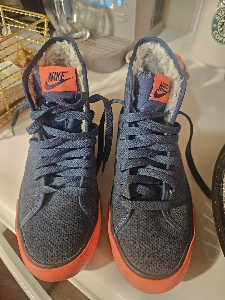 This pair of Nike Primo Court Mid Suede sneakers in blue is good conditon for anyone looking for a stylish and comfortable pair of shoes. The mid-height design provides excellent ankle support, making it ideal for athletic activities or everyday wear. The size 6.5. barey worn. The Nike Primo Court Mid Suede sneakers are pre-owned but show minimal signs of wear. Get your hands on this stylish pair of sneakers today! not sure if the trim color is neon orange or neon pink.
