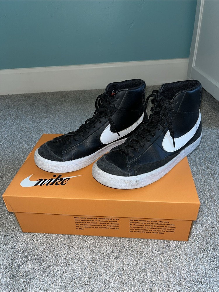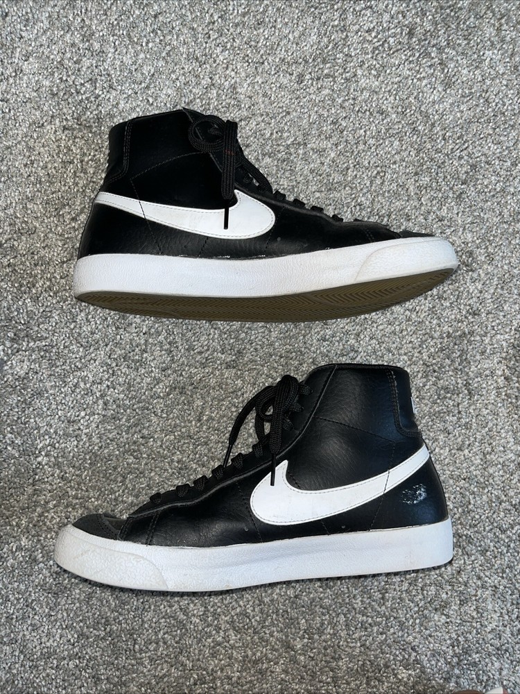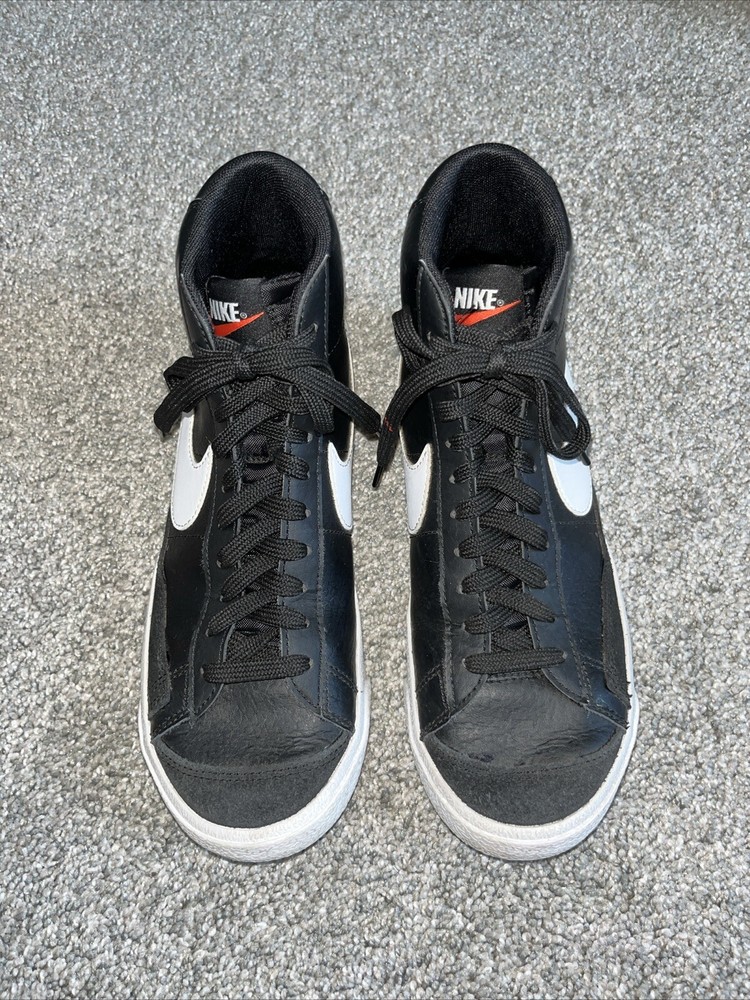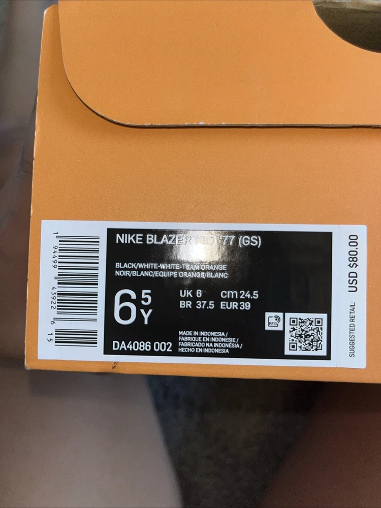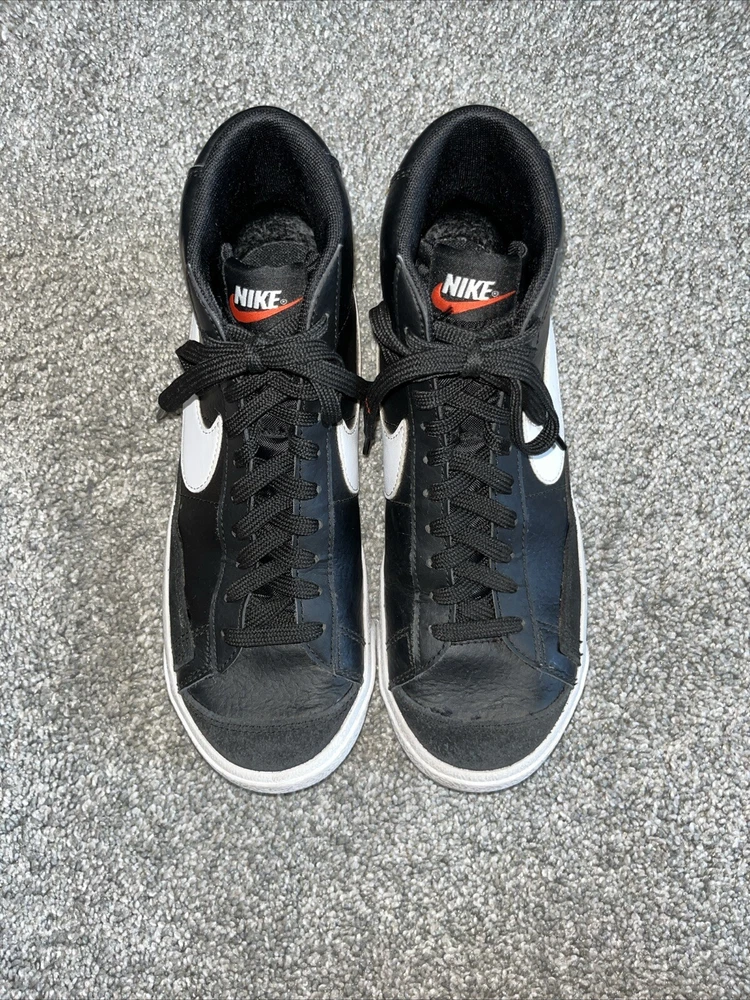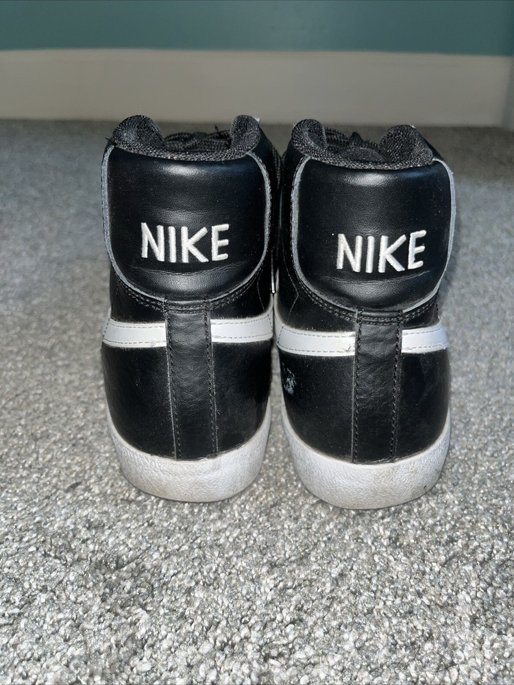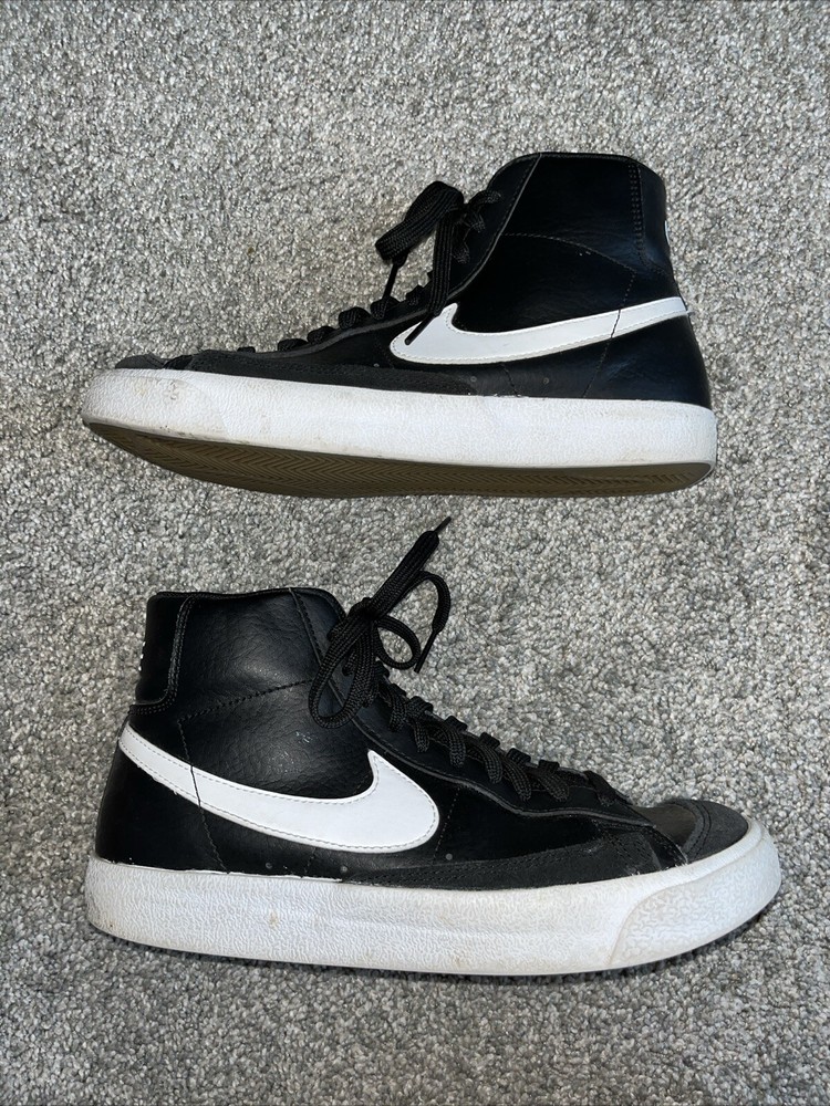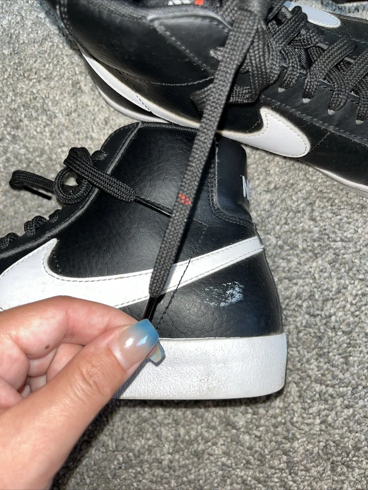 The black and white colorway with colorful accents is perfect for any outfit. The mid-top shoe shaft style and athletic type make these sneakers great for any adventure, whether it's running around the playground or exploring the neighborhood. These unisex kids' shoes are designed for comfort and style. The Nike Blazer Mid '77 model is part of the Nike Blazer product line, and it's perfect for kids/teens who love to stay active and fashionable. With a US shoe size of 6.5Y, these sneakers are a great fit for any young sneakerhead. DISCLAIMER: SMALL red paint spill on left shoe lace, pictured in last photo. ADDITIONALLY, smudged white paint on right heel.