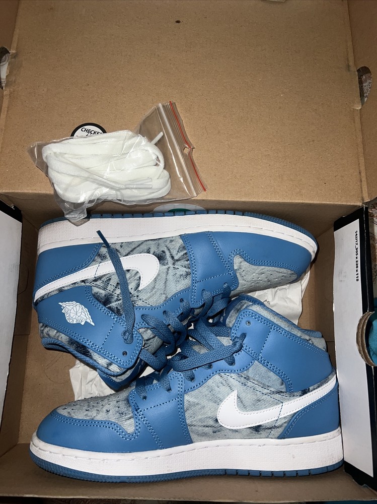 These Jordan 1 Mid Blue Denim look fresh like they just came off the shelf—barely worn, super clean, and still have that new-shoe feel. Comes with extra laces and the original box, so it’s basically a steal for any sneakerhead. Perfect if you want that crispy look without the brand-new price!