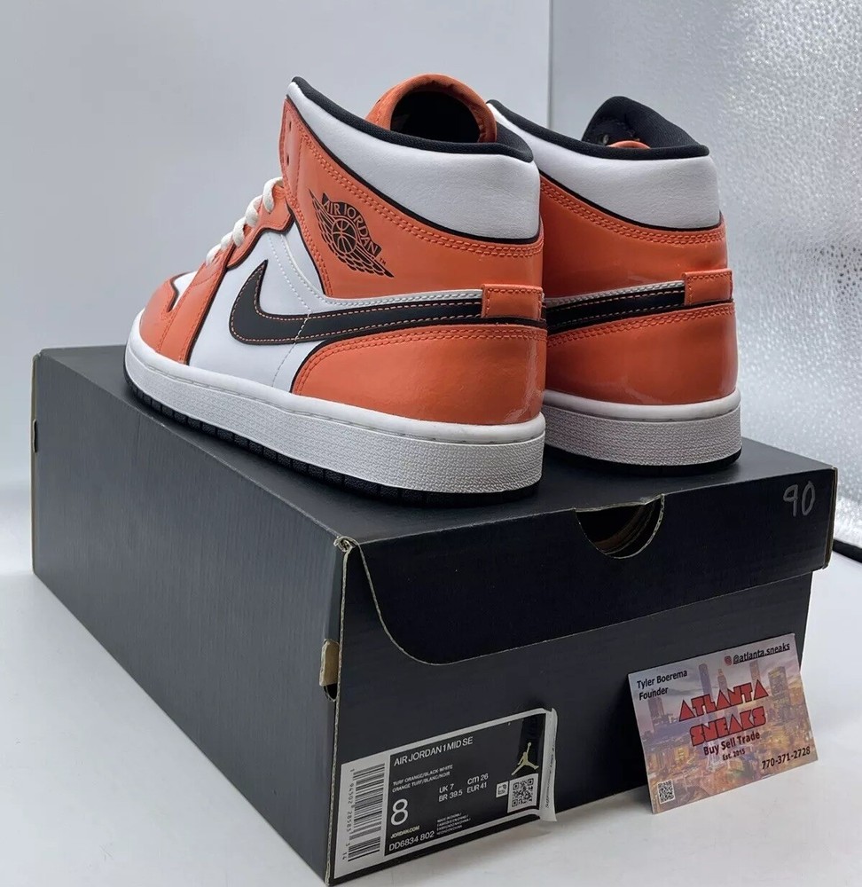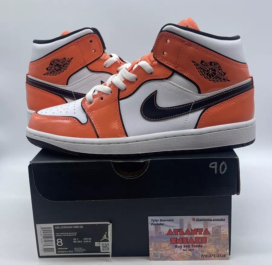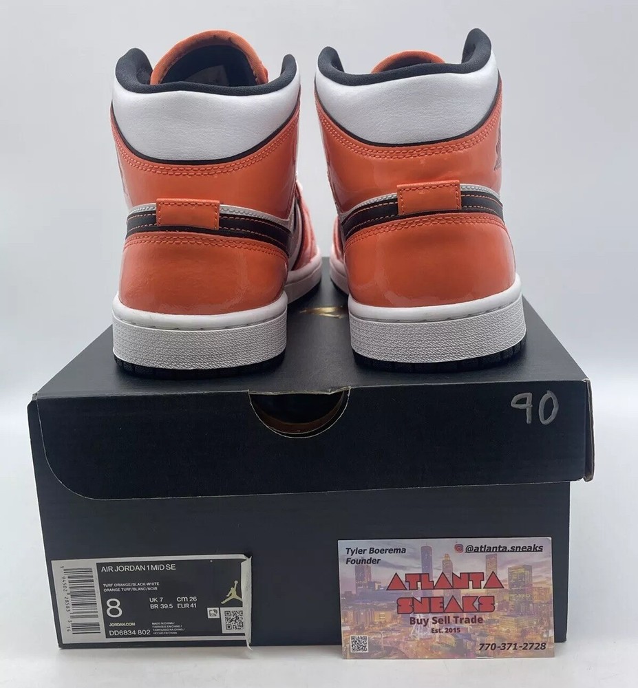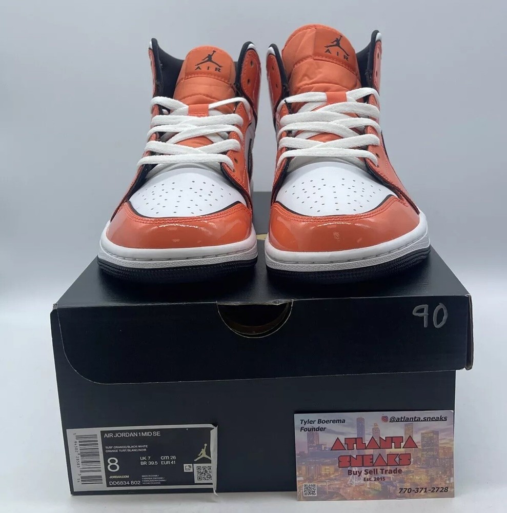 Elevate your sneaker game with these stylish Air Jordan 1 SE Mid Turf Orange shoes. Featuring a mid-top silhouette, these sneakers are perfect for any casual or athletic outfit. The orange patent leather upper material adds a pop of color to any look, while the black and white details provide a sleek touch. These shoes are part of the iconic Air Jordan product line and come in a size 8. The style code is DD6834-802, and the shoes are designed for men. Whether you're hitting the gym or just running errands, these Air Jordan 1 SE Mid Turf Orange sneakers will keep you looking fresh and fashionable.