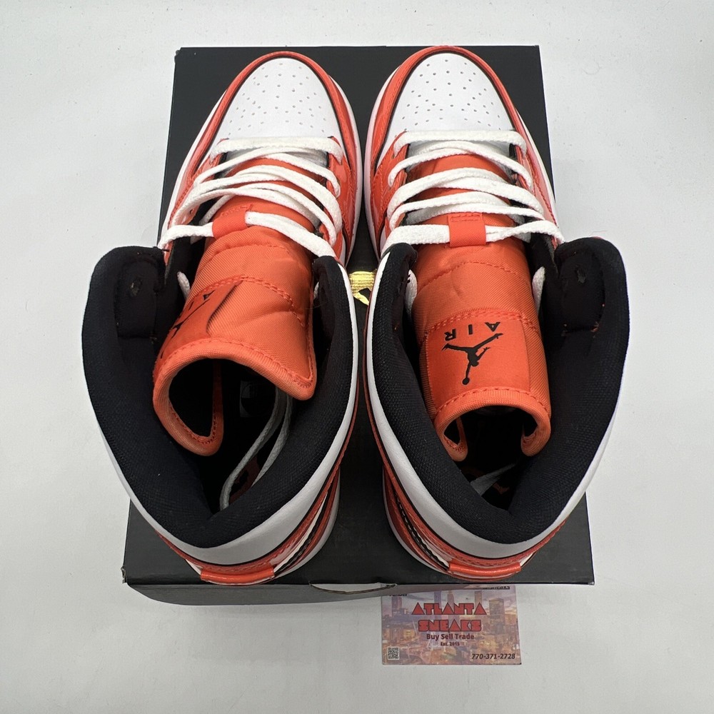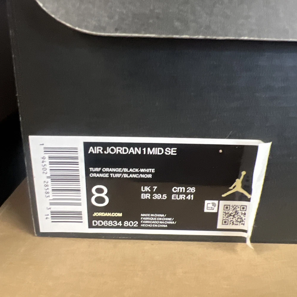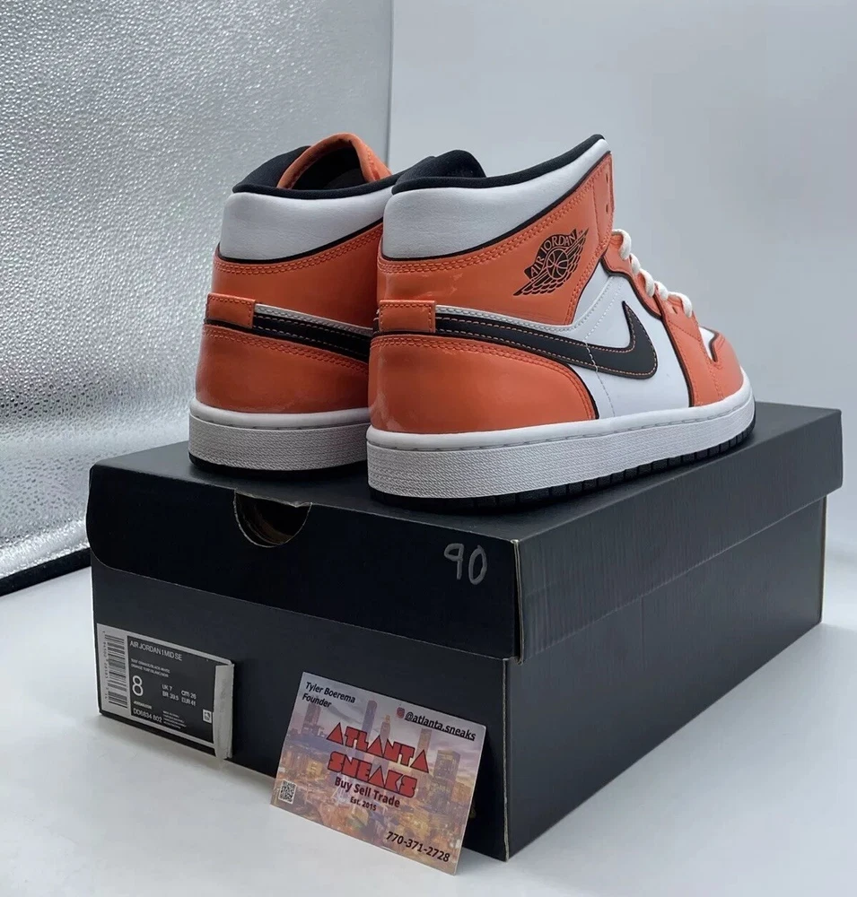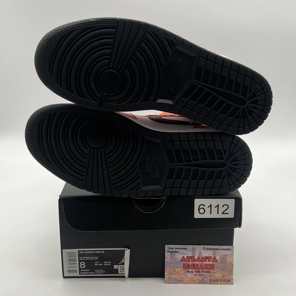 Elevate your sneaker game with these stylish Air Jordan 1 SE Mid Turf Orange shoes. Featuring a mid-top silhouette, these sneakers are perfect for any casual or athletic outfit. The orange patent leather upper material adds a pop of color to any look, while the black and white details provide a sleek touch. These shoes are part of the iconic Air Jordan product line and come in a size 8. The style code is DD6834-802, and the shoes are designed for men. Whether you're hitting the gym or just running errands, these Air Jordan 1 SE Mid Turf Orange sneakers will keep you looking fresh and fashionable.