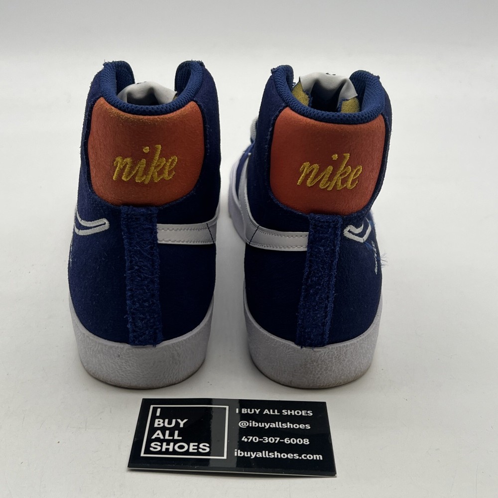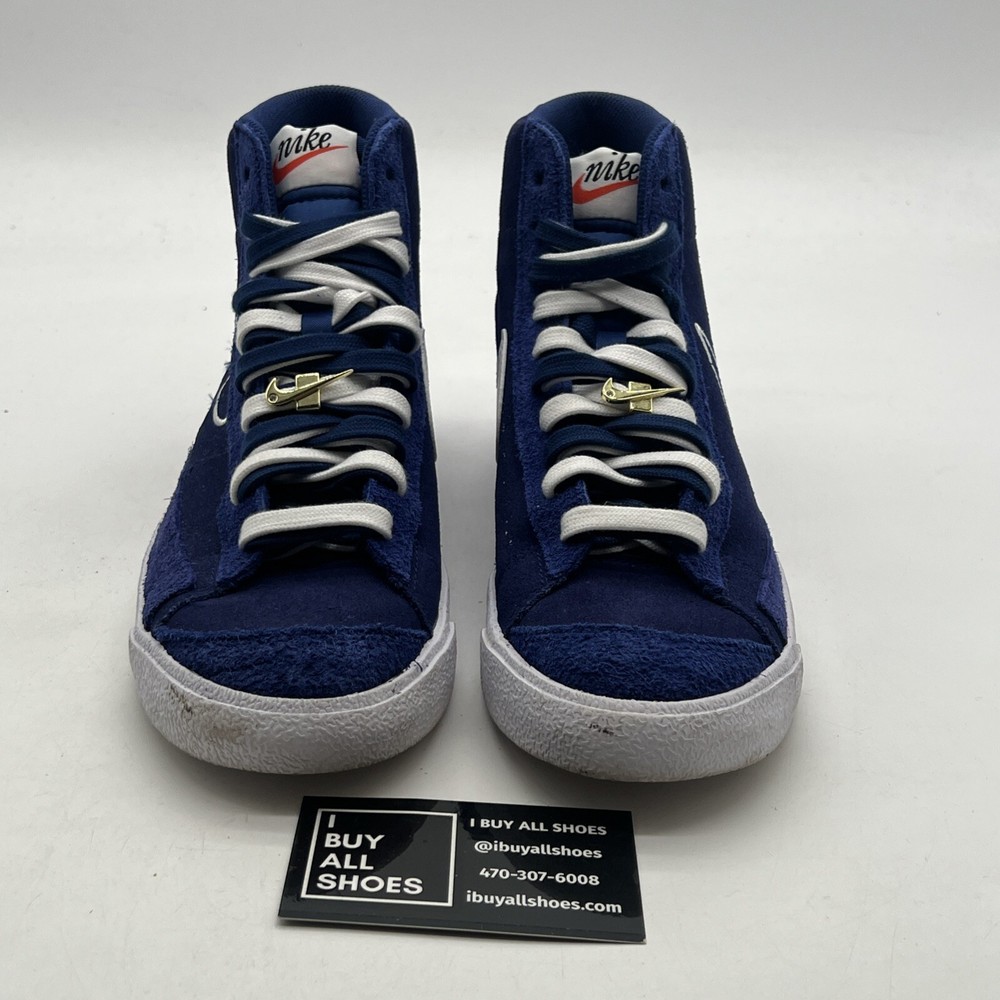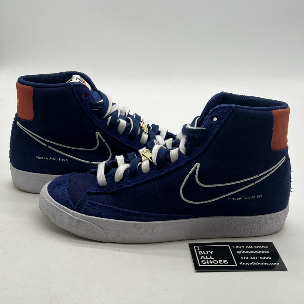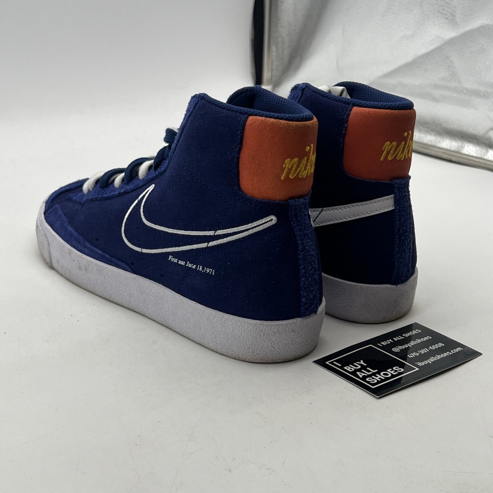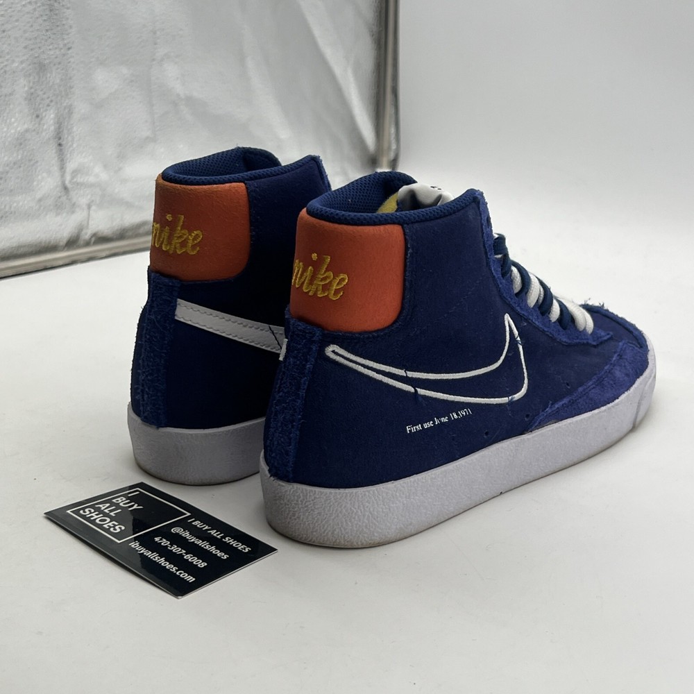 The Nike Blazer '77 Mid First Use in Deep Royal Blue is a men's athletic sneaker with a mid-top shaft style. Featuring a stylish suede upper in a vibrant blue color, this Nike Blazer model released in 2021 is part of the Nike Blazer product line. The shoe is designed with a size 8 fit and showcases the iconic Nike branding, making it a fashionable and functional choice for casual wear or athletic activities. No box 12497