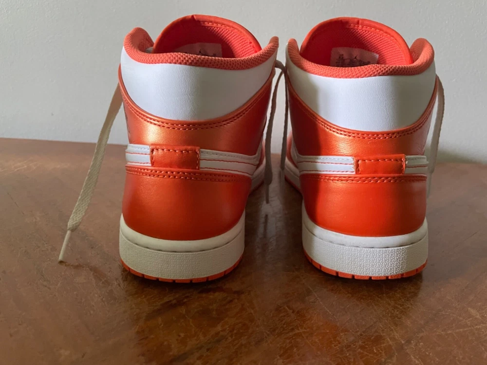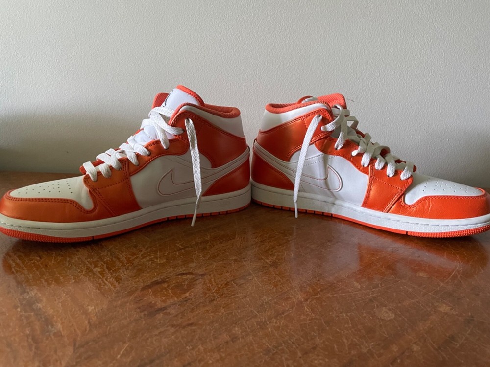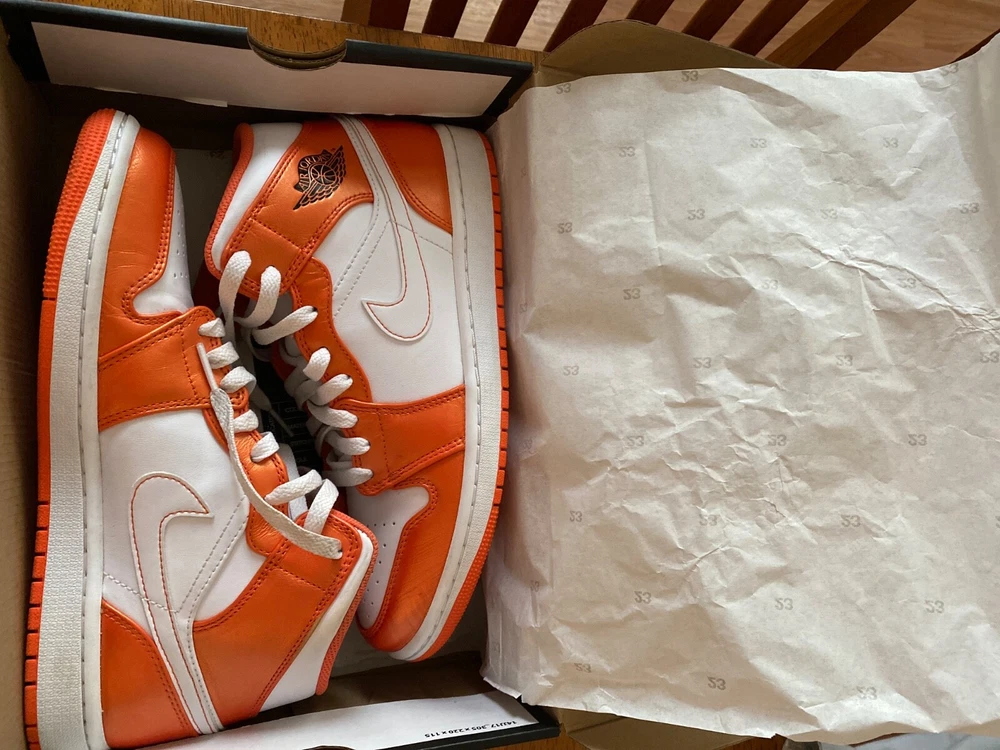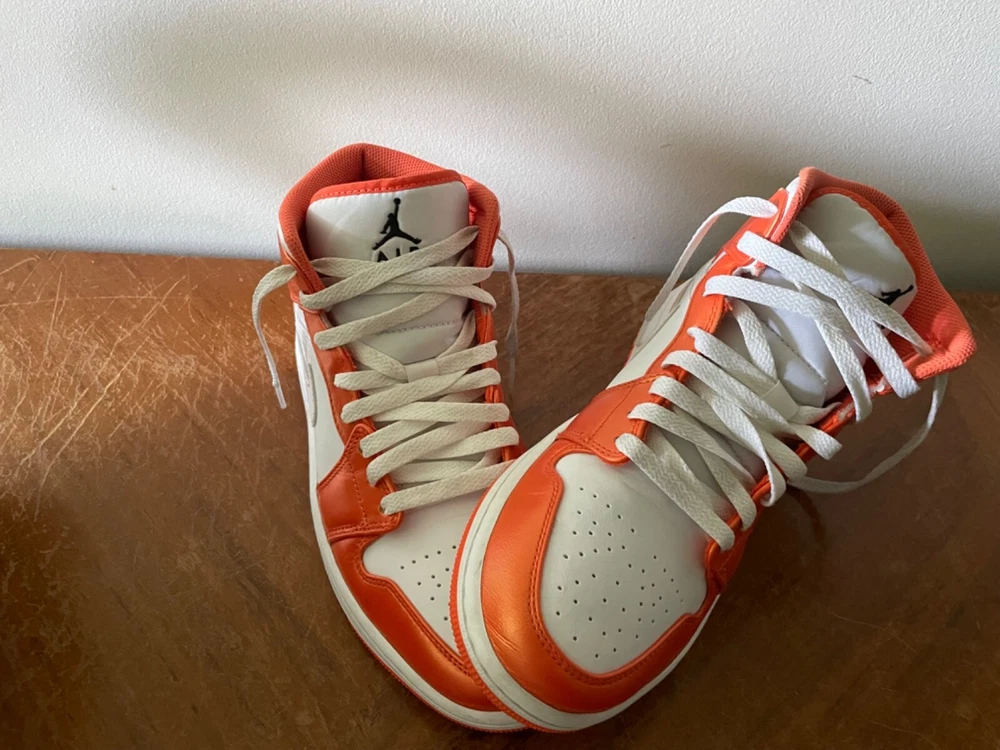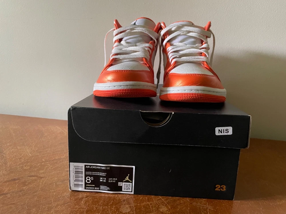 Size 8.5 - Jordan 1 Mid SE Electro Orange 2021. The previous owner, my son, grew out of these in a matter of months and went from a size 8.5 to an 11. Rarely worn. Crease guards included. Like new.