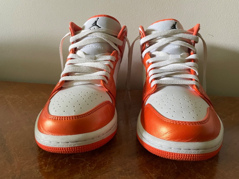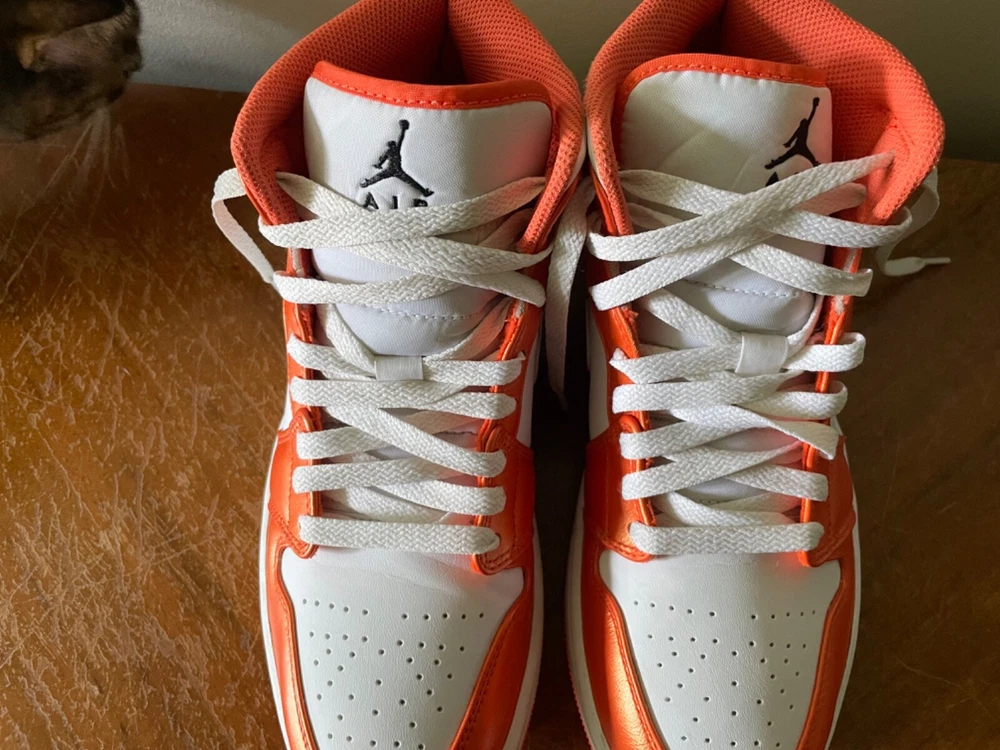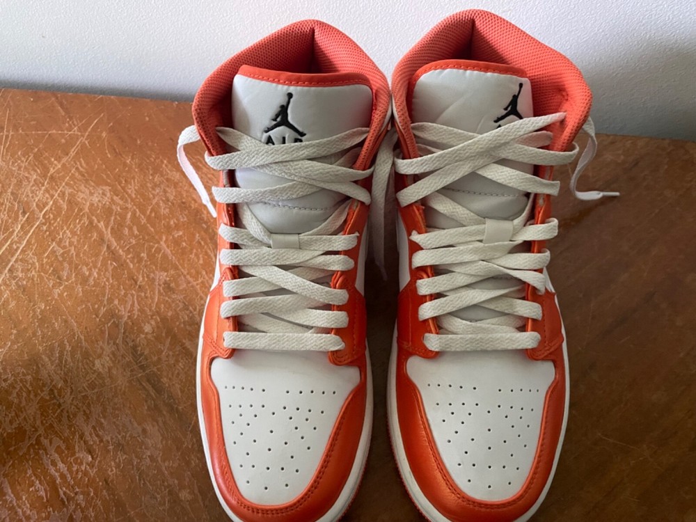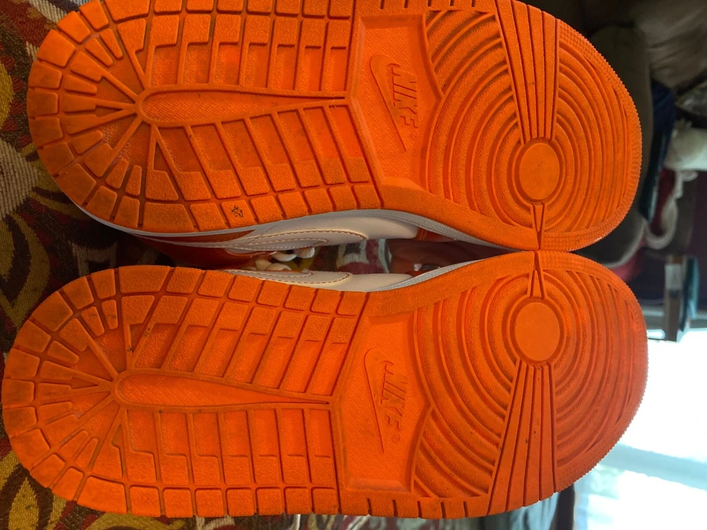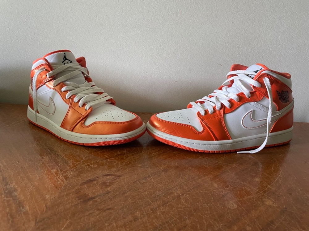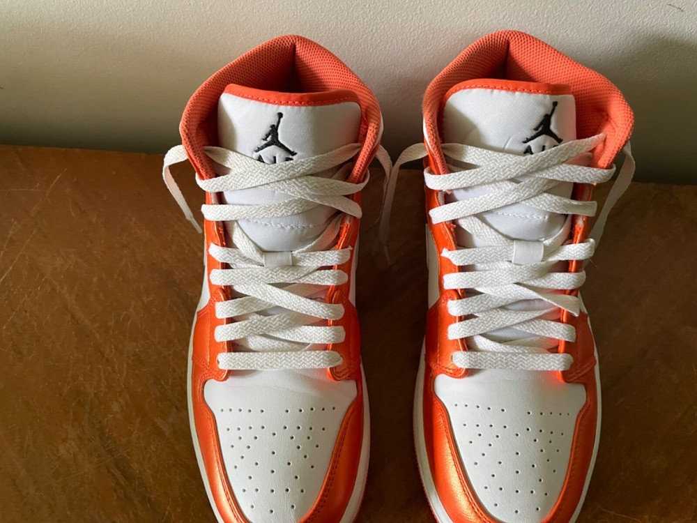 Size 8.5 - Jordan 1 Mid SE Electro Orange 2021. The previous owner, my son, grew out of these in a matter of months and went from a size 8.5 to an 11. Rarely worn. Crease guards included. Like new.