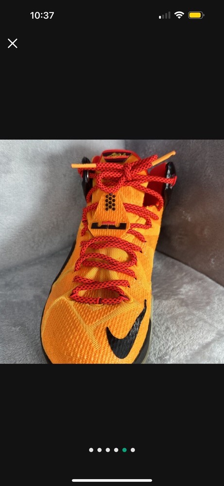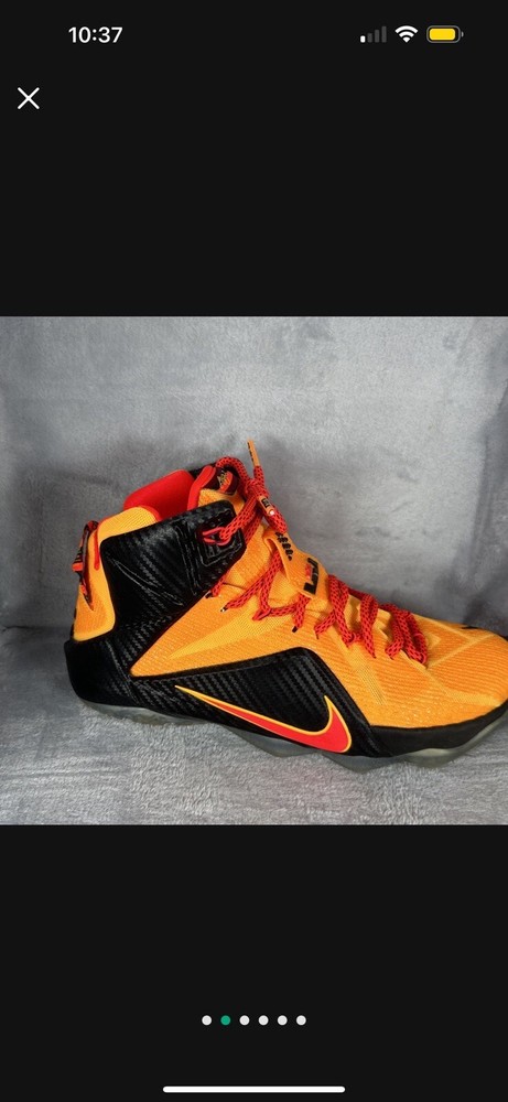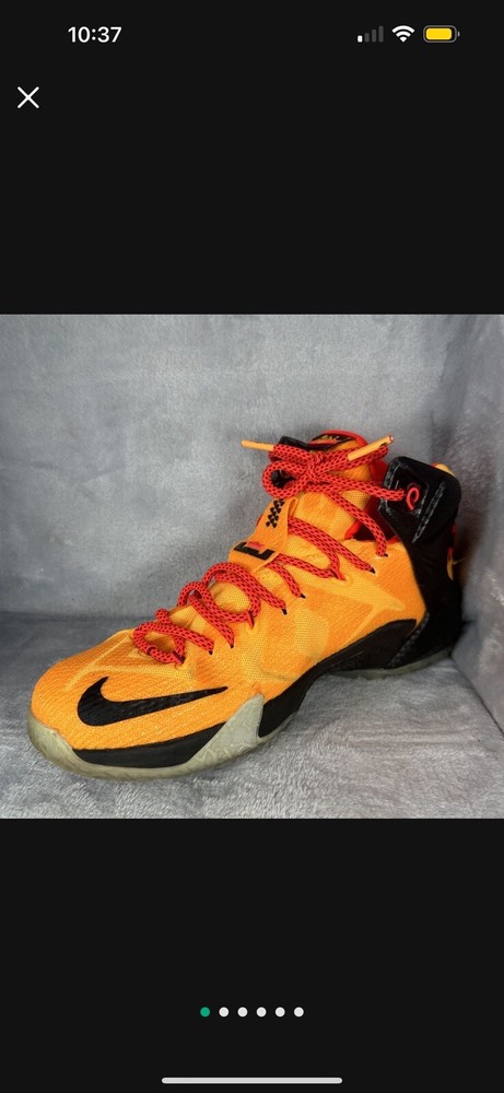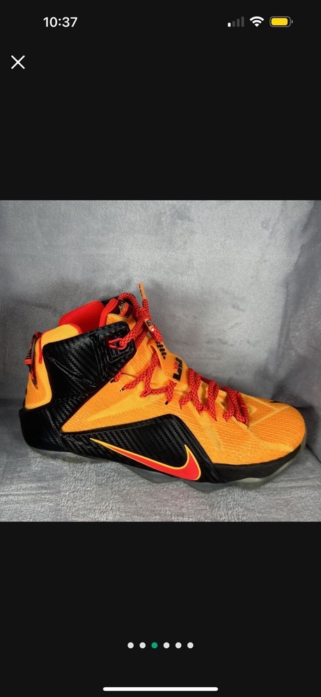 This pair of Nike LeBron 12 sneakers in orange colorway is a great addition to any basketball player's collection. The style code 684593-830 indicates that this particular version was released in 2015 and is part of the Nike LeBron product line. It is a pre-owned item in size 8.5 and has been well taken care of. The sneaker's design features a breathable mesh upper and a responsive cushioning system that helps with agility and speed on the court. Its stylish appearance makes it a versatile option for casual wear as well.