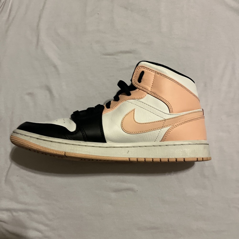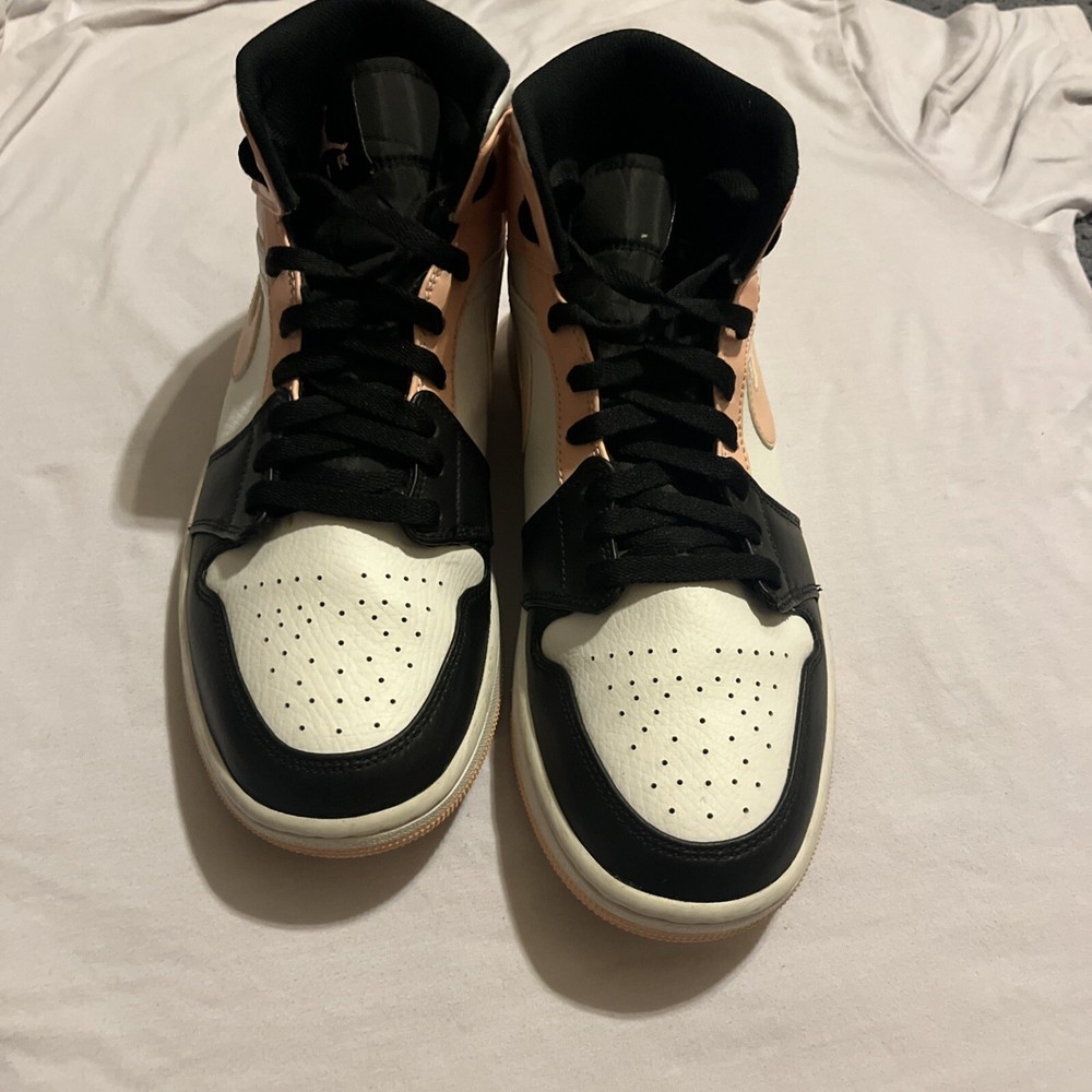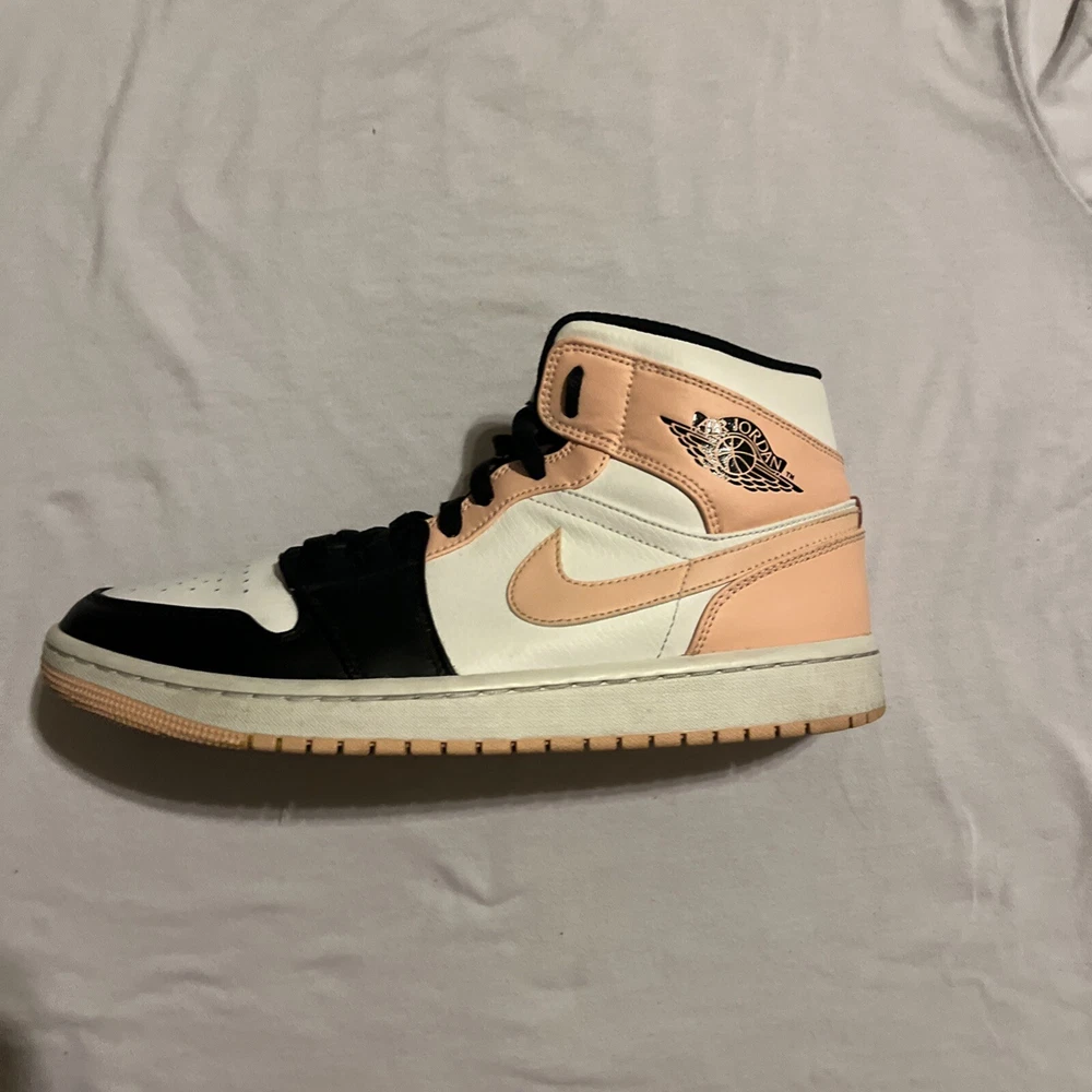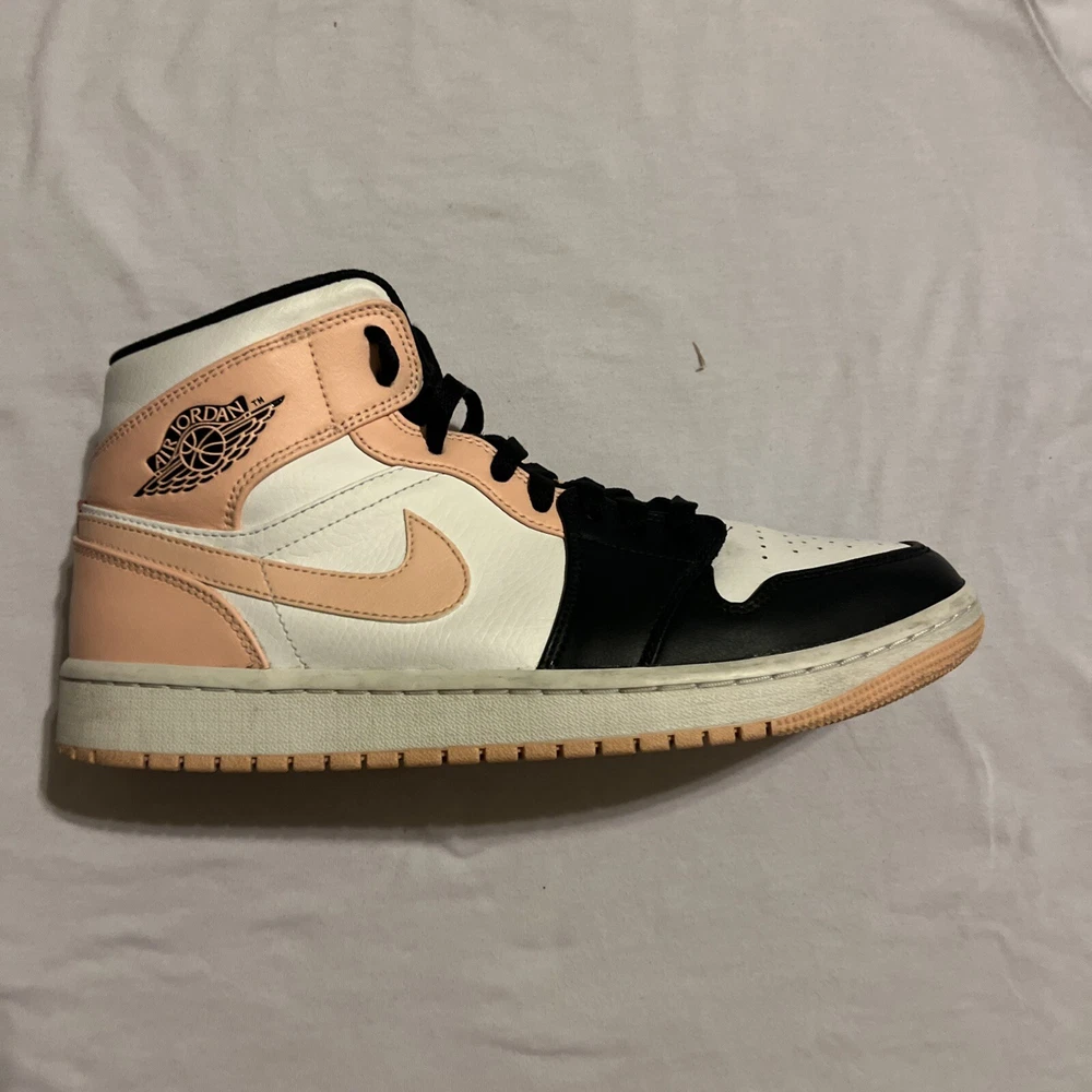 Elevate your sneaker game with these stylish Air Jordan 1 Mid Crimson Tint sneakers. Crafted with a white leather upper material, these sneakers feature a mid-top shoe shaft style and a striking orange and black colorway. The sneakers are part of the iconic Air Jordan product line and boast a style code of 554724-133. These sneakers are perfect for any athletic occasion and are sure to turn heads with their unique design. The size 9.5 sneakers are designed for men and are manufactured by Jordan. Don't miss out on the chance to add these Crimson Tint sneakers to your collection. These Jordan’s are lightly used, little to no creases, some stars missing.