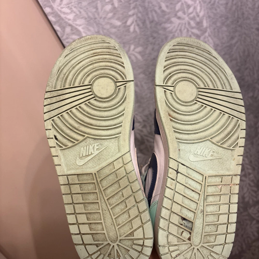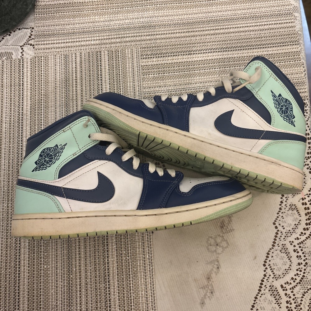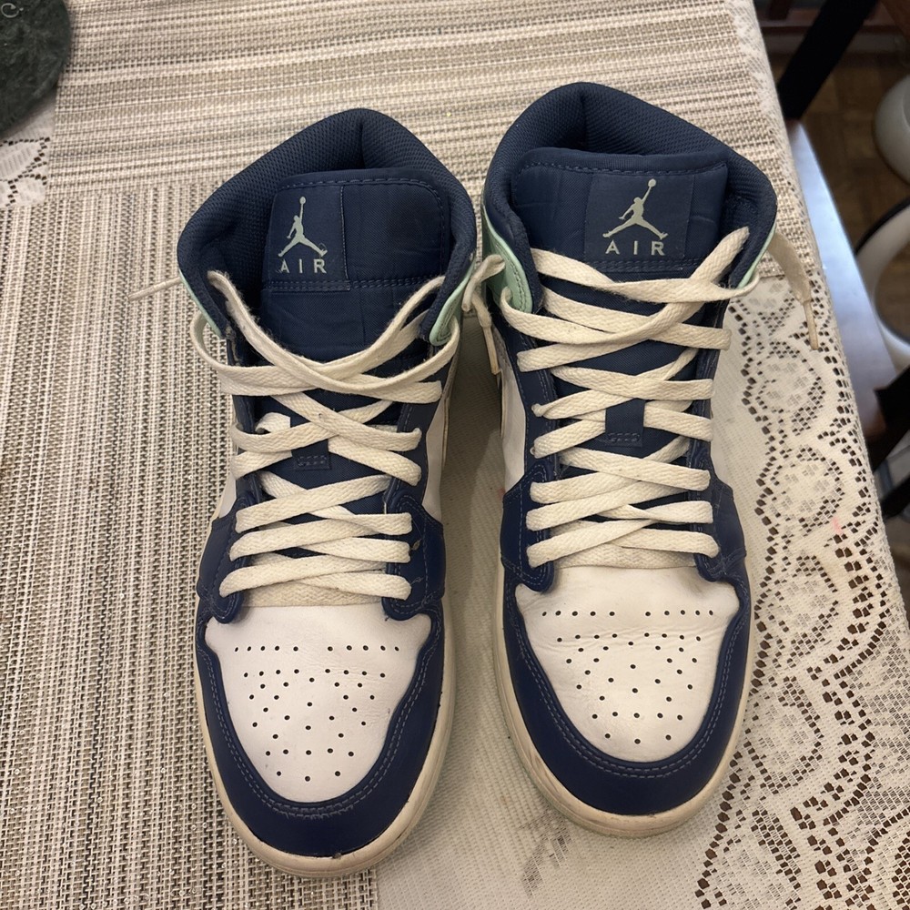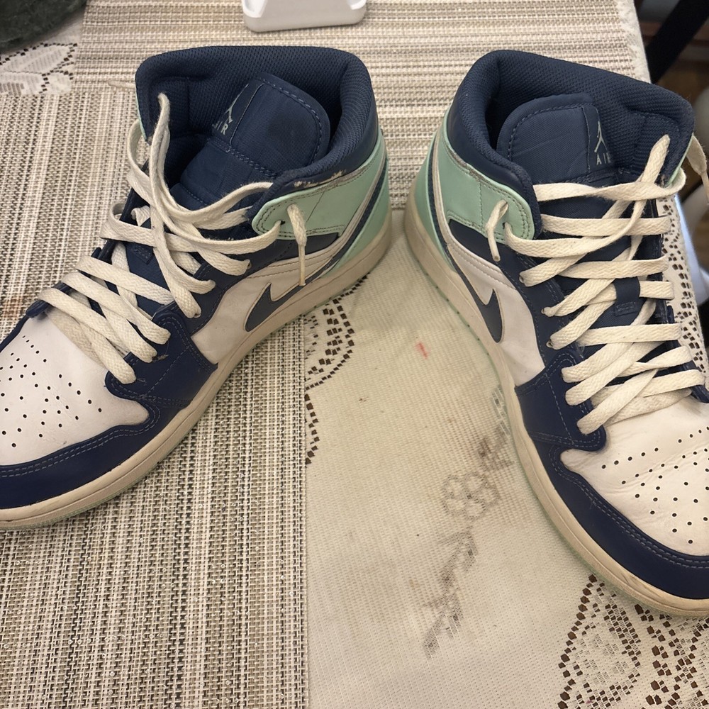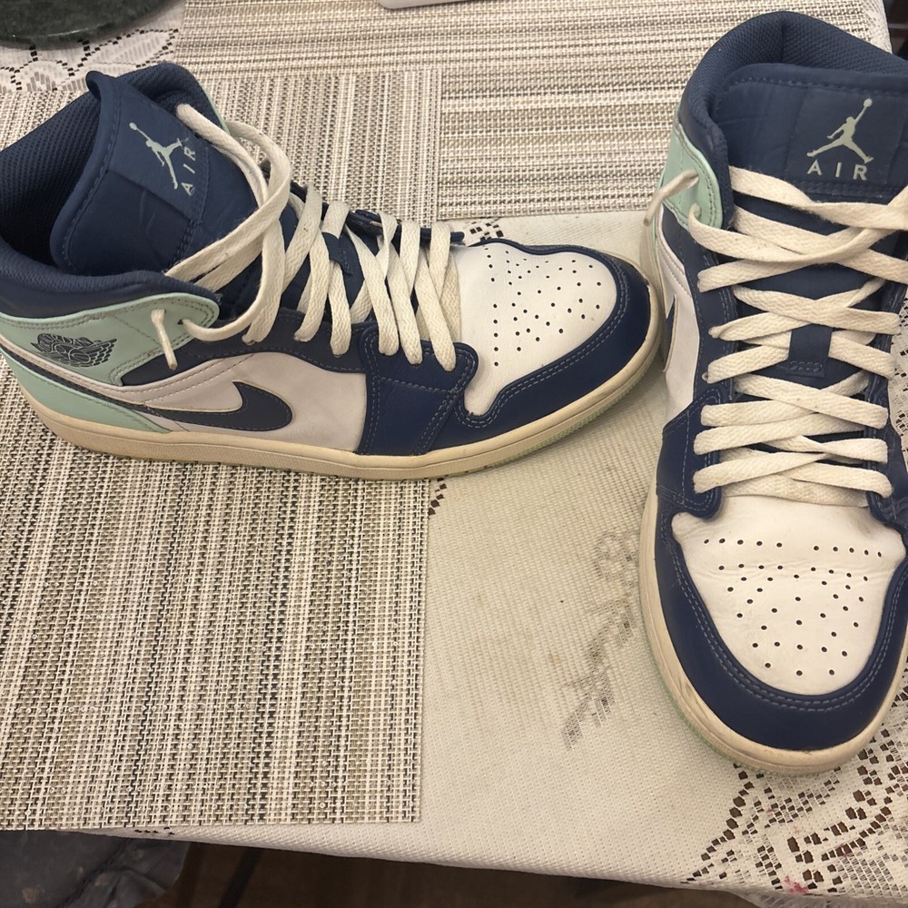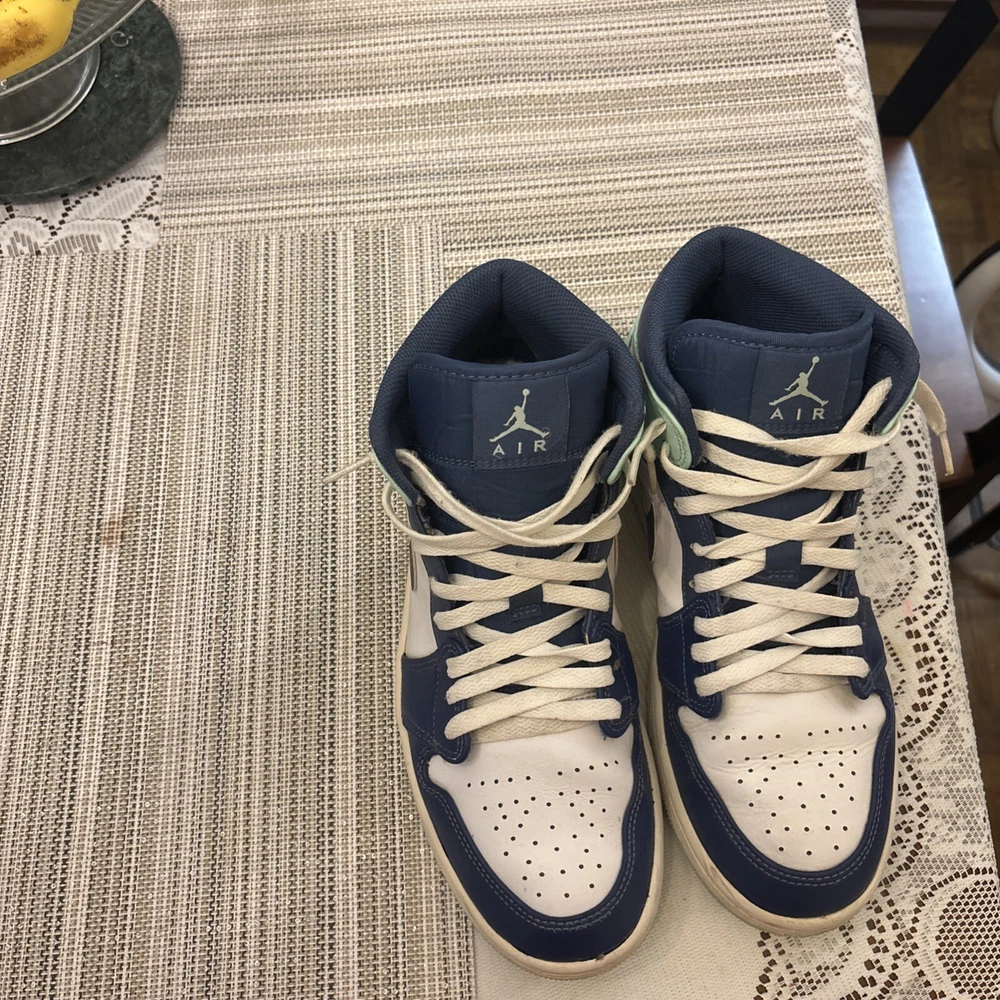 Jordan 1 mid light blue on the back dark blue Nike logo dark plus on the front...