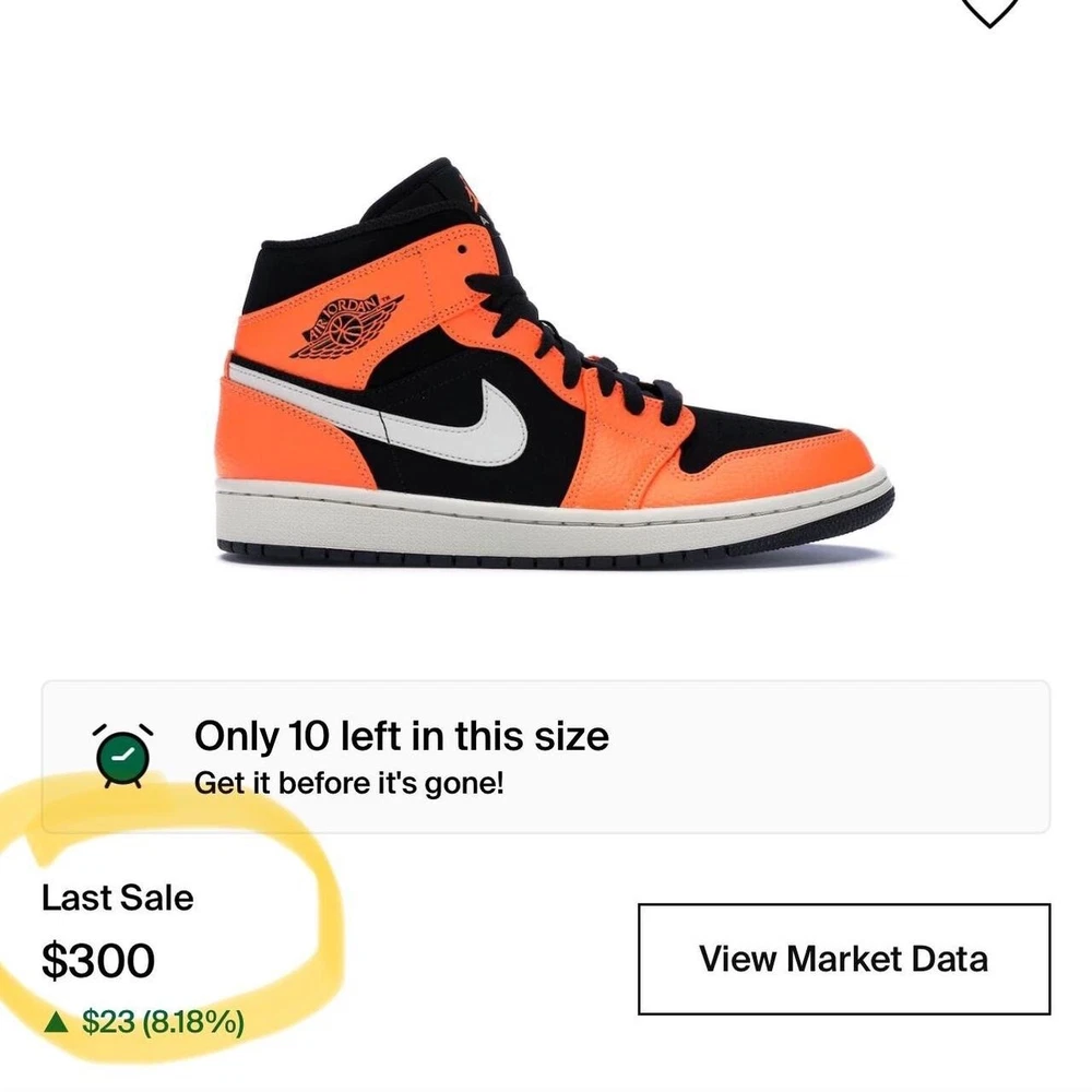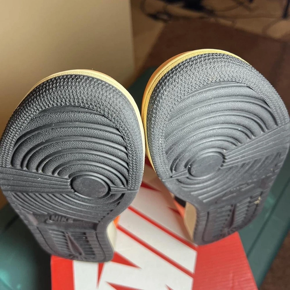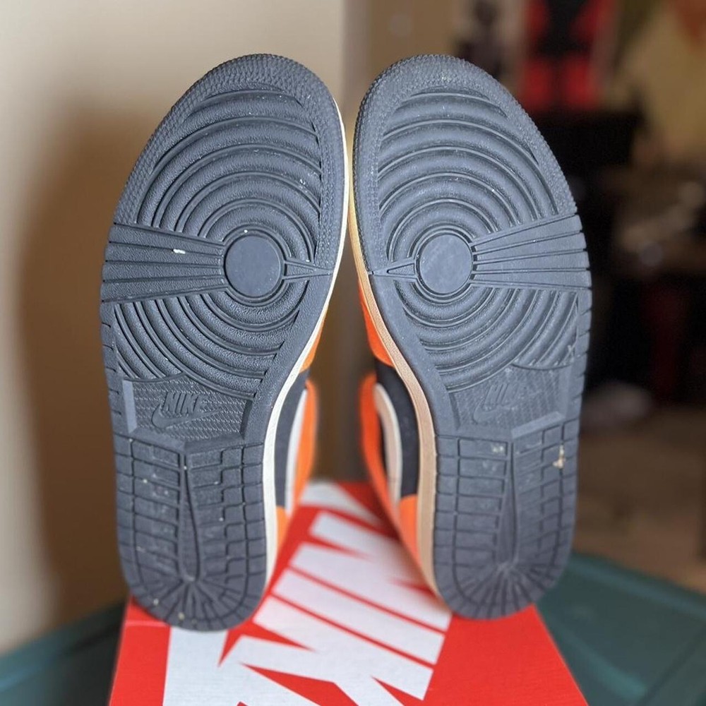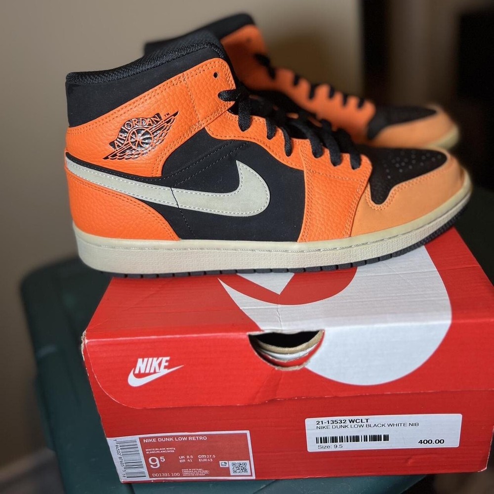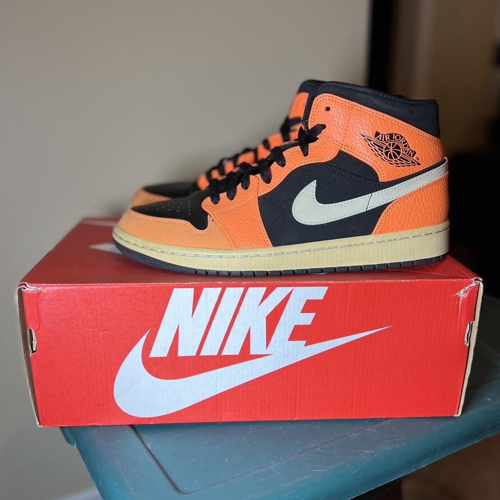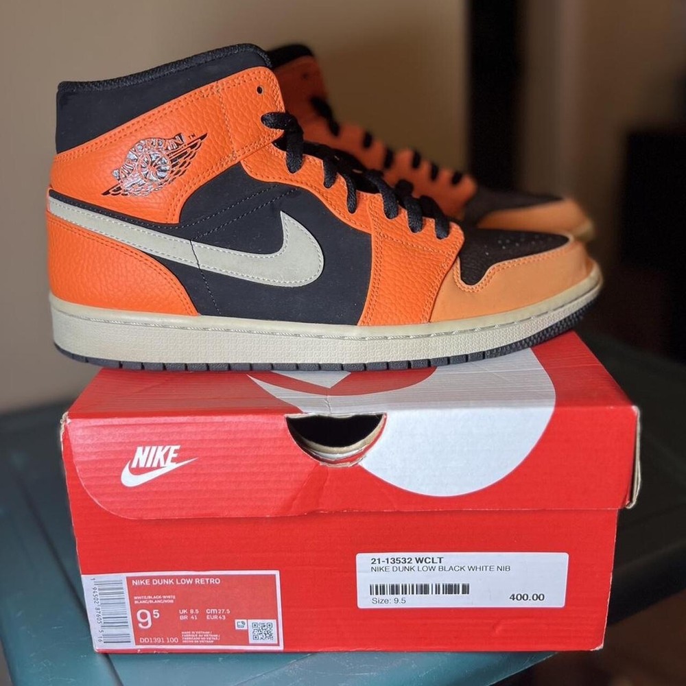 2018 Jordan 1 Mid ‘Black Cone’ VNDS, replacement box. see below for details on condition Last Sale on StockX brand new: $300 Note: Please keep in mind they are almost 6 years old, so they do have some yellowing, they’re a lil dusty and discoloring due to sun exposure and being displayed. S If you specialize in restoration, you’ll be able to clean the shoe to brand new condition. IYKYK. NO STAR LOSS. Size 9.5M/ 11W This instantly recognizable Orange Black iteration of the Air Jordan 1 Mid follows in the footsteps of the Shattered Blackboard version from 2015. The unique colorway consists mostly of orange leather overlays and black suede underlays accented by a white Swoosh and midsole. A black outsole and laces bring the look together. Super rare