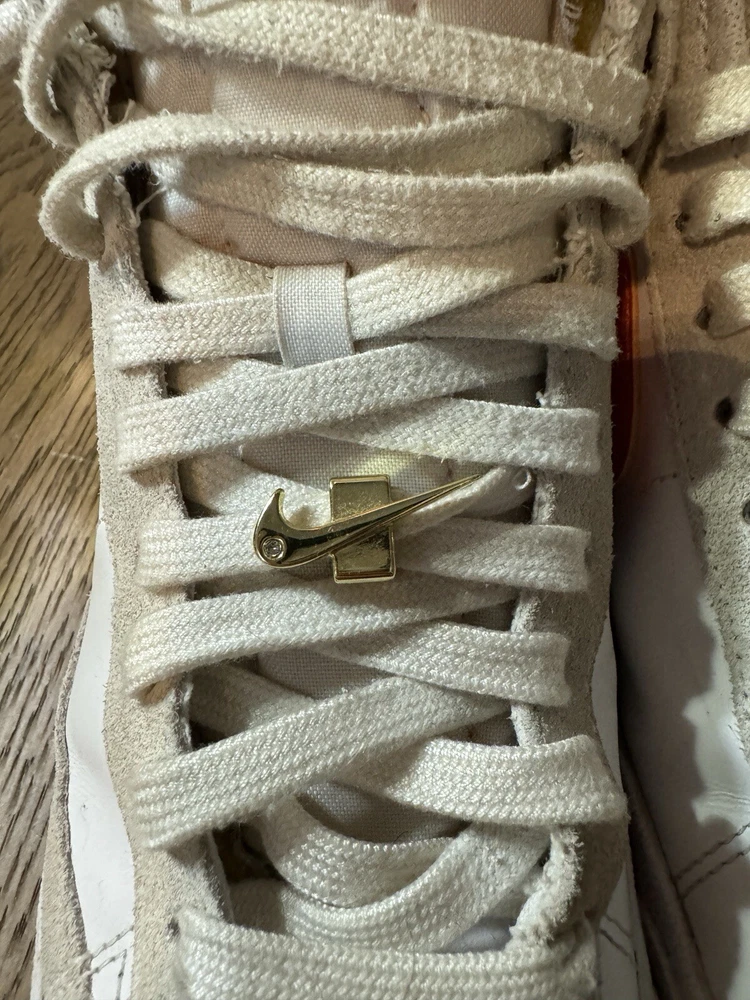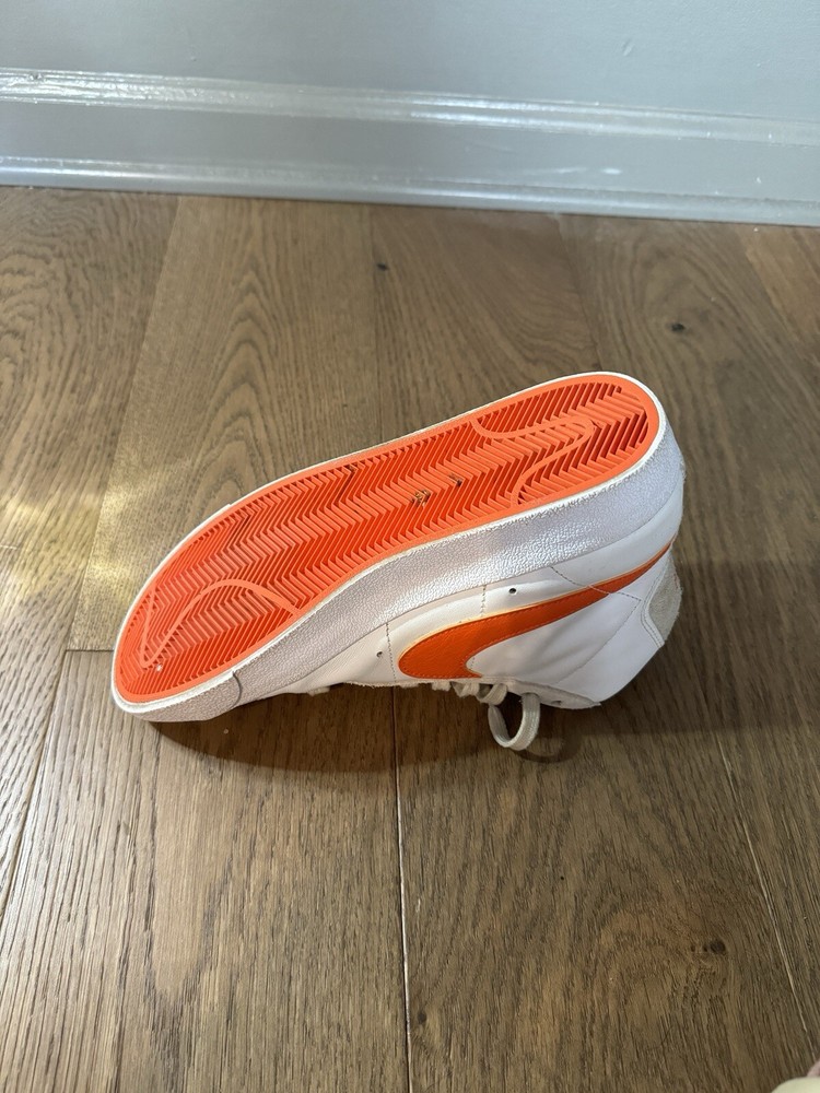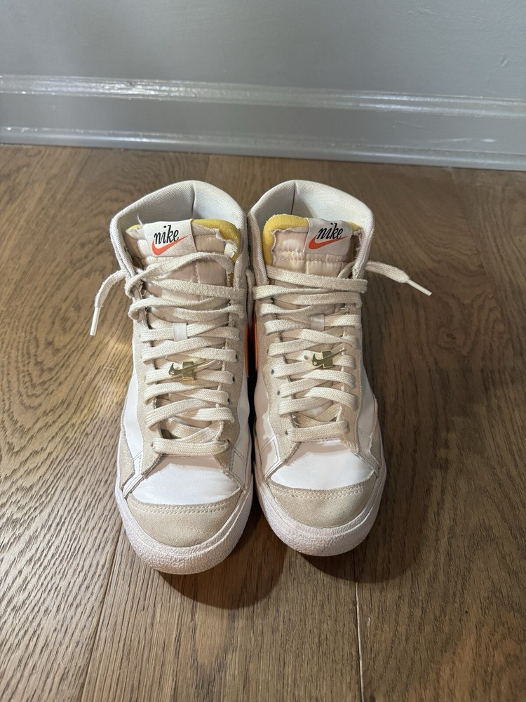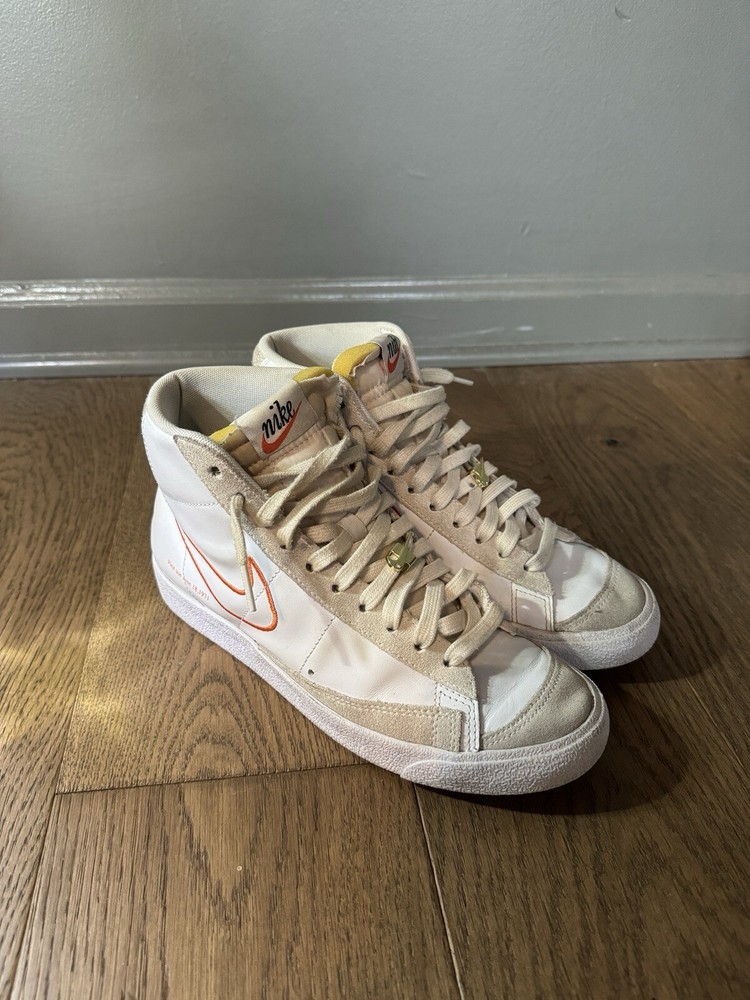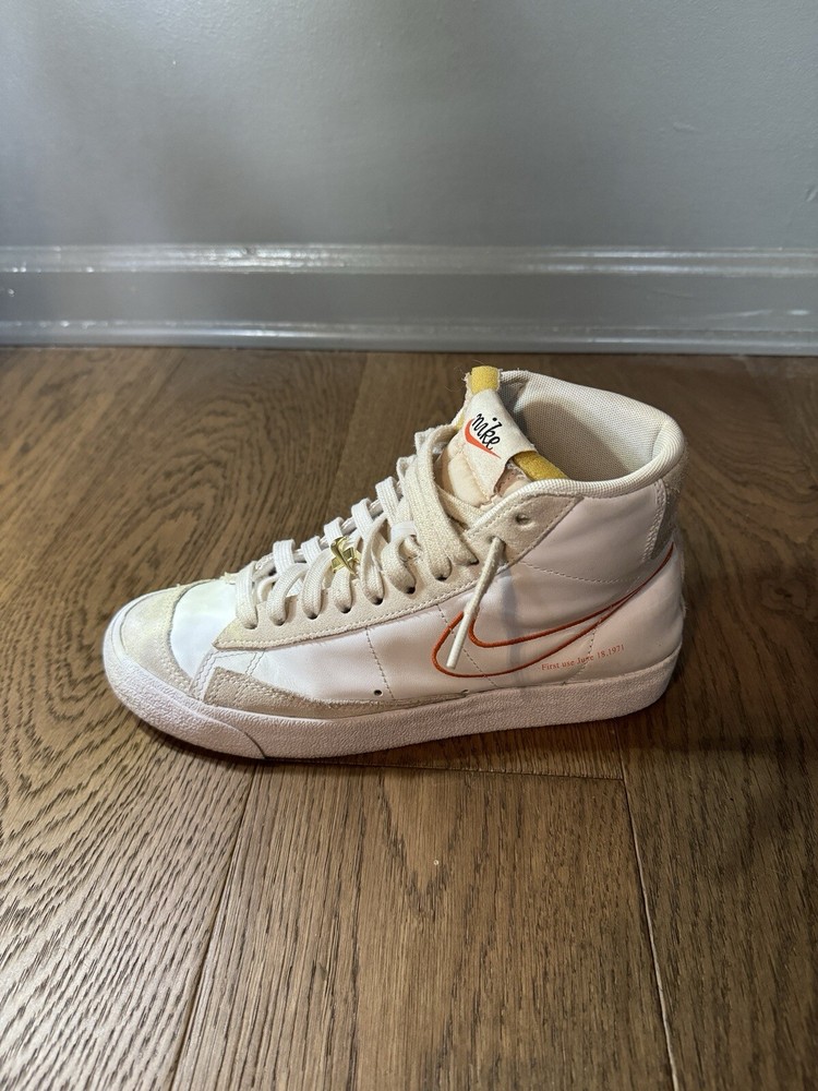 Used - Like New Condition Comes with original box Elevate your sneaker game with these Nike Blazer '77 SE Mid First Use shoes. The stylish mid-top design and white leather upper material make these shoes a perfect addition to any wardrobe. The shoes feature a size 9.5 fit, making them perfect for women who want to make a statement with their footwear. These shoes are part of the Nike Blazer product line and come in a stylish white color with orange accents. They were released in 2021 and have a style code of Dh6757-100. These athletic shoes are perfect for those who want to stay comfortable while still looking fashionable. Get your hands on these sneakers today and step up your shoe game!