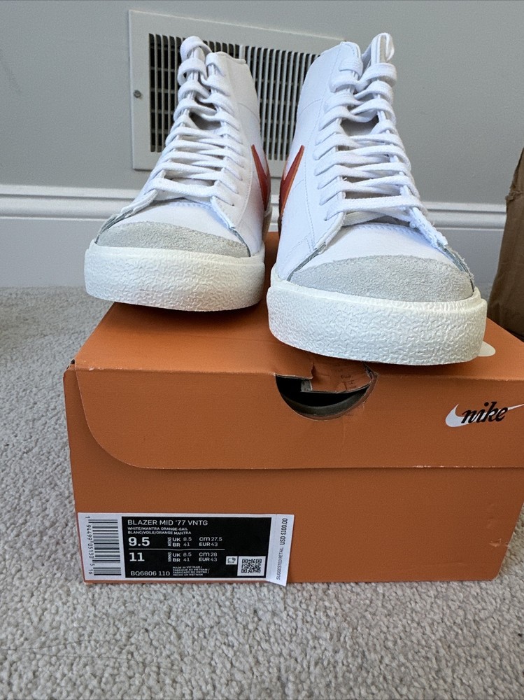 Size 9.5 Nike Blazer Mid '77 VNTG White Mantra Orange Sail Grey BQ6806-110 Men's. Condition is New with box. Shipped with UPS Ground.