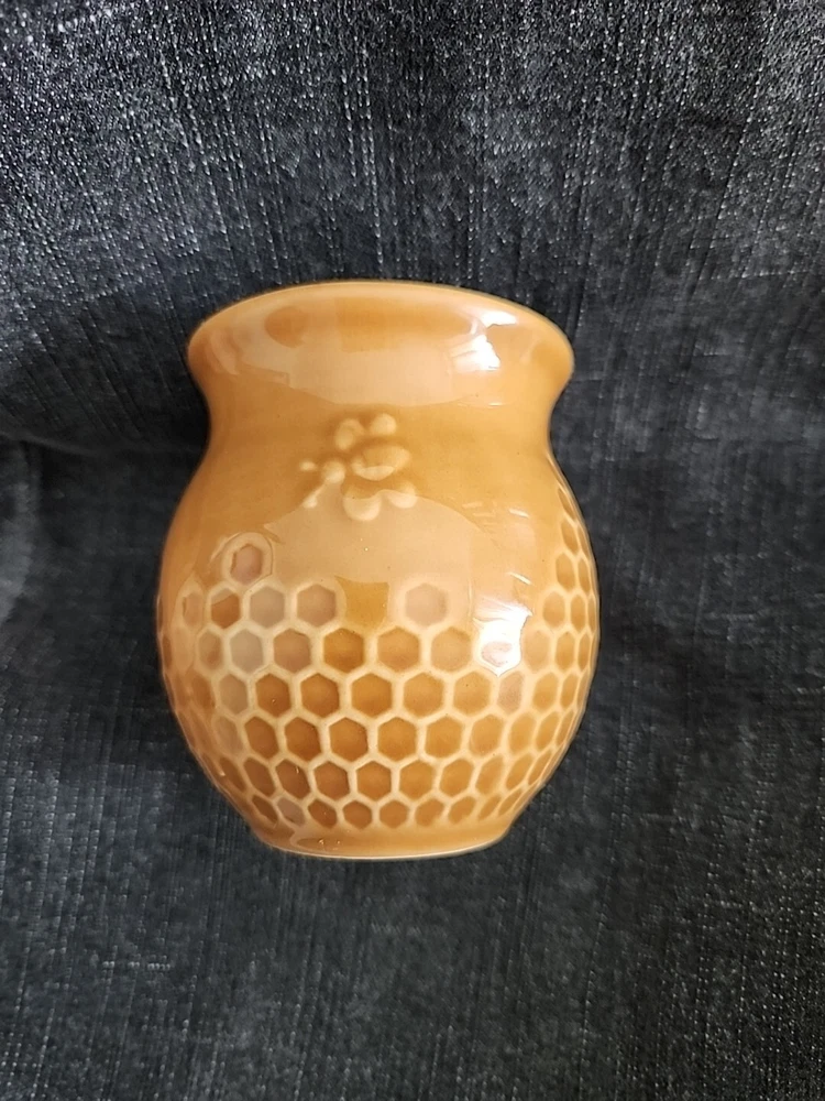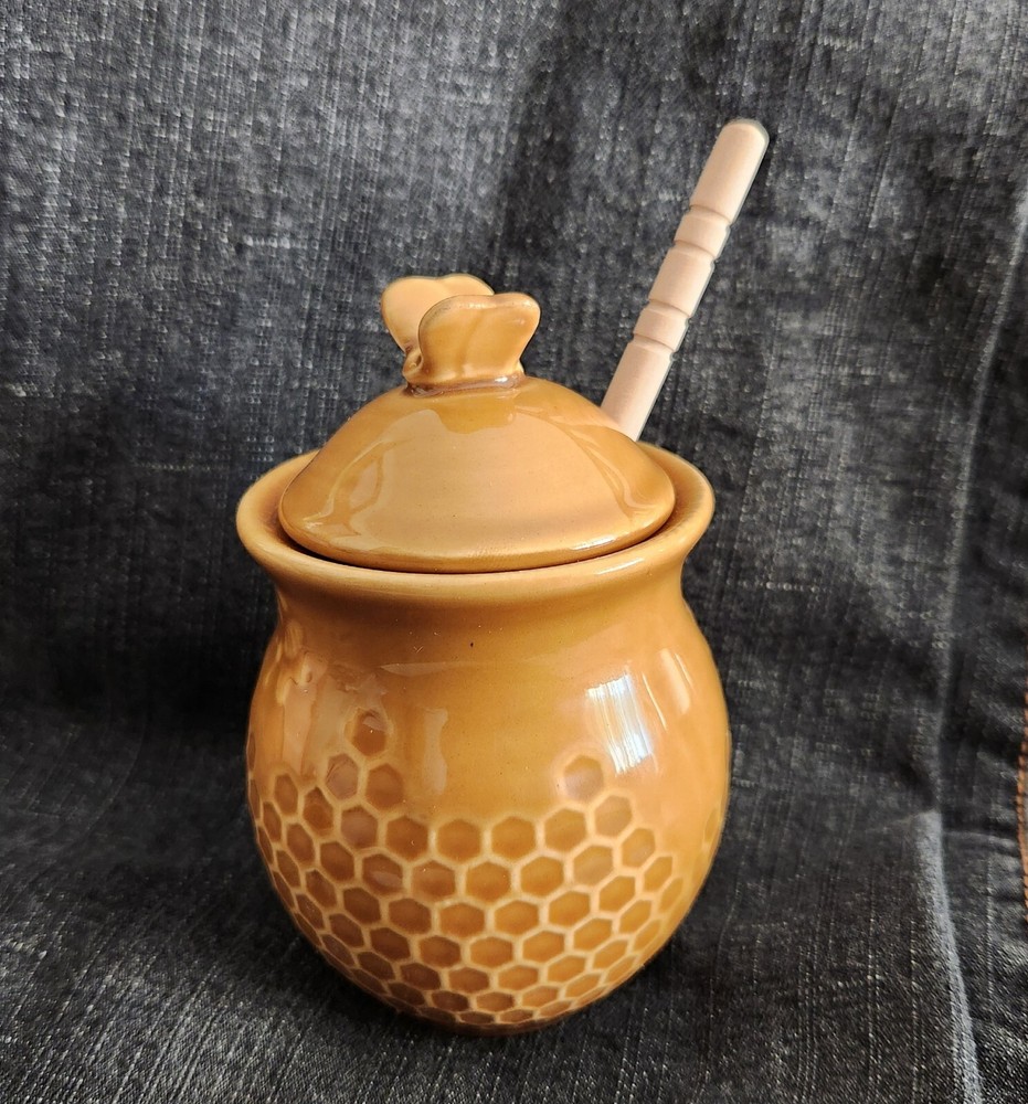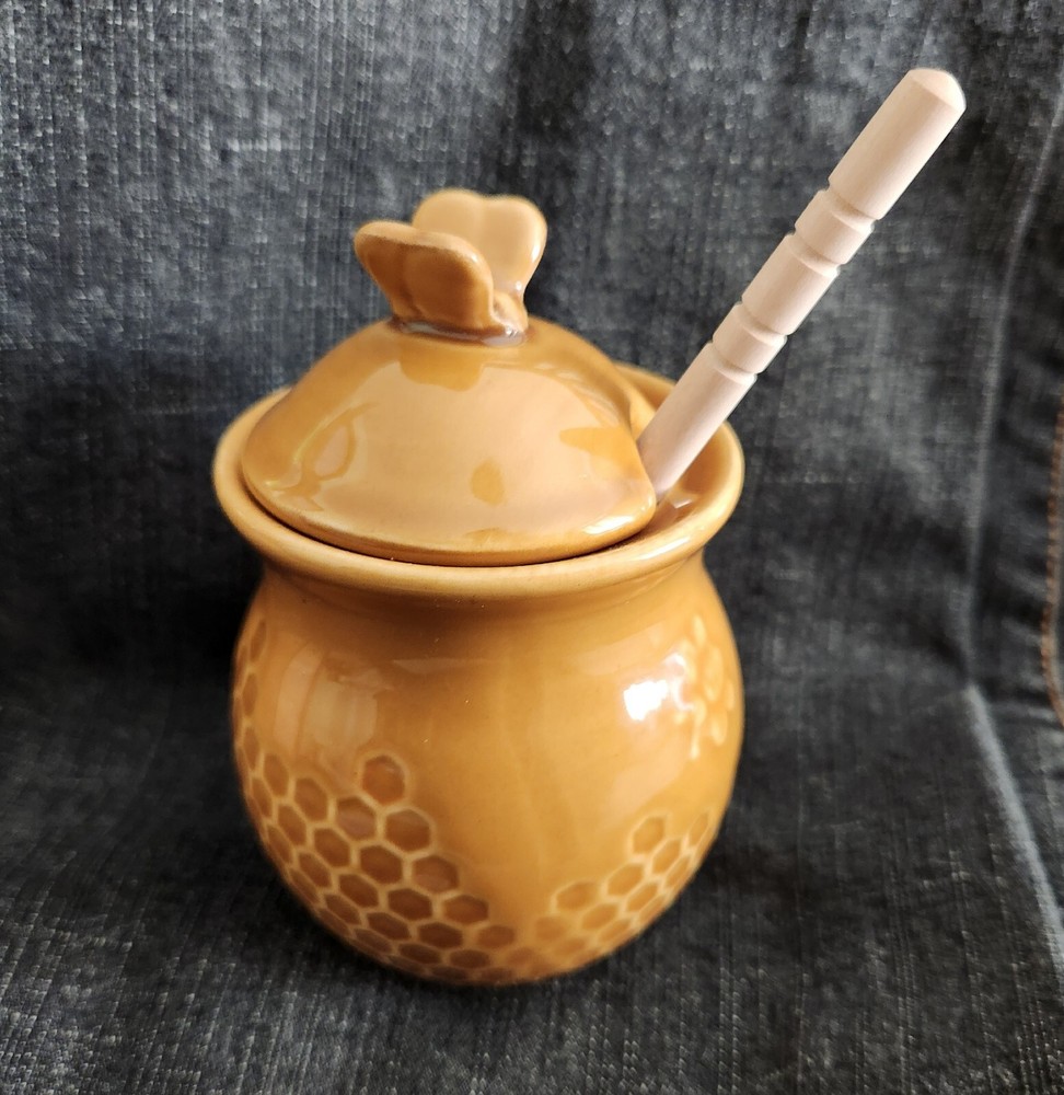 Small 3 Piece Yellow with Decorative Bees Stoneware Honey Jar By Creative co-op. Pre-owned clean and in excellent condition...