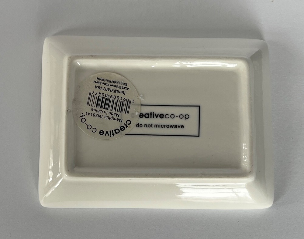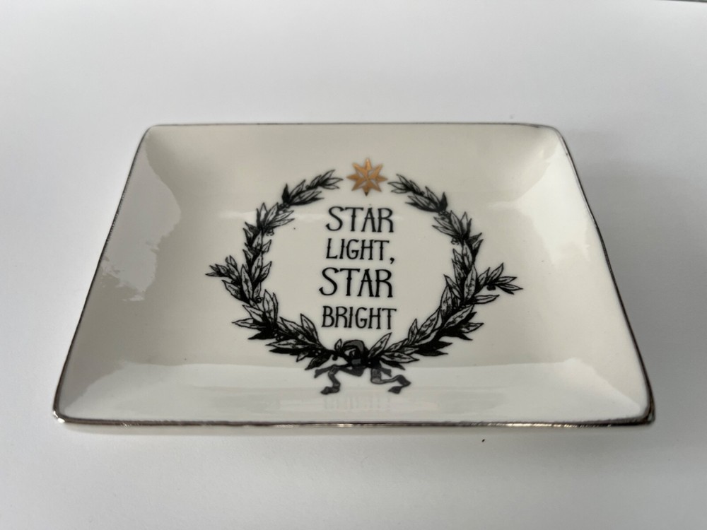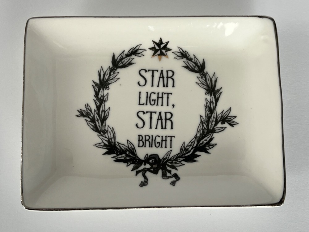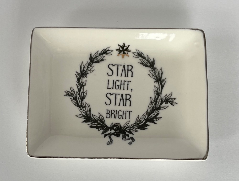 Sweet rectangular jewelry or trinket dish in white with electroplate star and rim and black lettering "Star Light Star Bright". The star is gold and the rim is silver. Measures approximately 3" x 4". Made by Creative Co-Op. Original sticker is still on bottom. Will be carefully packaged for safe shipment to you.