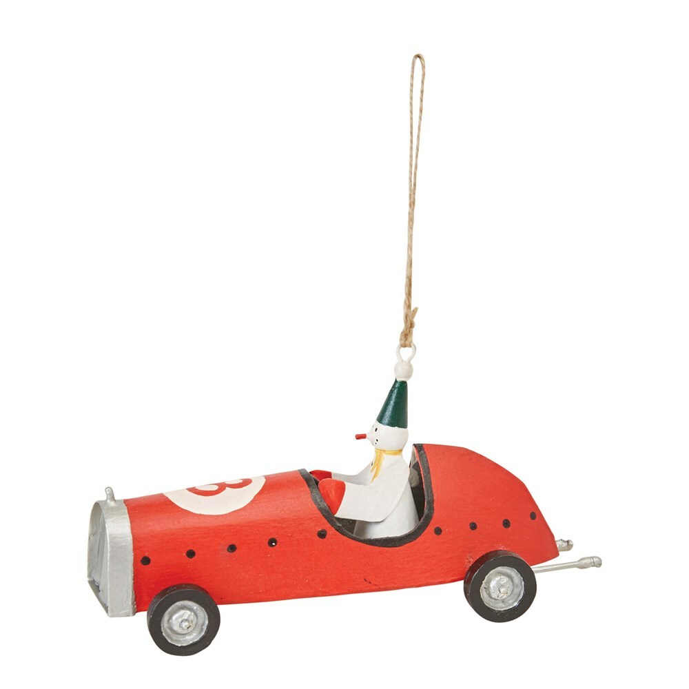 Snowman in Retro Tin Race Car Retro inspired design, this all tin race care #8 is driven by a snowman. Ornament is 5.25" long with hanging cord attached. New
