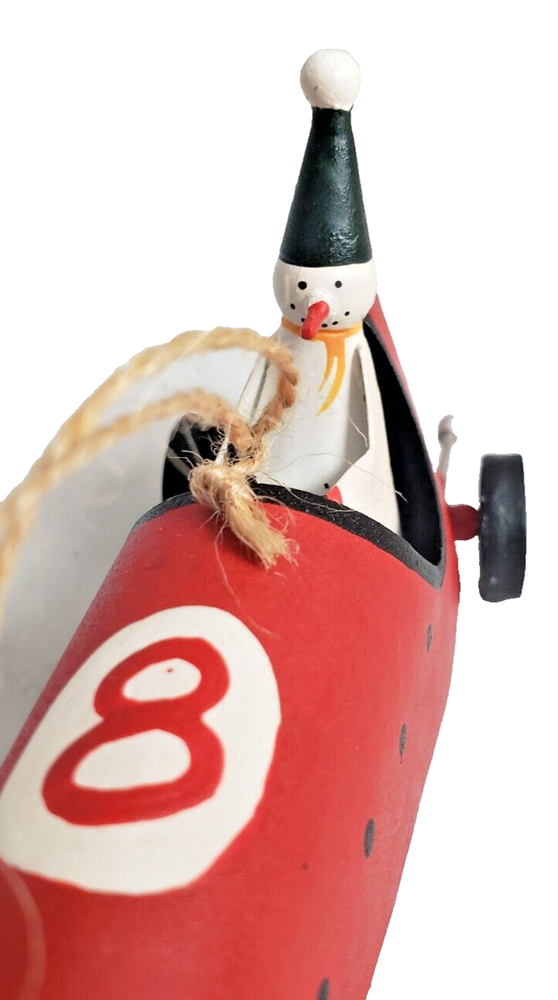 Snowman in Retro Tin Race Car Retro inspired design, this all tin race care #8 is driven by a snowman. Ornament is 5.25" long with hanging cord attached. New...