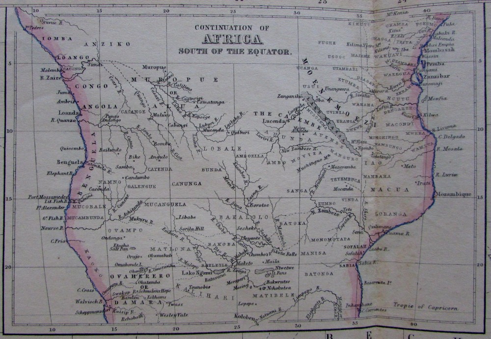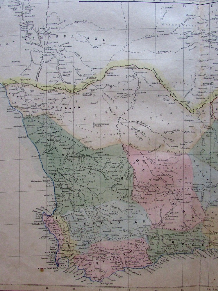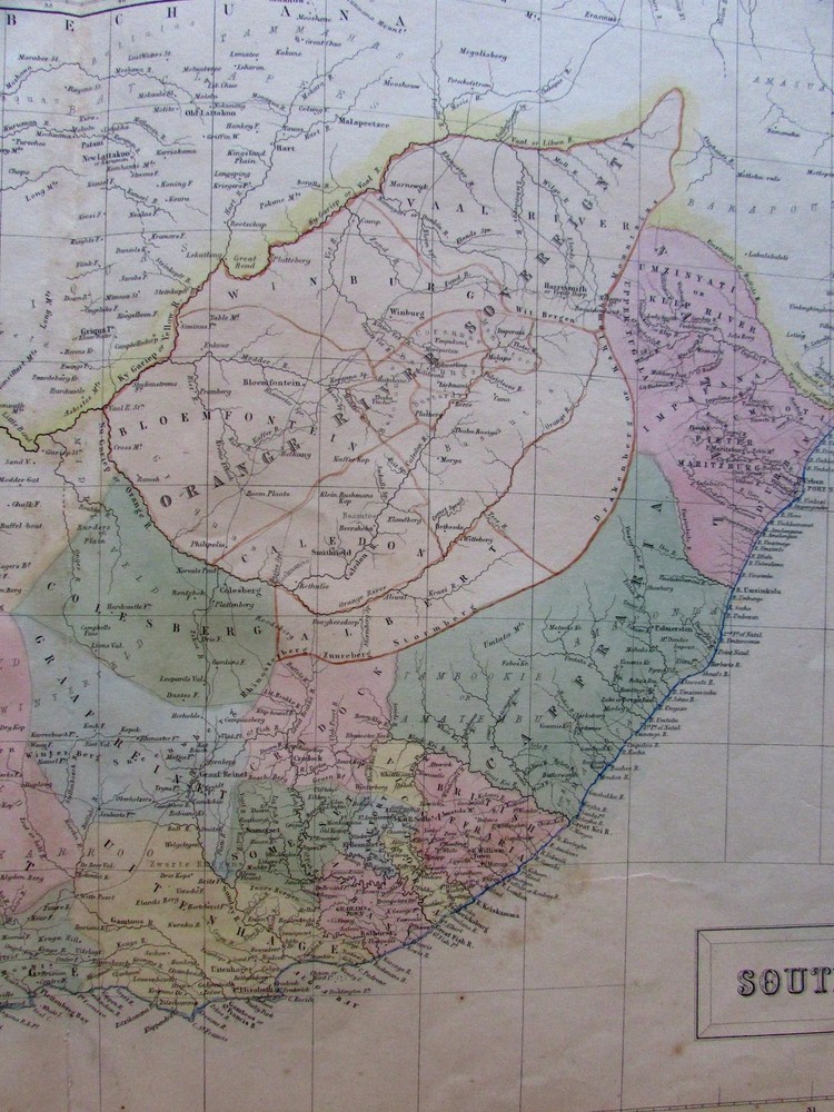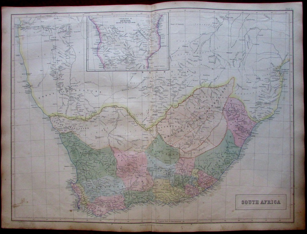 South Africa Orange Free State c.1860 A & C Black Bartholomew map South Africa Orange Free State c.1860 A & C Black Bartholomew map South Africa. Continuation of Africa South of the Equator. (Cape of Good Hope / Cape Town). Issued Edinburgh c.1850-60 by A & C Black. Constructed and engraved by J. Bartholomew. Mid-19th century engraved map, with lovely hand color. Nice looking example, pleasing age patina, 1 1/2" split at bottom centerfold closed on reverse with archival tape, any minor age flaws easy to overlook or forgive. Sheet Measures c. 17 1/2"H x 23 3/4"W. Engraved Area Measures c. 16 1/4"H x 22 1/8"W. Cartographic Reference(s): Tooley's Dictionary of Mapmakers , vol. #, pp. ###. [R19458].