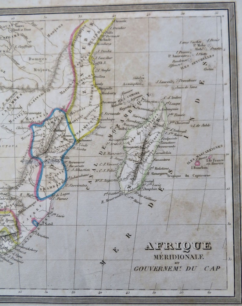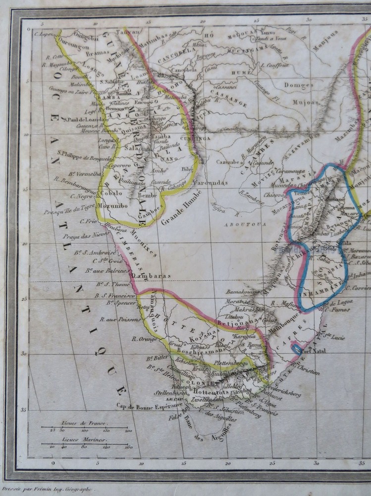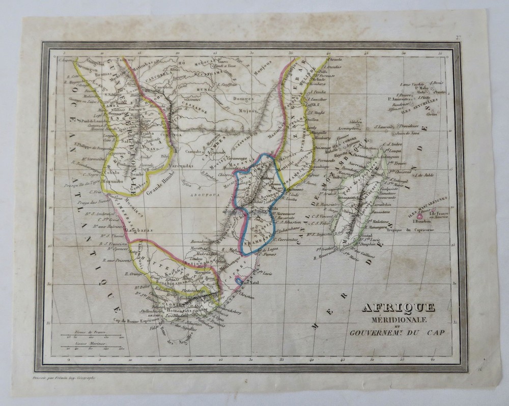 Southern Africa Cape Colony Boer Republics Orange Free State c. 1840 Fremin map Southern Africa Cape Colony Boer Republics Orange Free State c. 1840 Fremin map Afrique Meridionale et Gouvernemt. du Cap. (Old Maps, 19th Century Maps, Africa, South Africa, Cape Colony, Boer Republics, Madagascar, Mozambique, Port Natal, Bourbon Island). Issued c.1840, France by Fremin. Interesting mid-19th century engraved map, with original outline hand color. Scattered light foxing. Sheet measures c. 9 1/8" H x 11 1/2" W. Printed area measures c. 7 7/8" H x 10" W. [R35691].