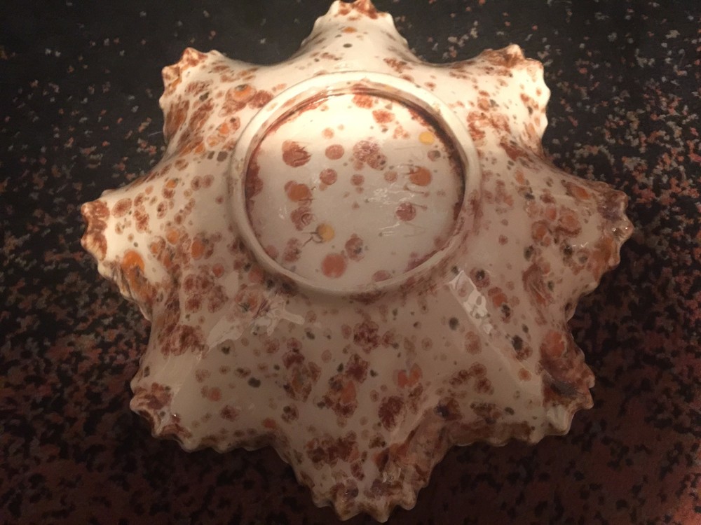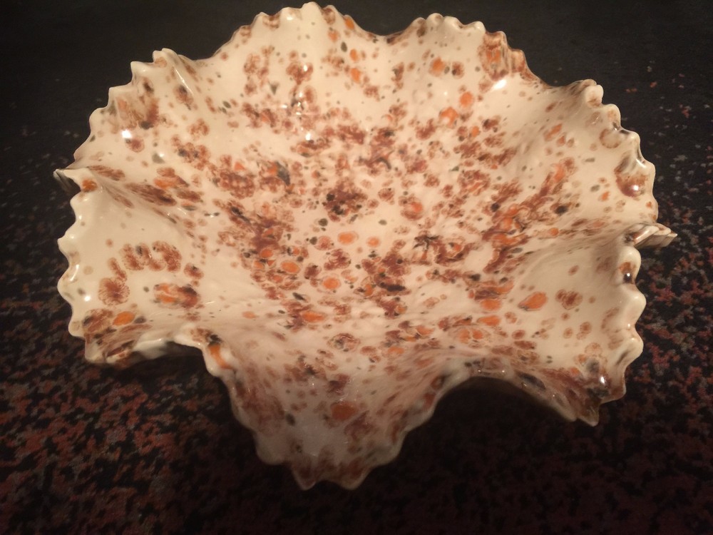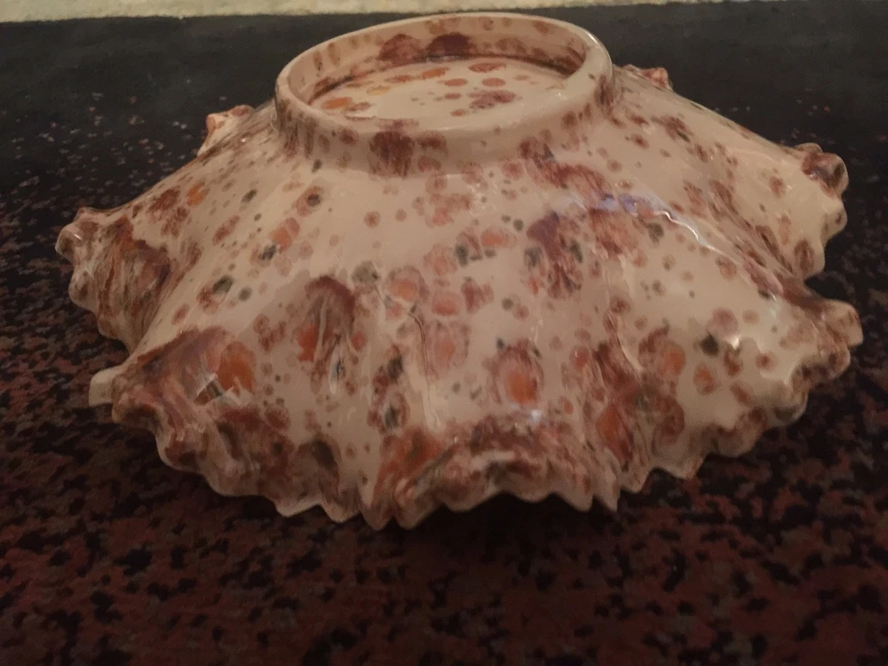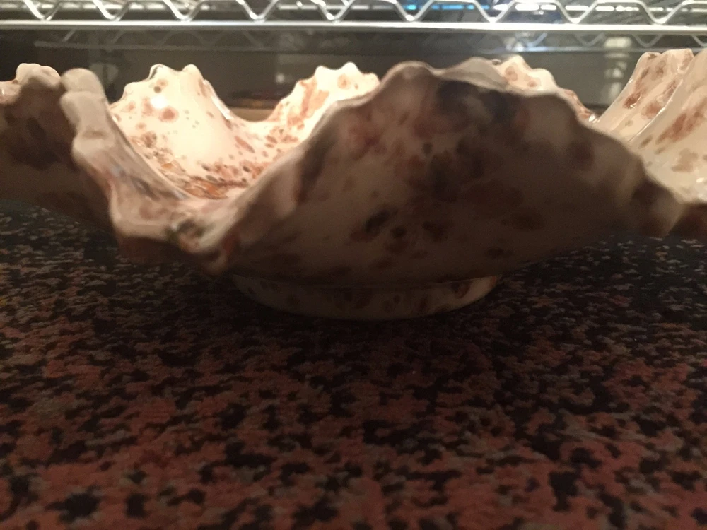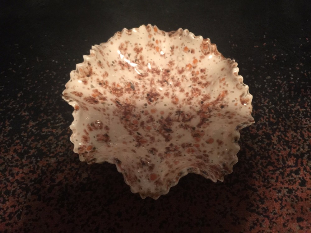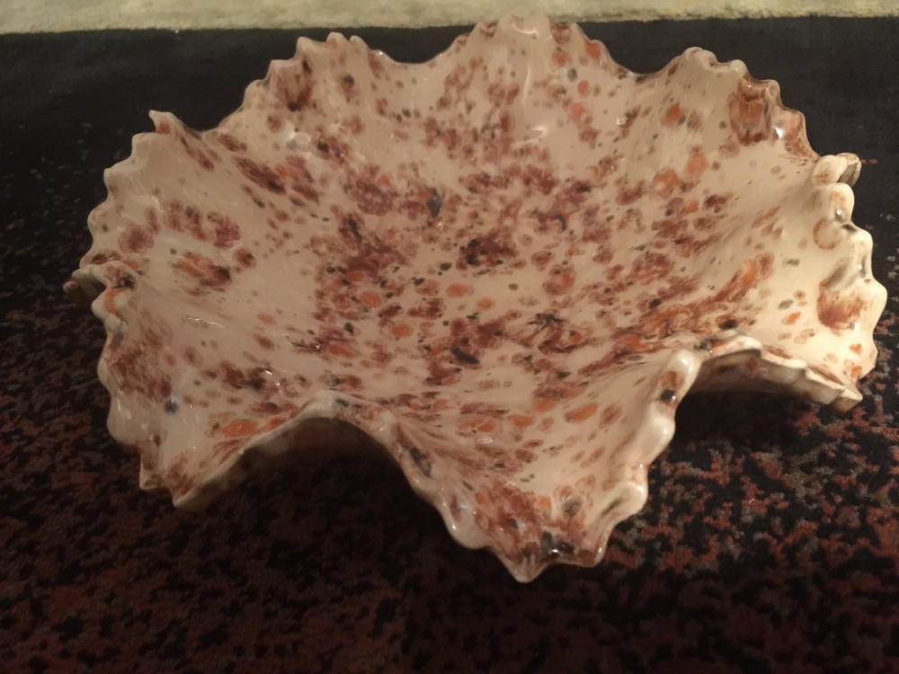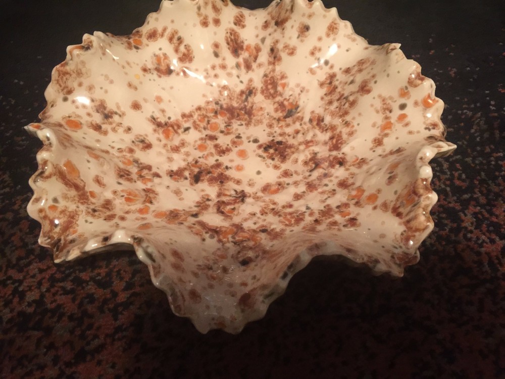 This is an unique pinched edges bowl or candy dish. Bowl is older and handmade. The bottom has the name Paula and Mother carved on the bottom. Bowl is in good used condition. There is an underside chip on one edge that is pointed out in the pictures and some signs of normal wear. The bowl is beige with splashes of orange, brown and olive green throughout. Measures about 8-1/2" wide. Please see all pictures as they give an accurate description of the items condition. Ask any questions prior to purchase as this is an as is sale with no returns. Thanks for looking!