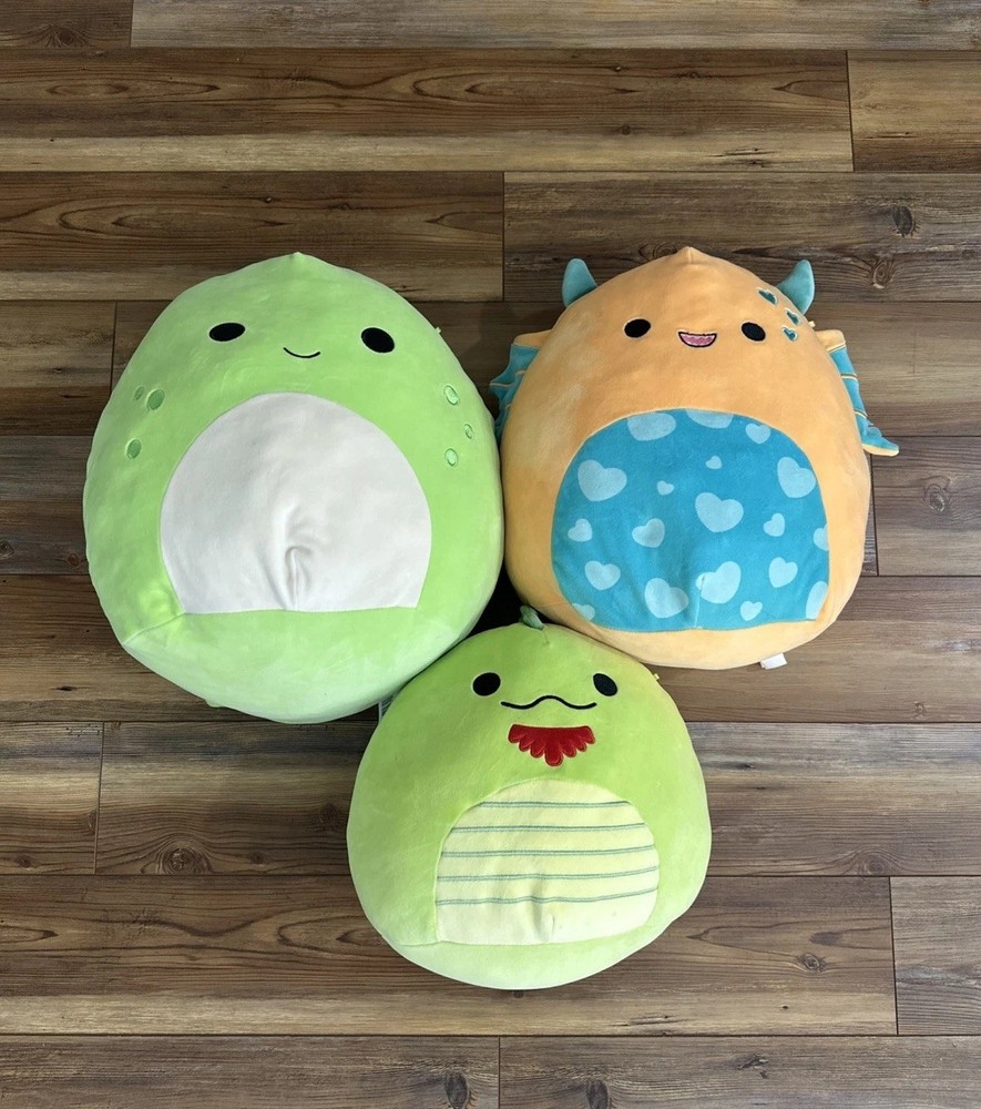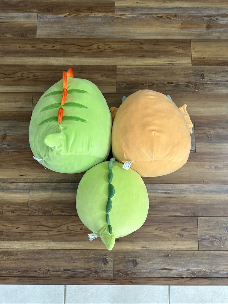 The product is a set of three Squishmallows plush toys in the form of a dinosaur, iguana. These small size toys are green in color and perfect for collectors or children who love stuffed animals. The Squishmallows brand is known for its high-quality and adorable plush toys, making this set a delightful addition to any collection or playtime.