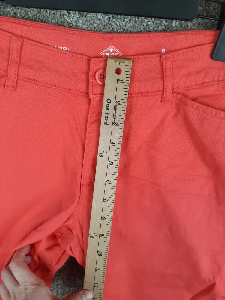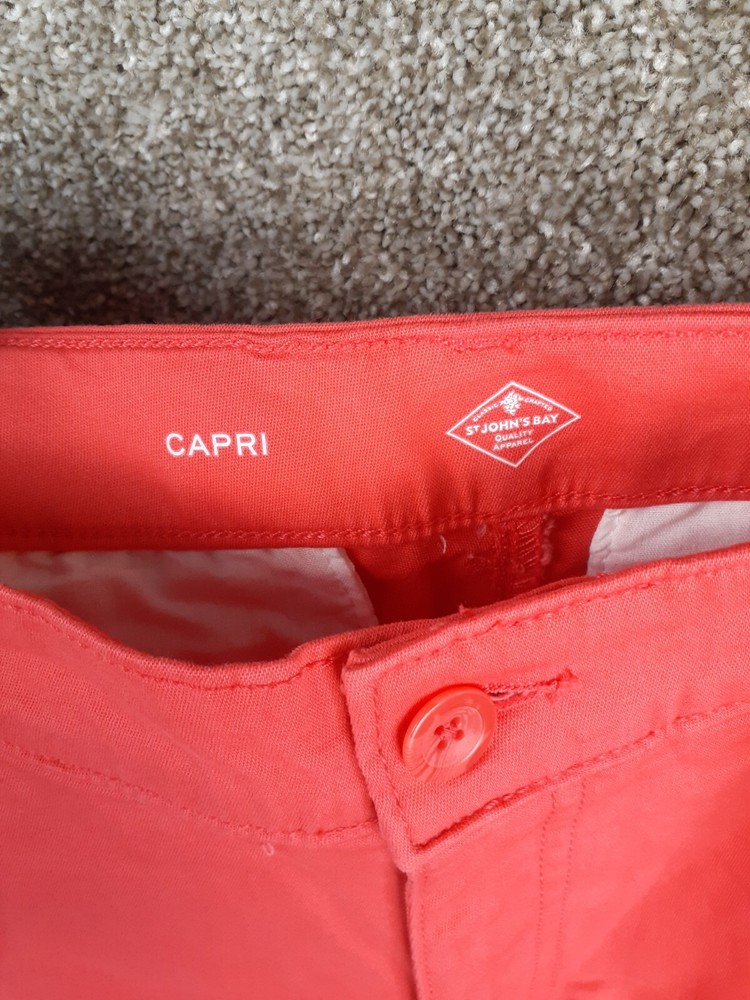 St Johns Bay Capri Pant Womens 8P Orange Coral Mid Rise Pockets Casual Stretch - See photos for measurements. Preowned and in good gently used condition with no major flaws such as rips, tears, or stains. From a smoke-free home. I combine shipping for orders with multiple items.