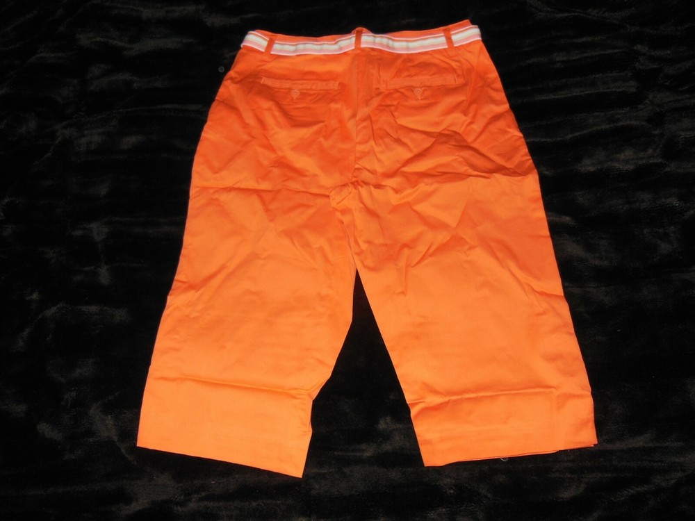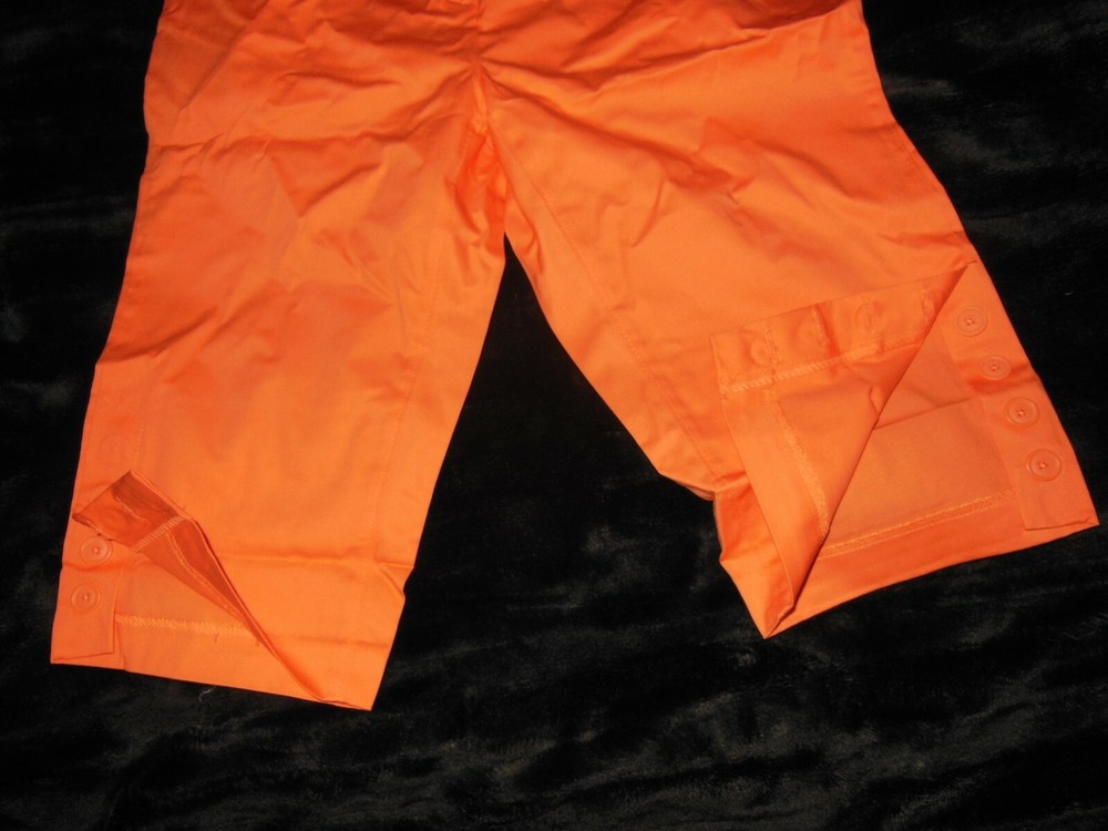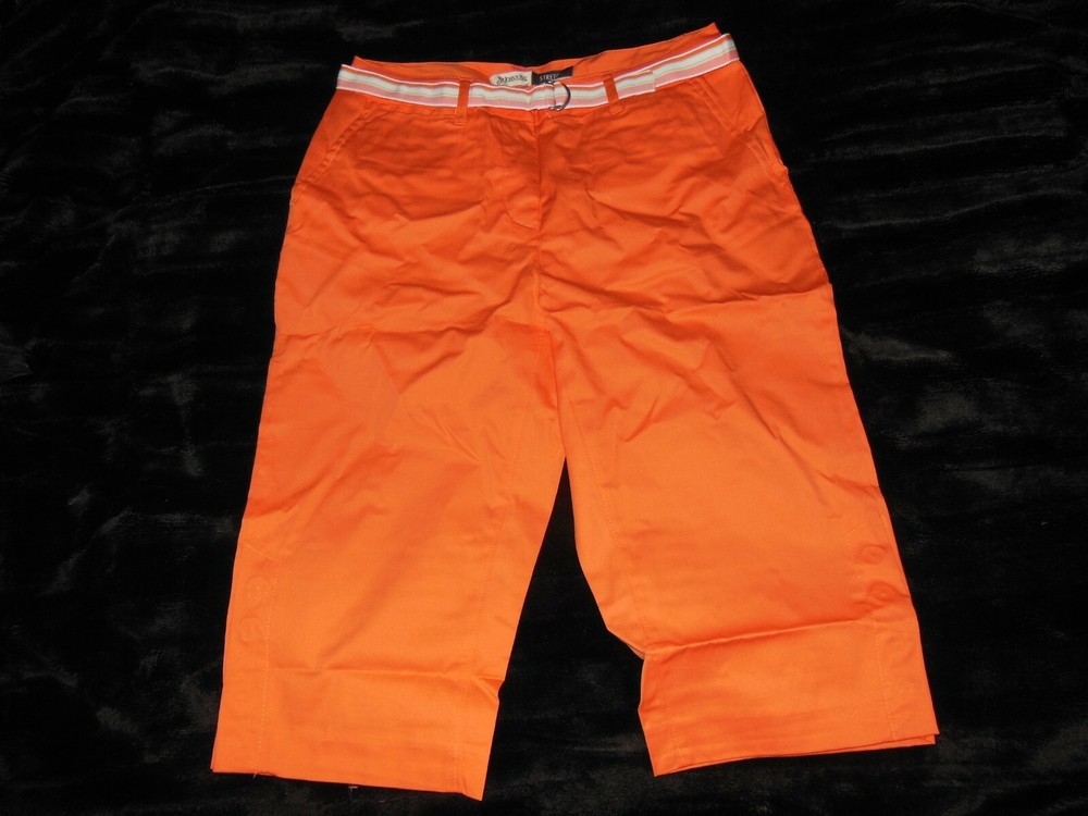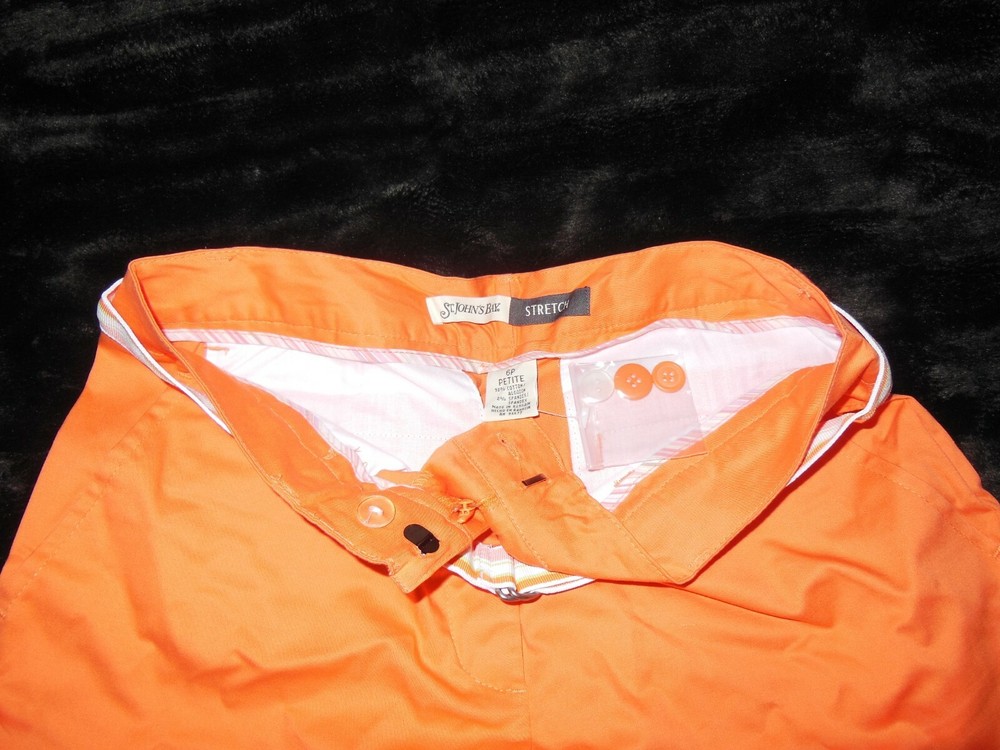 Up for your consideration St. John's Bay comfort stretch Capri crop pants size 6 petite new without tag in orange, with 2 front pockets, 2 button close back pockets, extra buttons, 4 button up split on leg side, sits slightly above waist,12" rise from waistline, zip front, belt loops with included cloth buckle belt. Waist measure 15" across, 19" across hips and measures 26" from waist down, inseam 16" long. This 98% cotton, 2% spandex, comfortable unique design is no longer sold so do not let it get away! Please look at all the pictures for more details. Please check out the other items up for consideration. Some are new and like new, and collectibles. We do not offer junk, dust, smoke or pet hair and pack each item with special care, so bid with confidence. Please feel free to ask questions before you bid. Thanks for looking! Payment is due within seven (7) days from the date the auction ends.