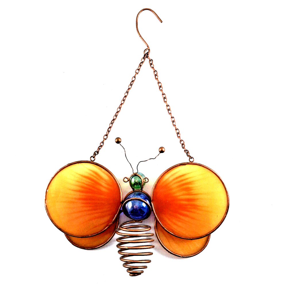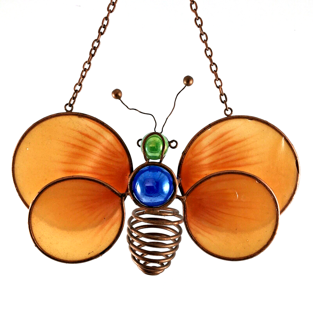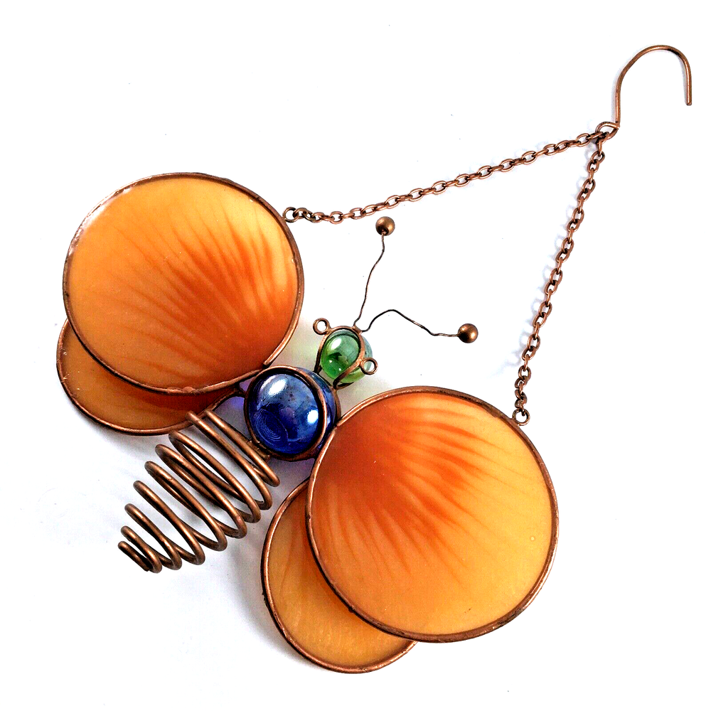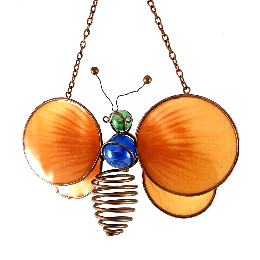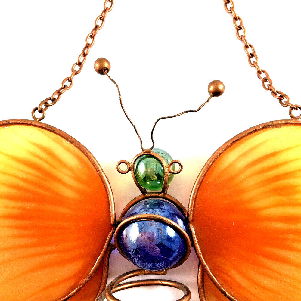 Stained Glass Orange Winged Butterfly Window Suncatcher with Marbles and Copper Wire Body In great condition. No cracks or chips. Measures 6 1/2" wide x 4" plus 6" copper chain and hook hanger. Ships with USPS Ground Advantage or Priority Mail. Your choice! I ship same day or by next day!
