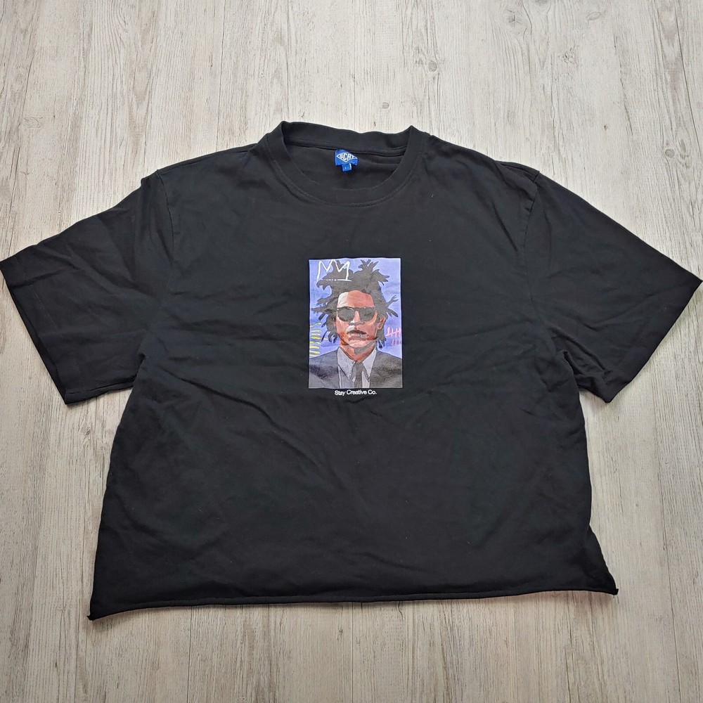 Black graphic tee by Stay Creative Co. featuring a bold portrait-style print inspired by Jean-Michel Basquiat with “Stay Creative Co.” branding. Size XL; 100% cotton; designed in the UK, made in Turkey; see tag for care details. Measurements: Neck to hem: 56.5 cm Pit to pit: 56.5 cm Pre-owned in great condition, soft fabric and vivid print. Perfect for streetwear lovers, artists, or fans of iconic modern art. #StayCreativeCo #BasquiatInspired #StreetwearStyle #UnisexFashion #ArtTee Measurements: The approximately on the photos in cm on a flat lay in the following order: Length (top to bottom) Width (armpit to armpit) ⚠️ Please be aware that these items may exhibit signs of wear, distress, fading, or discoloration & staining. Some pieces may have holes, rips, pilling, or other flaws. Ask questions and view all photos.