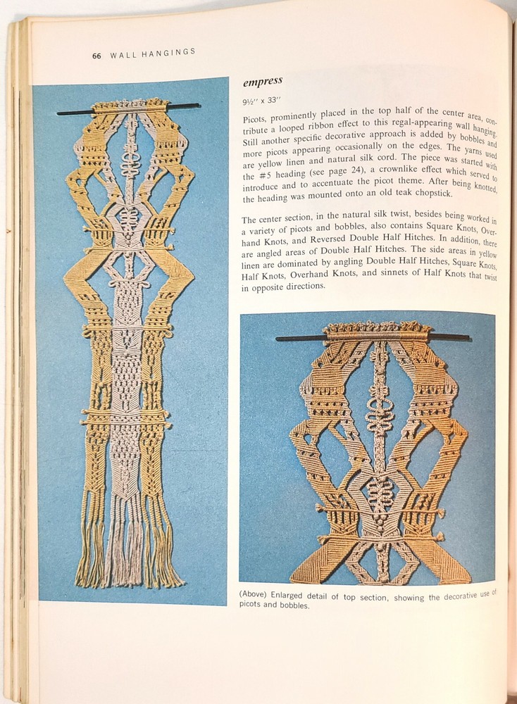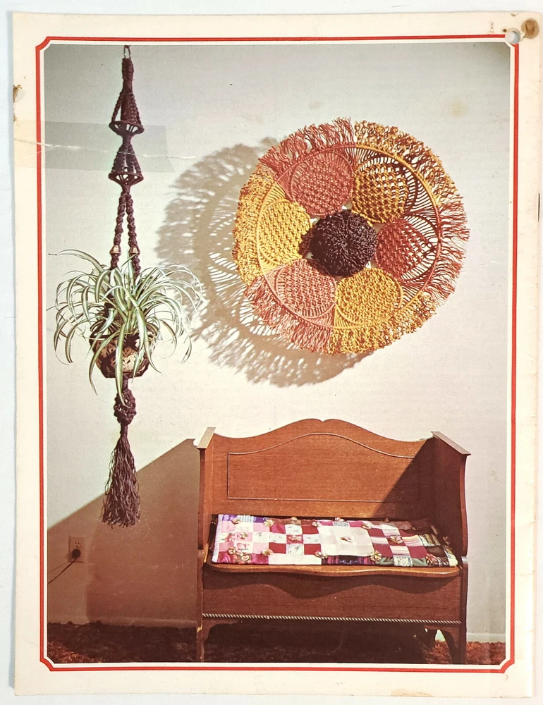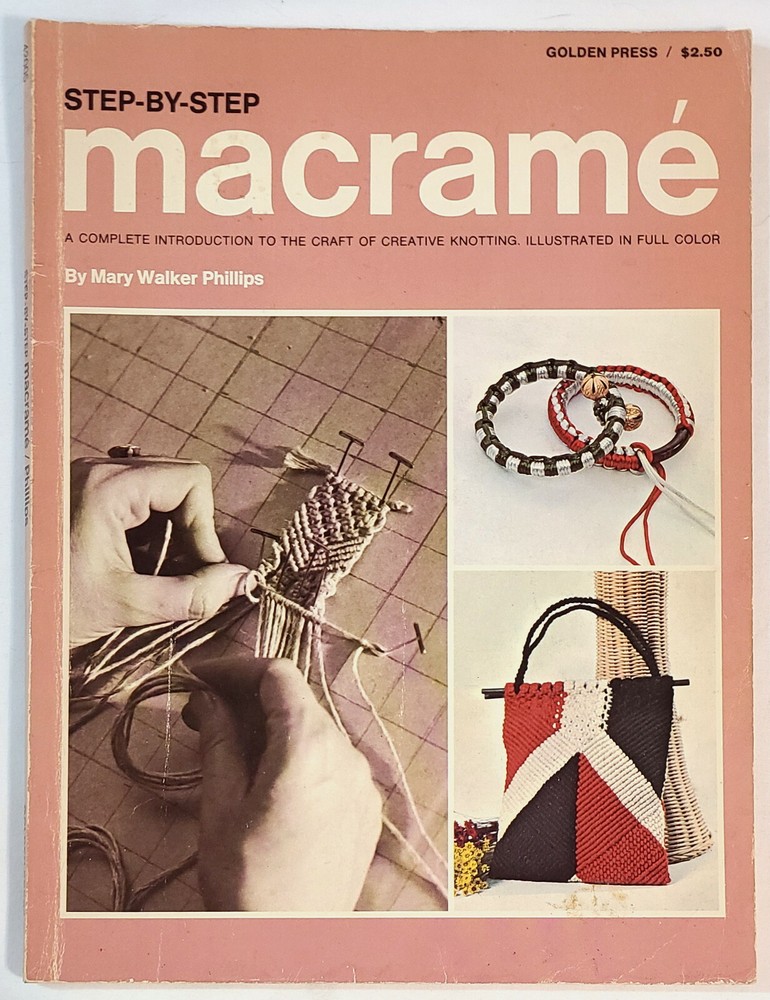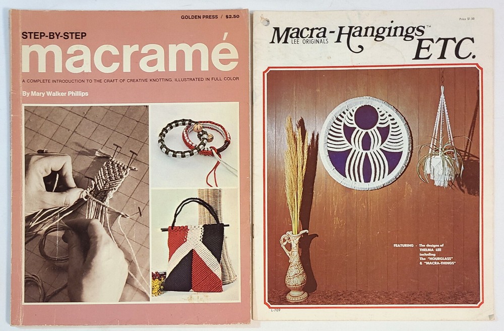 Two vintage macrame pattern books with a variety of projects - plant hangers, wall hangings, purses, belts, household items, and more. Detailed instructions and easy-to-follow knot diagrams. “Step-By-Step Macrame,” by Mary Walker Phillips. Western Publishing Company, 1970; paperback, 80 pages, 8-3/8" x 11-1/8". Very good condition; pages are in excellent condition but the cover shows signs of storage and handling. “Macra-Hangings Etc.,” by Thelma Lee. Lee Originals, 1975; paperback, 24 pages, 8-1/2" x 11". Overall in very good condition; pages are in excellent condition, the cover has a hole in the upper left corner and a tape-repaired tear on the back cover along with other signs of storage and handling. This listing is for pattern books, NOT finished items. From a smoke-free environment. All pattern books are SOLD AS IS; NO RETURNS. Please look carefully at all of the pictures, as they are an integral part of description. I have more macrame pattern booklets currently listed. If interested, click on the “Crafts” link under “Categories” to the left of this description. I do combine shipping!