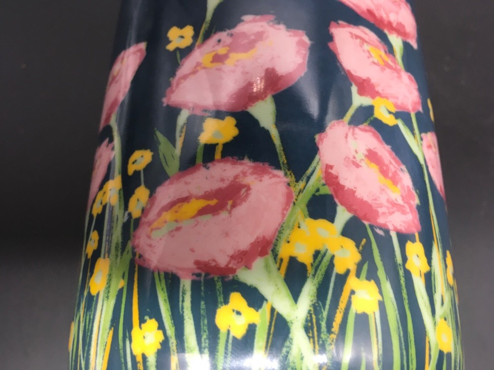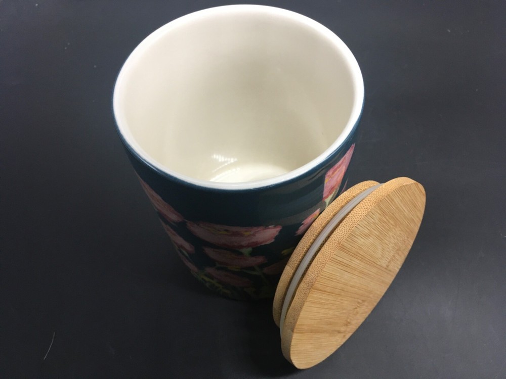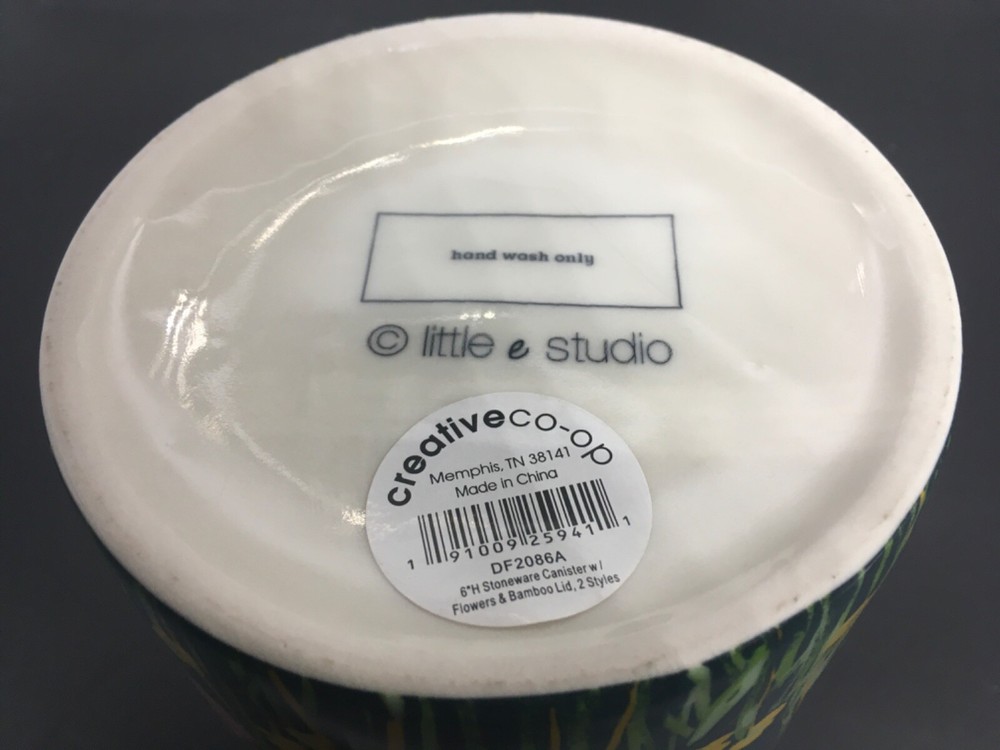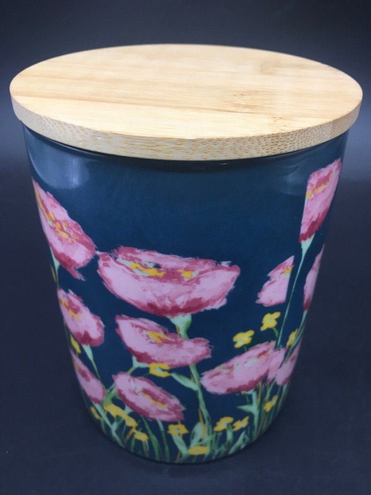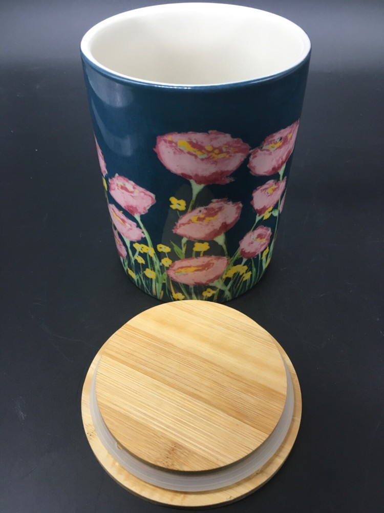 This preowned stoneware 6” canister with bamboo lid is 4” in diameter, has pink and yellow flowers on blue background, and is a design of Creative Co-op Little e Studio. Canister has no chips, no cracks, no discoloration. Canister is a perfect size for candy bars, biscotti, or dog treats. Ships priority USPS.