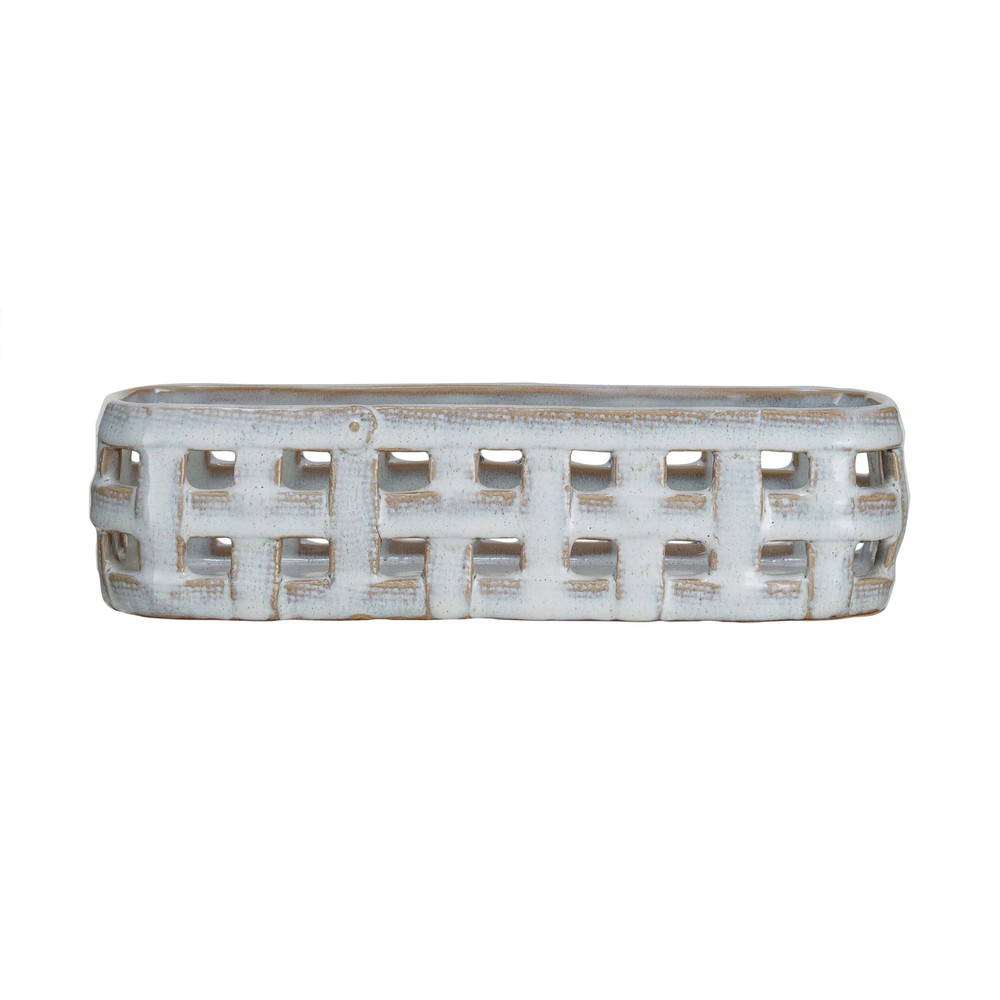 This stoneware basket cracker dish is as functional as it is beautiful. The reactive glaze in white ensures that no dishes are exactly alike, each varying slightly in finish and form. Its dimensions make it a versatile option for serving crackers, bread, or even as a catch-all for keys and trinkets. The dish's basket-like design adds a touch of rustic charm to the serveware collection. The durable stoneware construction also makes it microwave and dishwasher safe for easy cleaning and reheating. Whether used for entertaining guests or simply as a decorative piece, this cracker dish is sure to impress with its unique craftsmanship. A stoneware basket cracker dish that captivates with its reactive glaze, offering a -of-a-kind white finish An elegant serveware piece that effortlessly enhances any table setting with its artisanal appeal This dish is not only perfect for serving crackers but also adds a decorative touch to any countertop or dining area Made of durable stoneware, this dish is a practical yet chic choice for entertaining and everyday use 10" L x 3" W x 2.75" H